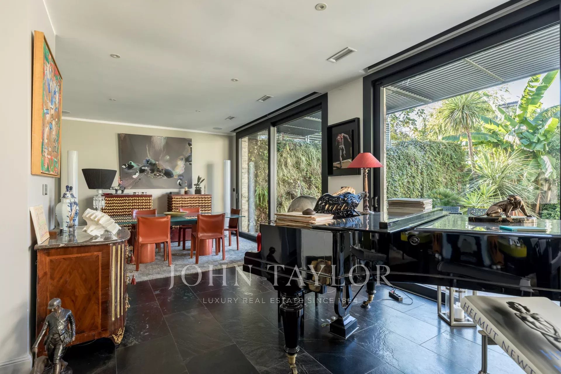 Mélange de verre, d'acier et de matériaux nobles, les lieux dévoilent de beaux espaces de vie et une atmosphère chaleureuse, en parfaite connexion avec la terrasse et cette sublime piscine encapsulée dans une végétation aux airs balinais. Cette composition extérieure a d'ailleurs été primée dans les magazines spécialisés. Depuis le sous-sol où se trouve une salle de sport et un Hammam, un ascenseur distribue les différents niveaux, menant à l'étage principal où la cuisine moderne s'ouvre sur un très grand double séjour avec cheminée et espace cinéma. Vient ensuite l'étage nuit, comprenant 4 belles chambres, 4 salles d'eau, une suite avec dressing et sa terrasse privative. Enfin, un joli bureau avec vue chapeaute le dernier niveau. L'ensemble se déroule sur 450 m2 de luxe et d'élégance tout en détails. Un garage vient compléter avec brio les prestations, faisant de cet habitat un cocon unique.