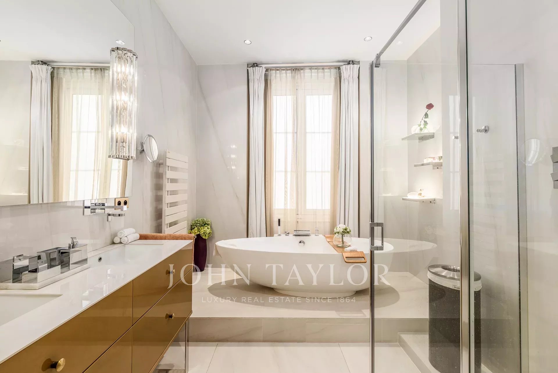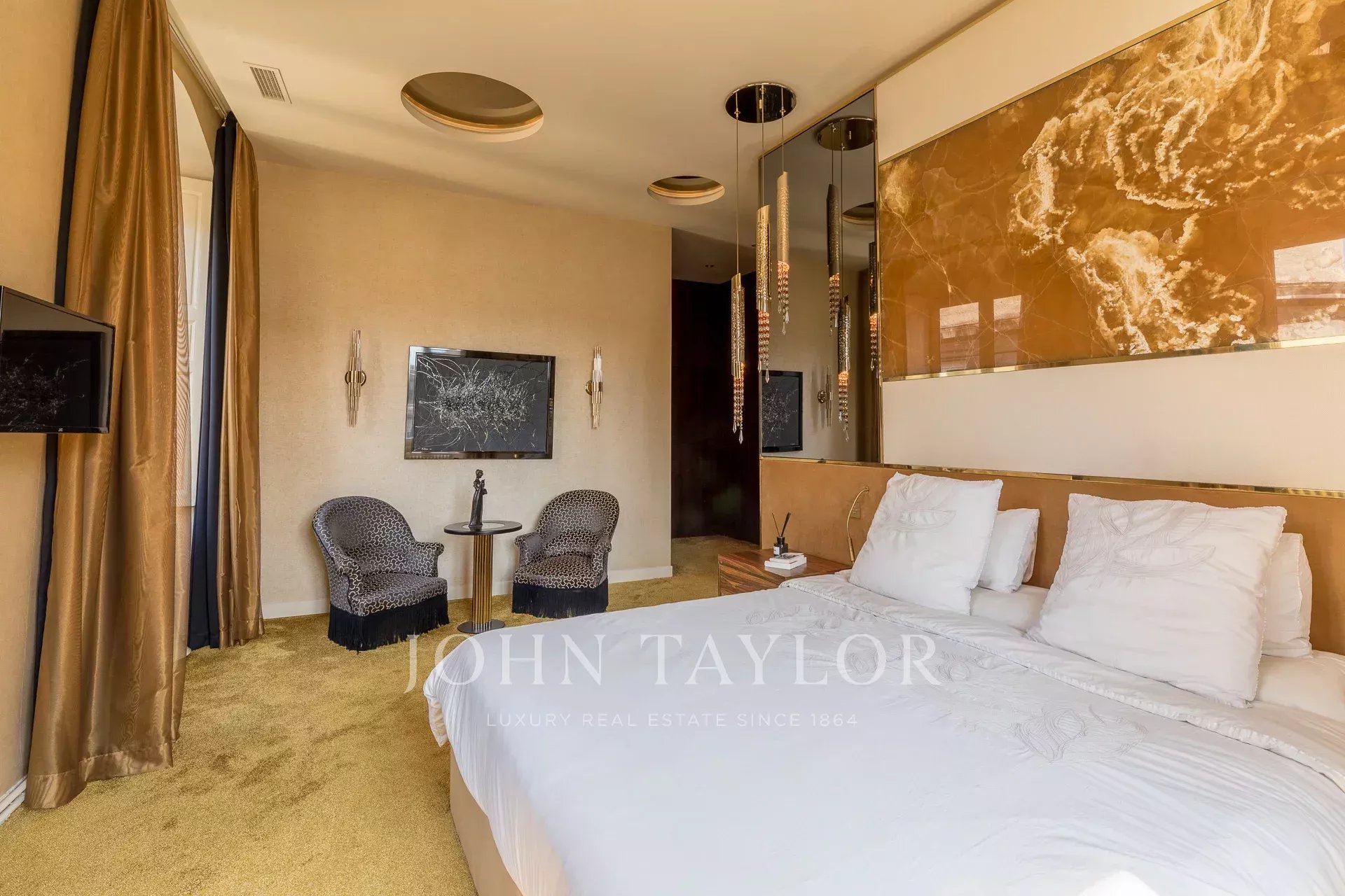 À l’étage supérieur, quatre chambres dont une suite parentale, avec vue sur le monument aux Girondins, complètent cet ensemble d’exception.