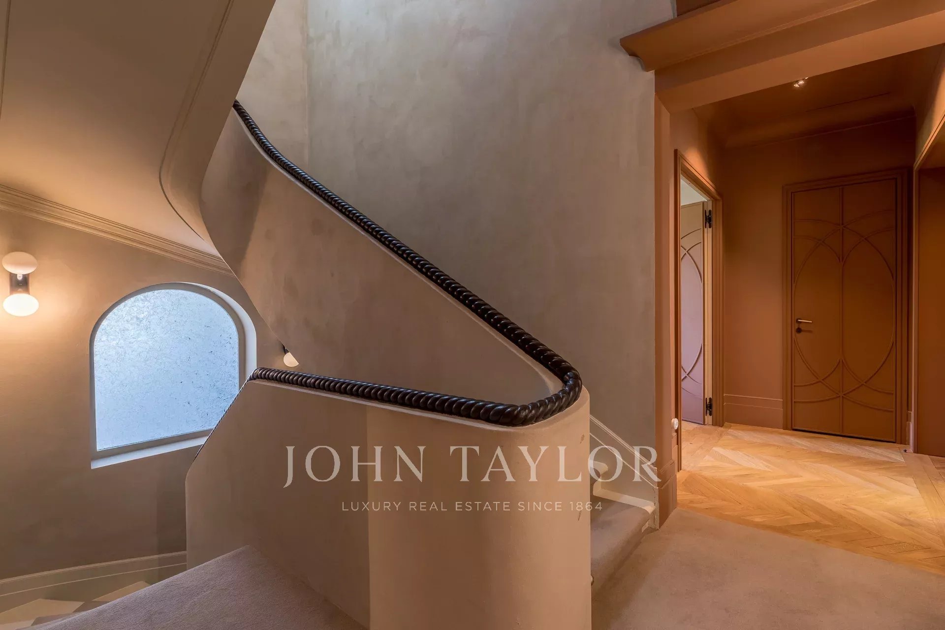 L’escalier sculptural, élément central de la demeure, illustre tout le savoir-faire de cette rénovation et mène aux étages supérieurs.