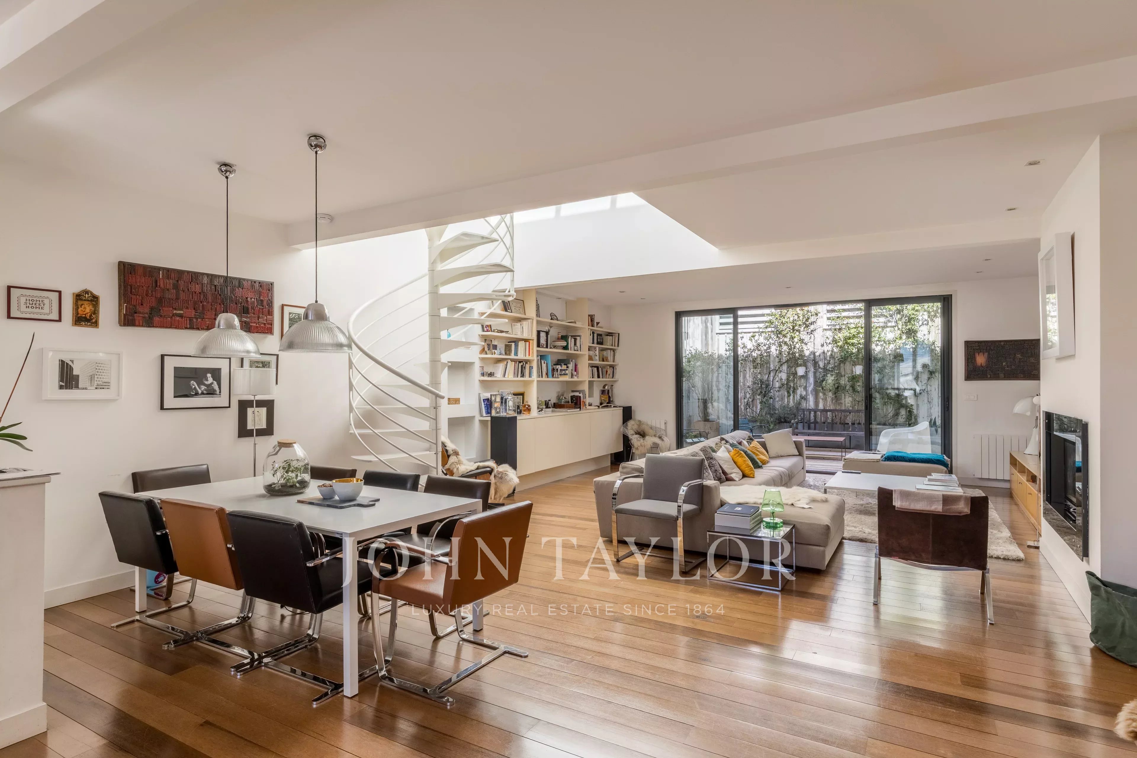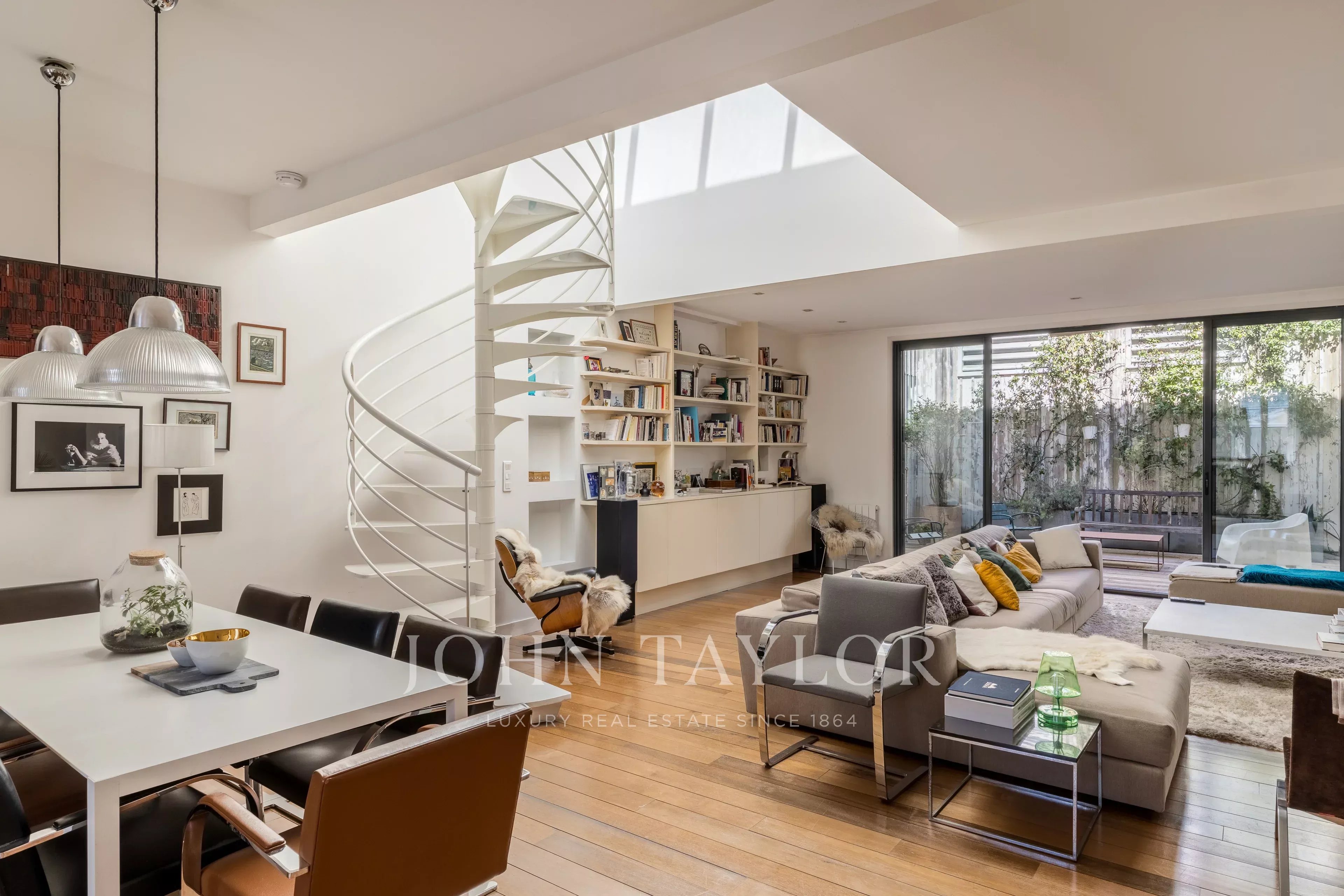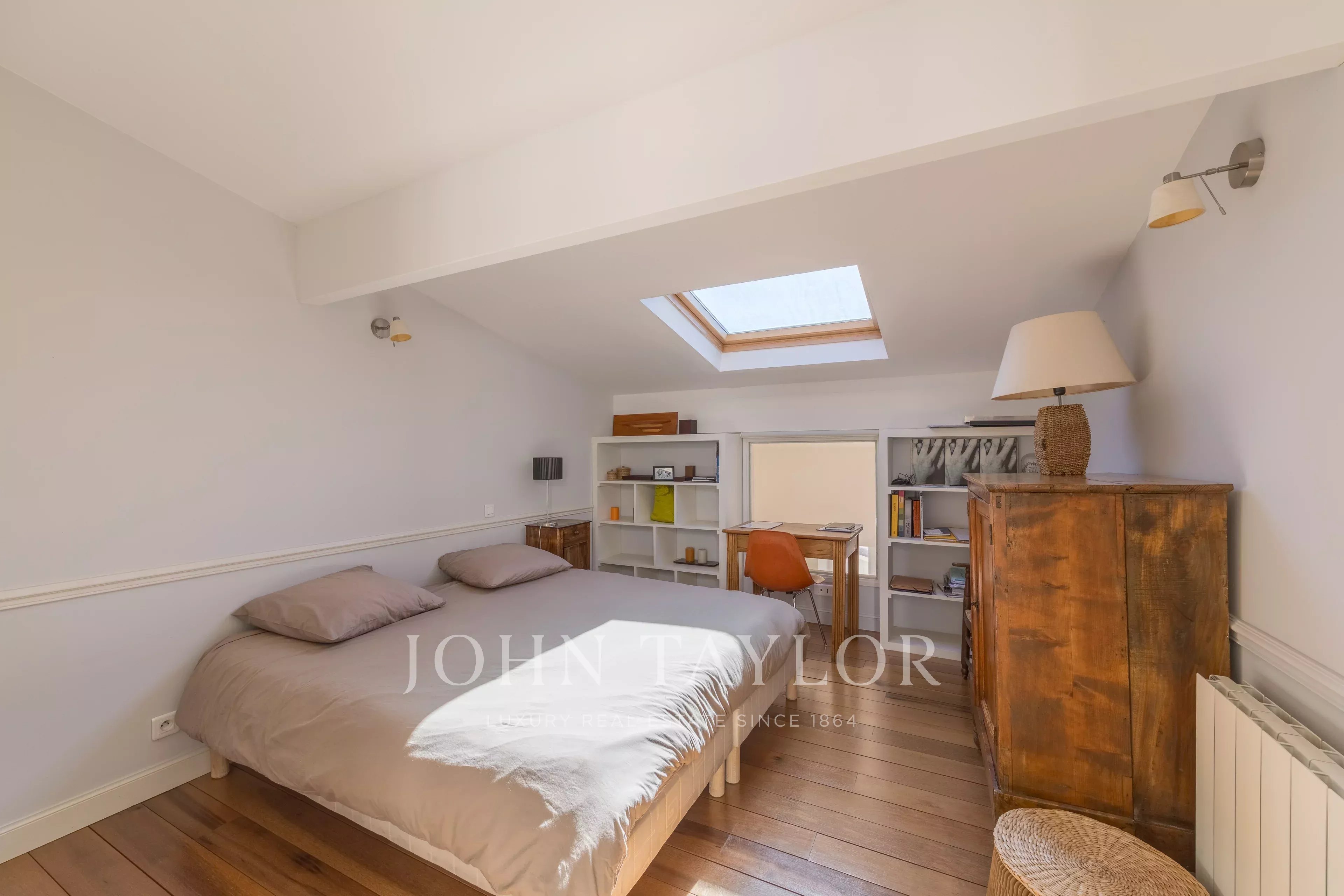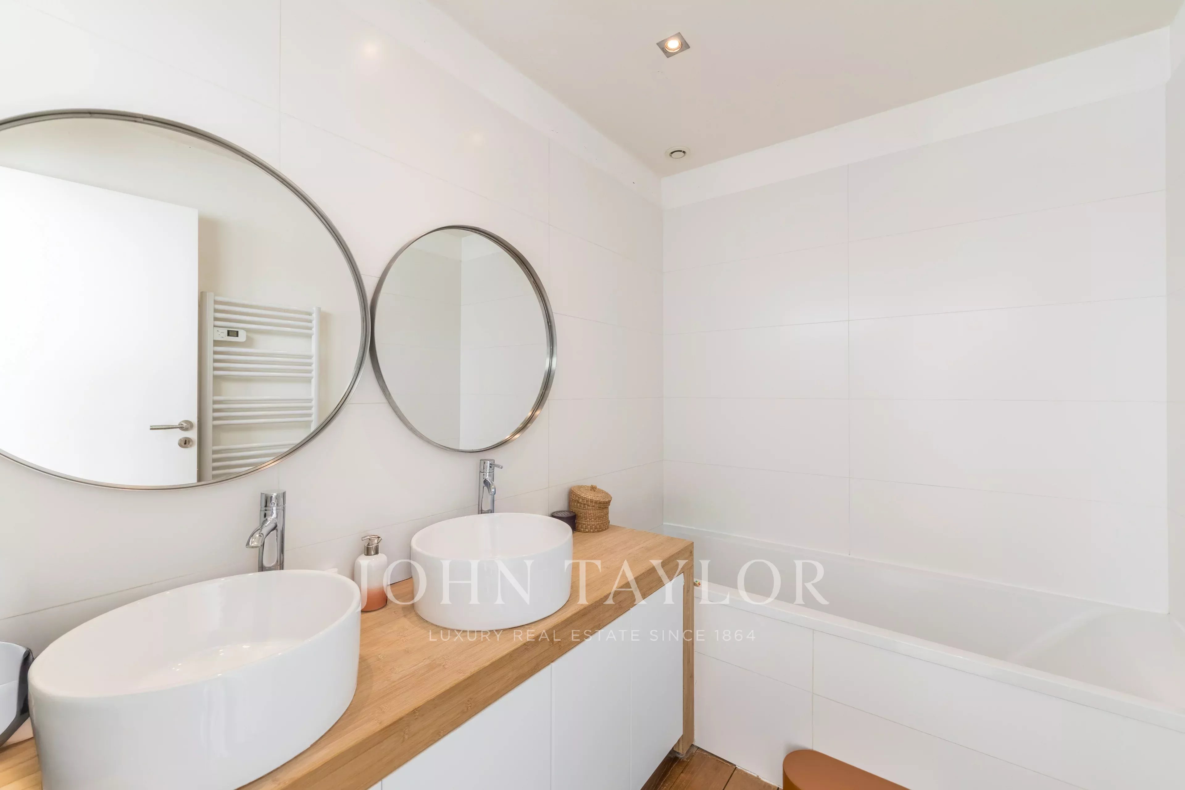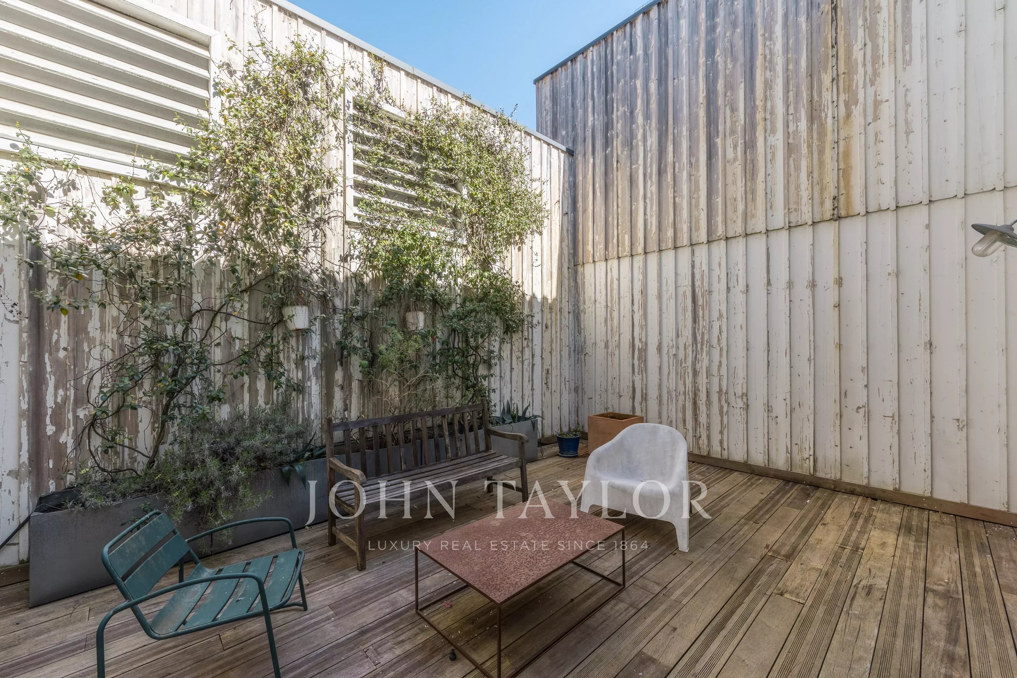 De larges ouvertures plein sud, sans aucun vis-à-vis, prolongent naturellement cet espace de réception, tandis qu’au nord, une terrasse patio intime, également à l’abri des regards, offre un espace extérieur rare et apaisant.