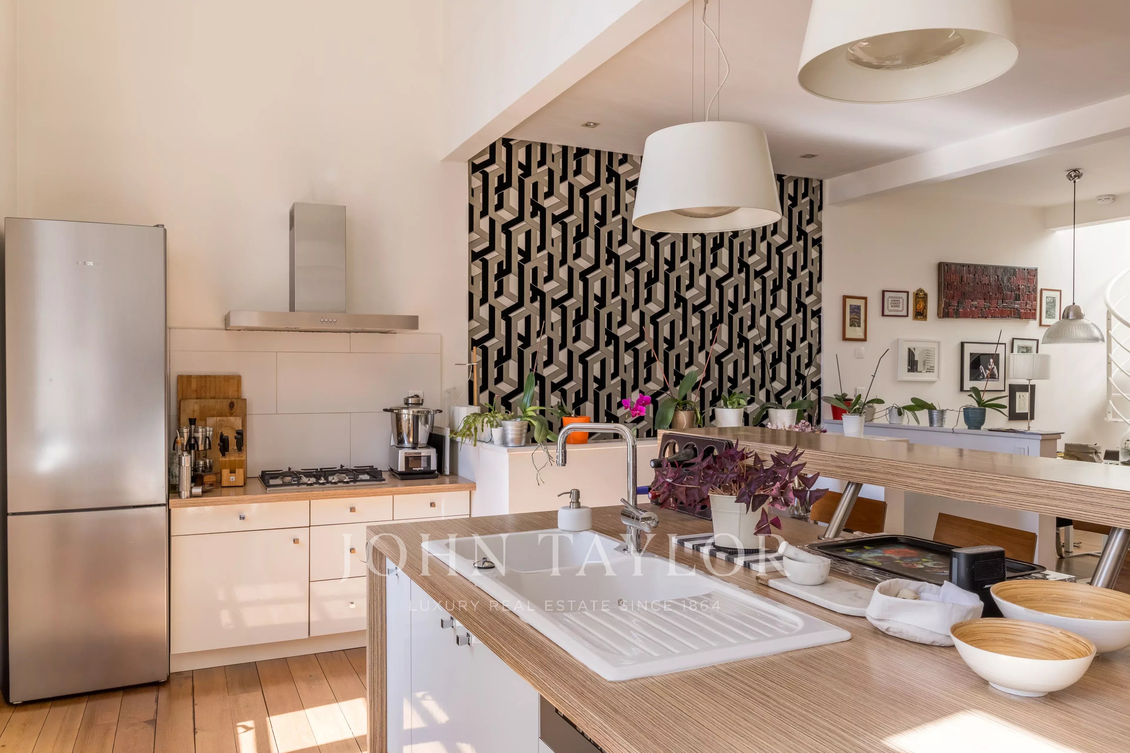 À l’étage, la maison dévoile une somptueuse pièce de vie de 85 m², baignée de lumière grâce à sa double exposition. L’espace, à l’ambiance loft luxueuse et contemporaine, se distingue par une très belle hauteur sous plafond, un parquet exotique massif, une cheminée avec insert, et une cuisine ouverte moderne.