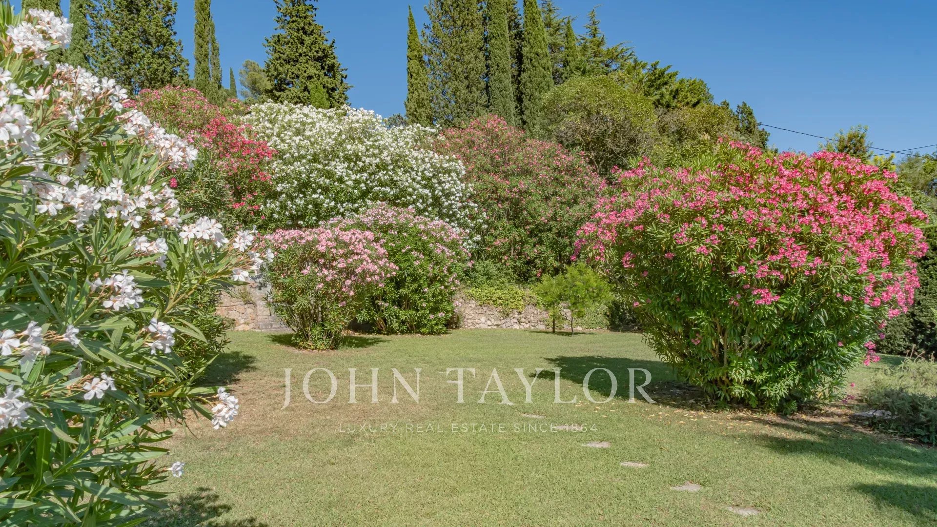 Magnifique jardin arboré et complanté d'oliviers centenaires d'environ 2.950 m2 avec piscine, bassin, triple carport, et grande remise.