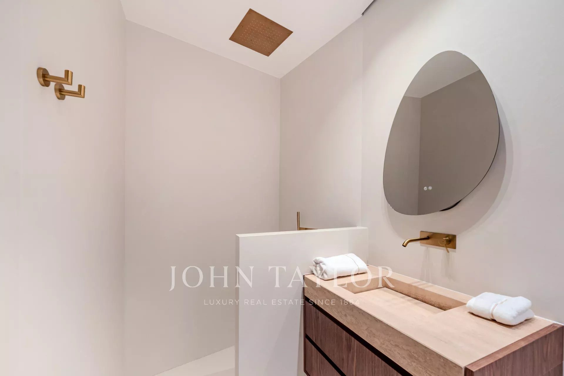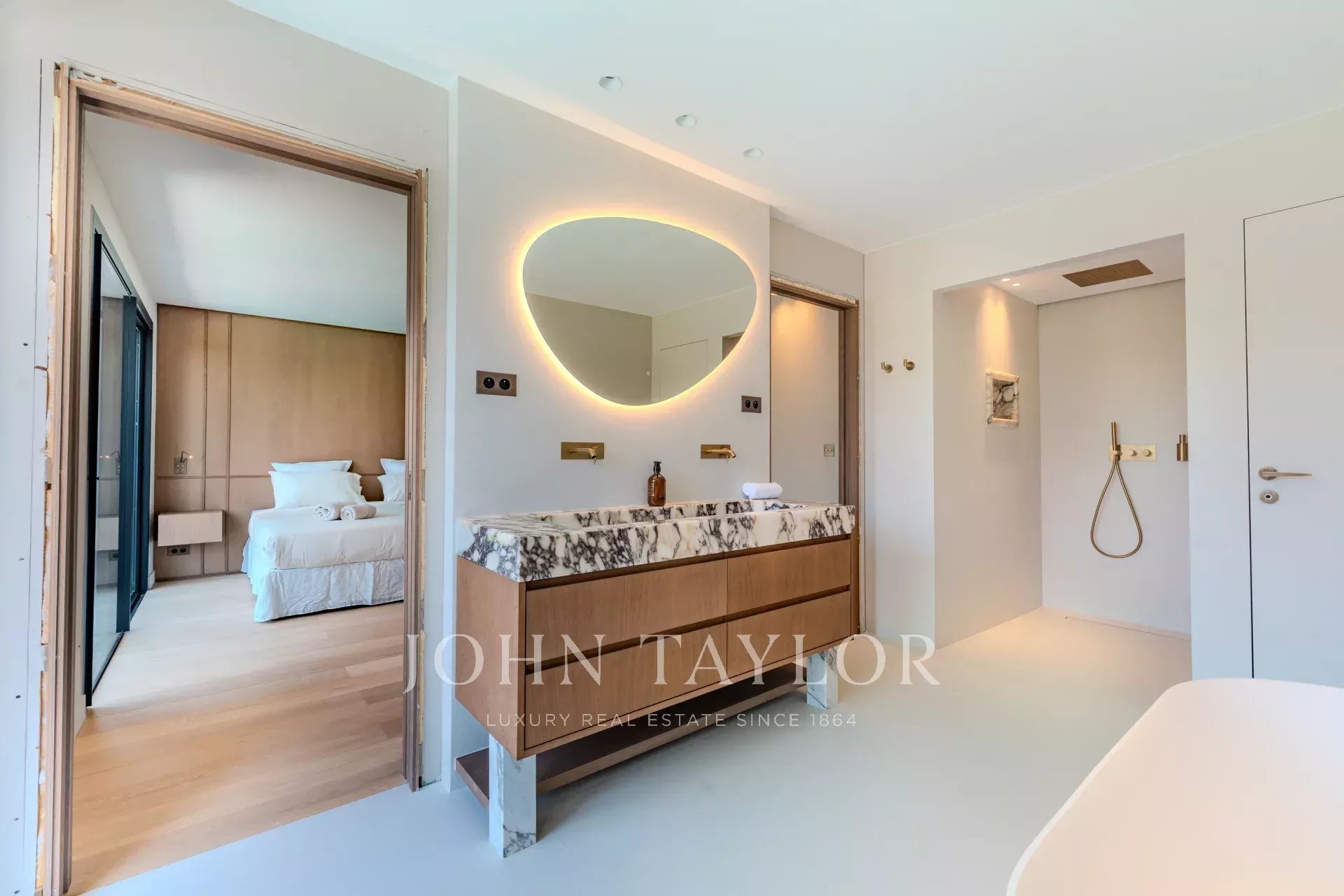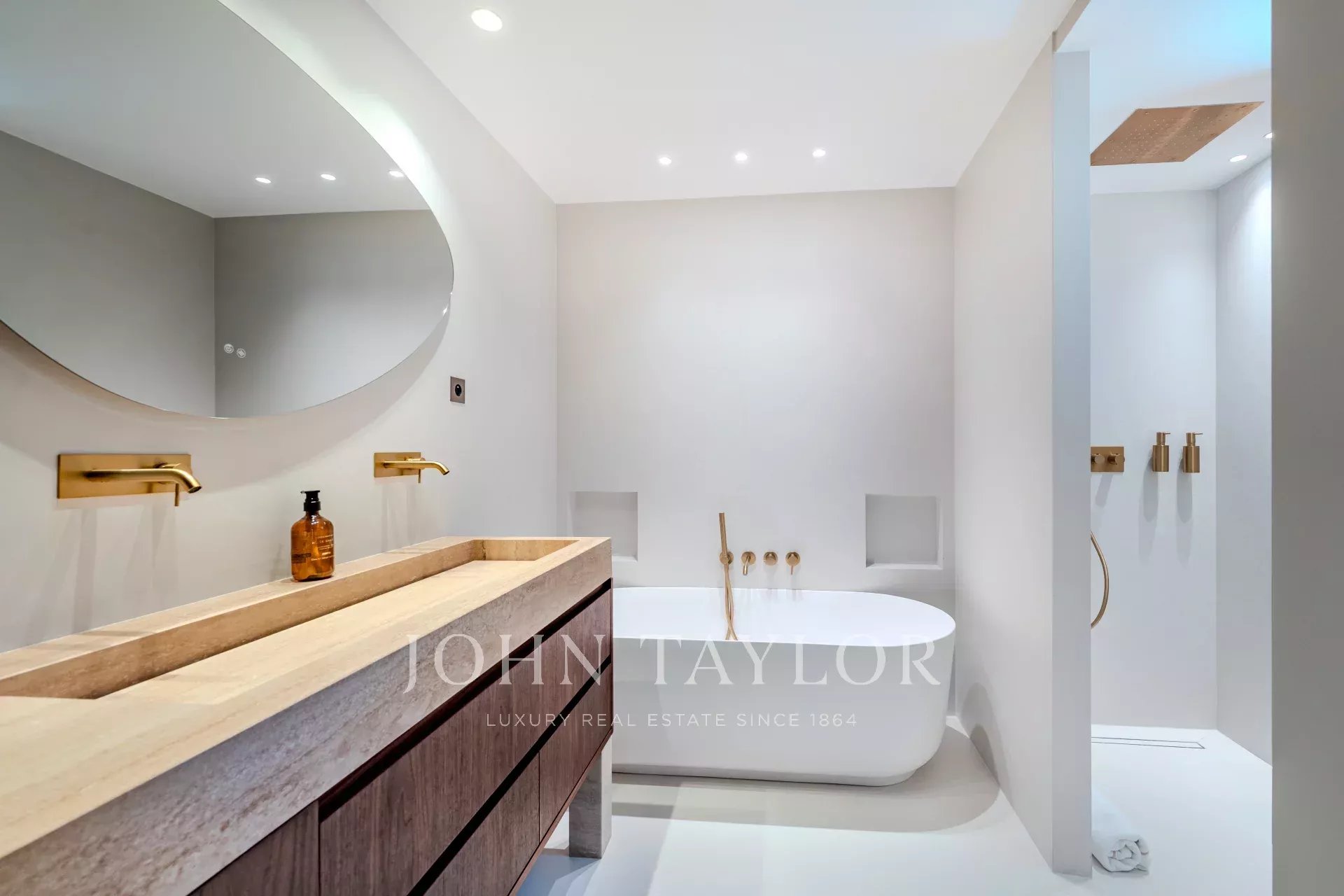 Cinq superbes suites avec dressings sur mesure témoignent d'un travail de menuiserie raffiné. Le tout au cœur d'un jardin paysager avec piscine, vastes terrasses, salle de bains extérieure, cave à vins, buanderie, garage et parking.