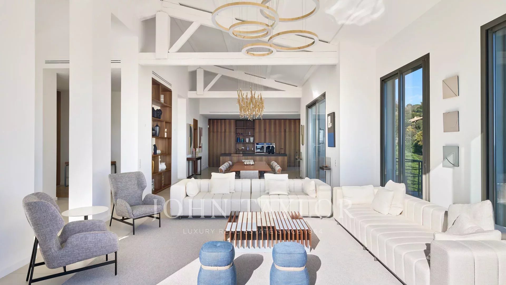 D'une superficie d'environ 500 m², la villa se compose à l'étage d'un hall d'accueil, une vaste pièce de vie comprenant un double séjour, une salle à manger et une cuisine américaine, une chambre en suite, un dressing, salle d'eau et toilettes invités. Au rez-de-jardin, une salle à manger et cuisine américaine, une buanderie et toilettes séparées, trois chambres en suite, une chambre de maîtres.