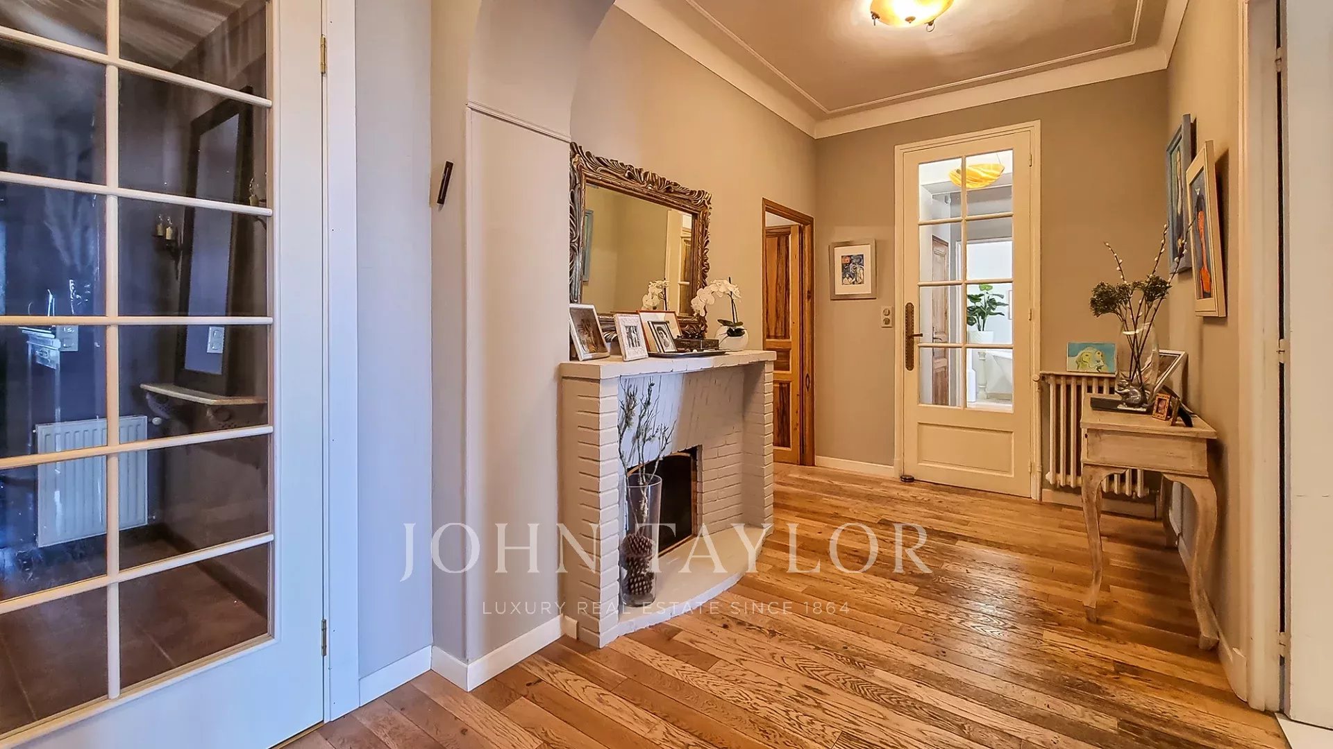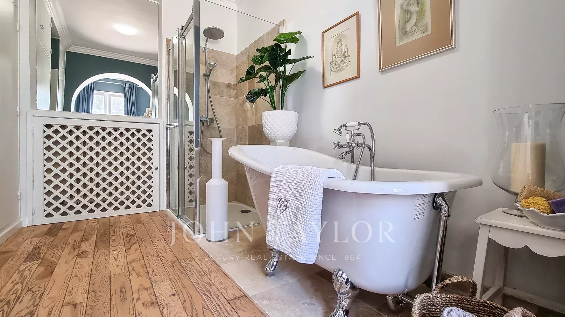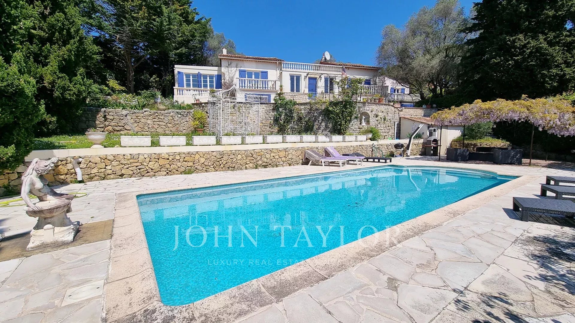 Dans un quartier résidentiel du Cannet, cette ancienne résidence d'un comte russe est située dans un parc privé de 2885 m² environ, planté d'oliviers centenaires, d'arbres fruitiers et d'un jardin floral parfumant les abords d'une magnifique piscine en mosaïque.