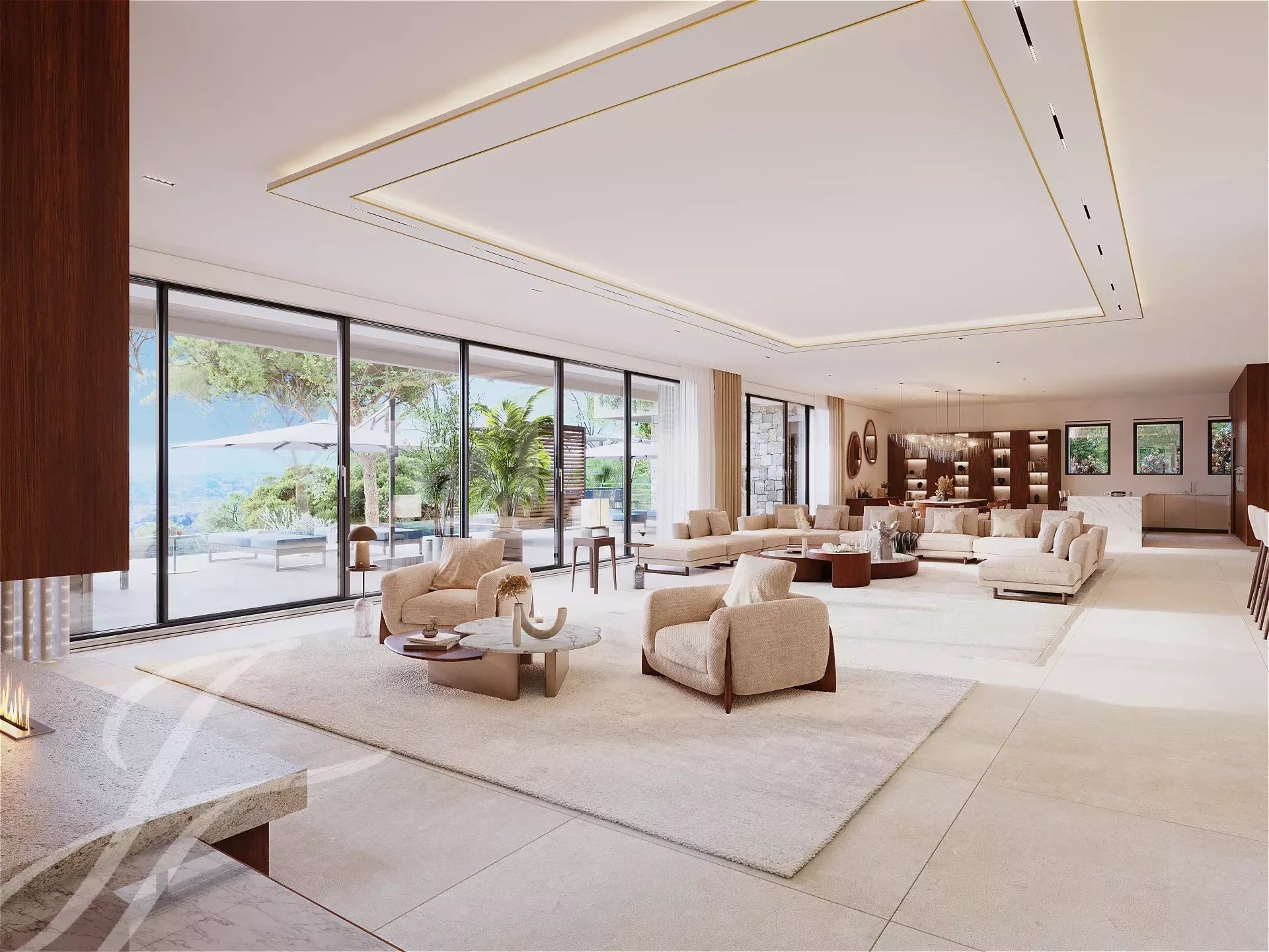Le niveau de vie d'une surface d'environ 327 m² comprend un vaste séjour, salle à manger, cuisine, arrière cuisine, chambre froide, coin bar et cave à vin, vestiaire et toilettes.