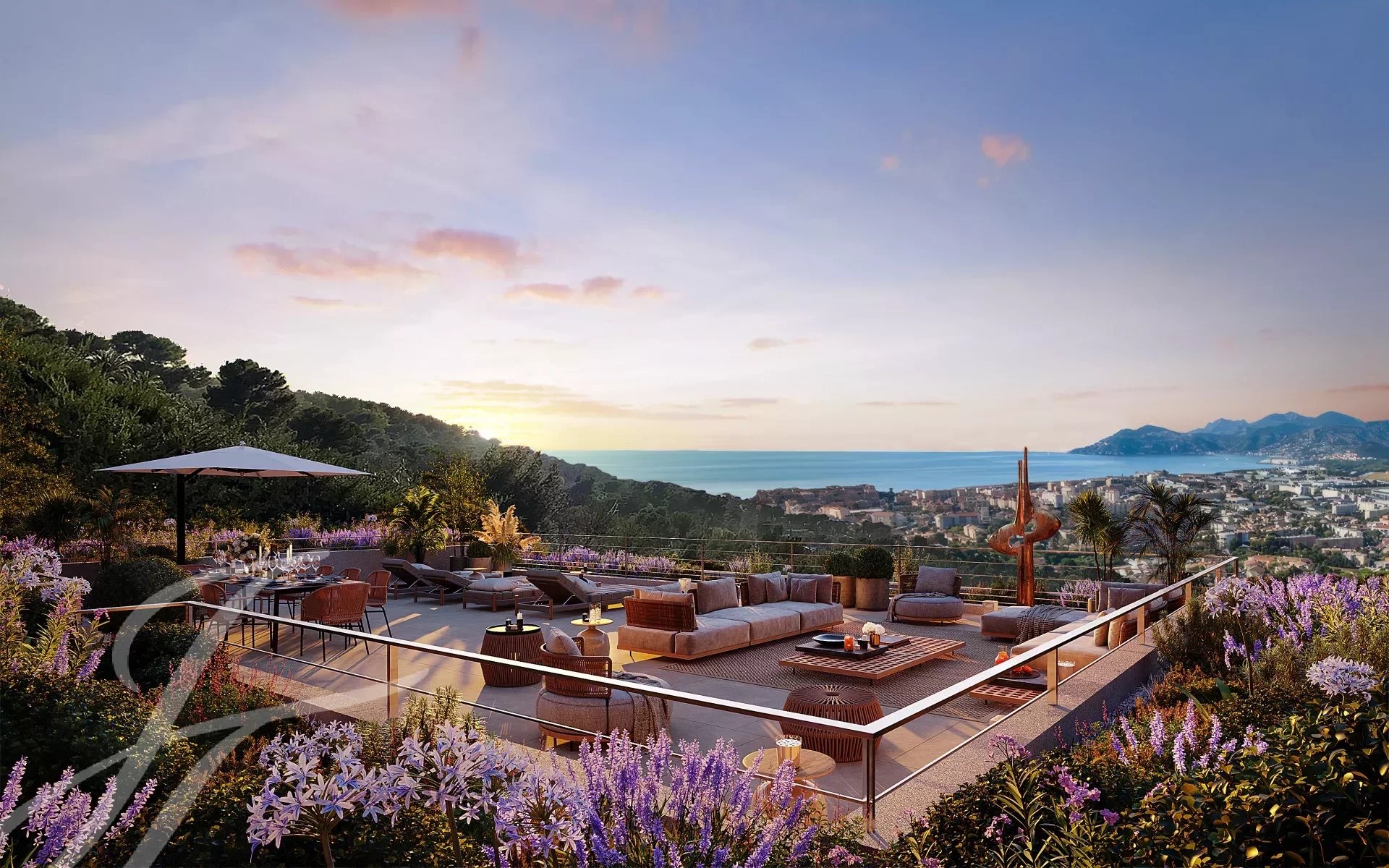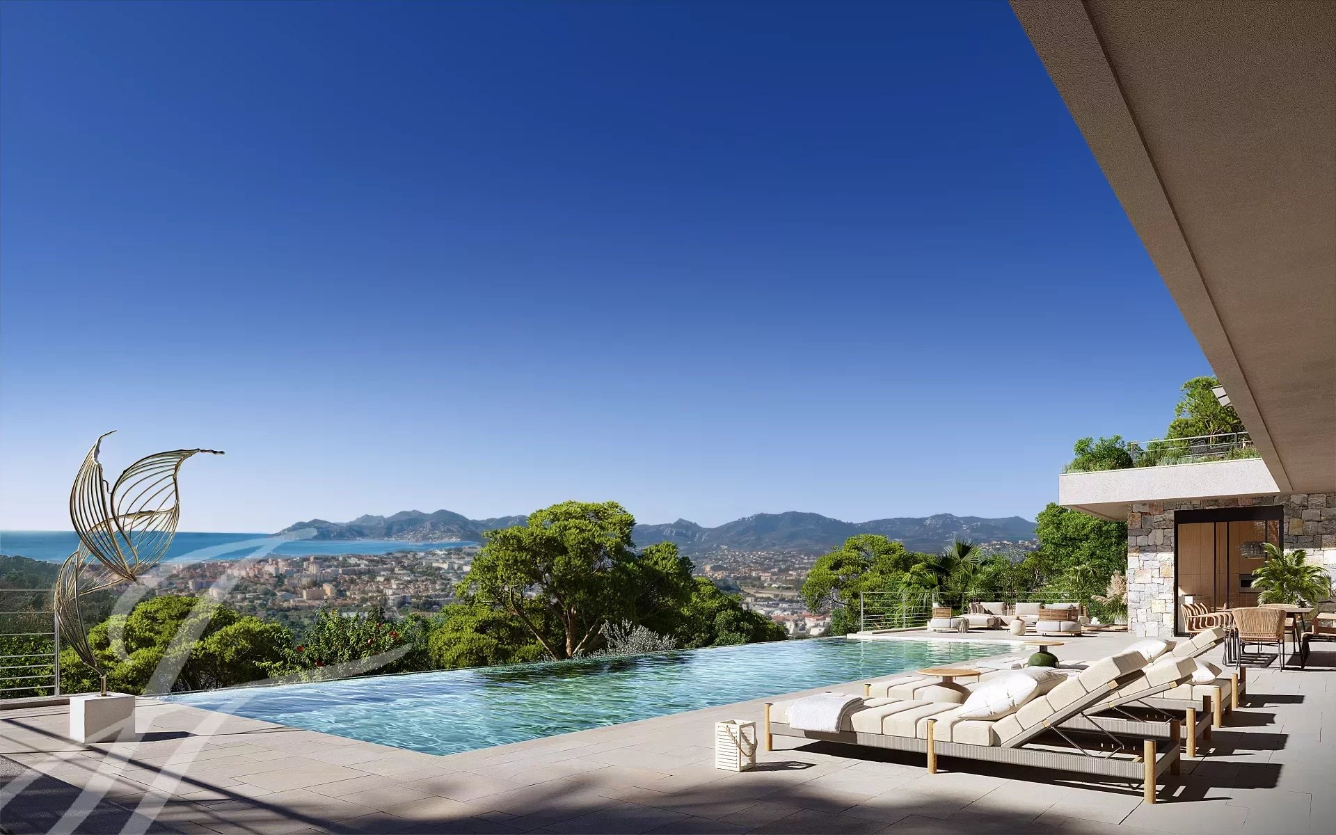 Située dans une impasse privée, cette somptueuse villa contemporaine domine les collines de Cannes et offre un panorama époustouflant sur la mer et les collines de l'Estérel.