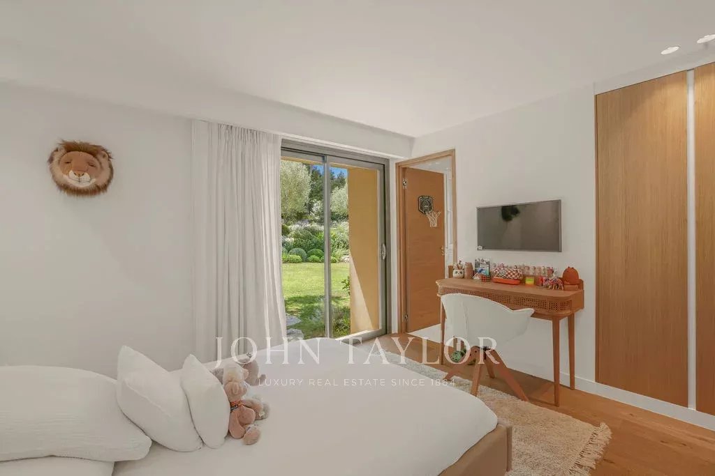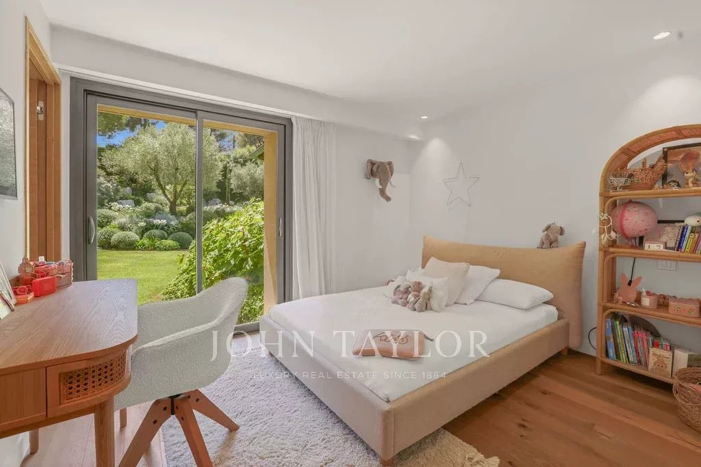 La villa propose quatre chambres de plain-pied, toutes en suite, dont une spacieuse suite parentale avec dressing et salle de bains complète. Une cinquième chambre ainsi qu’une salle de fitness viennent compléter ce bien.