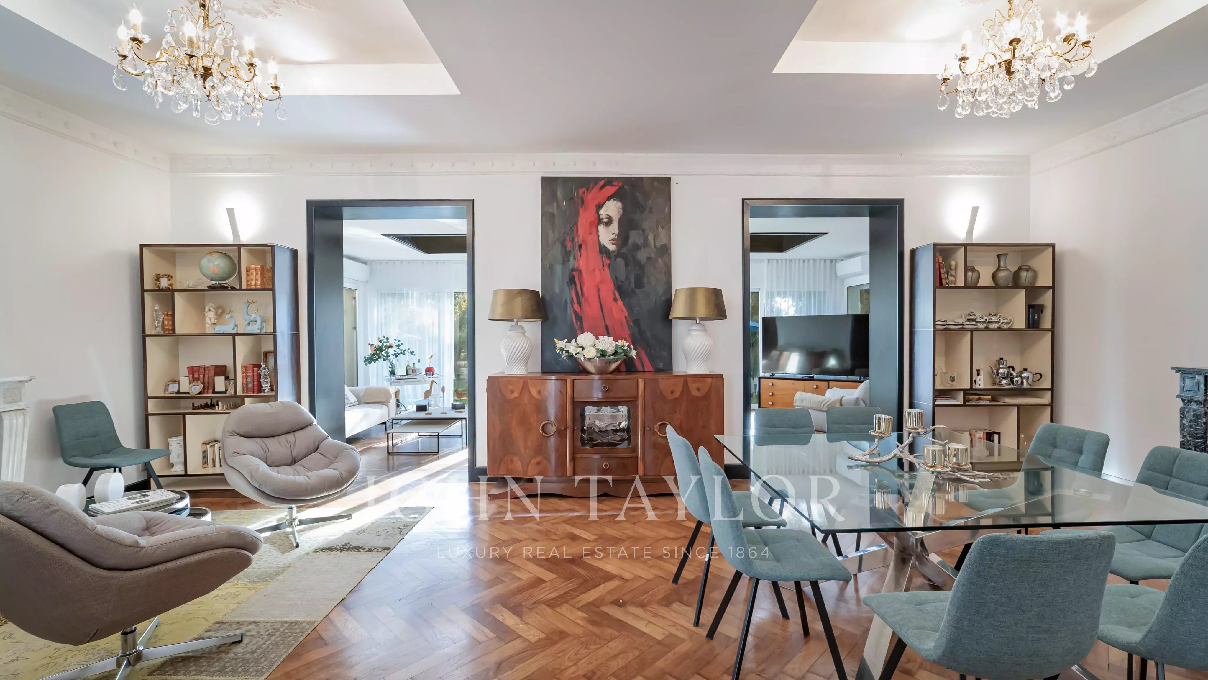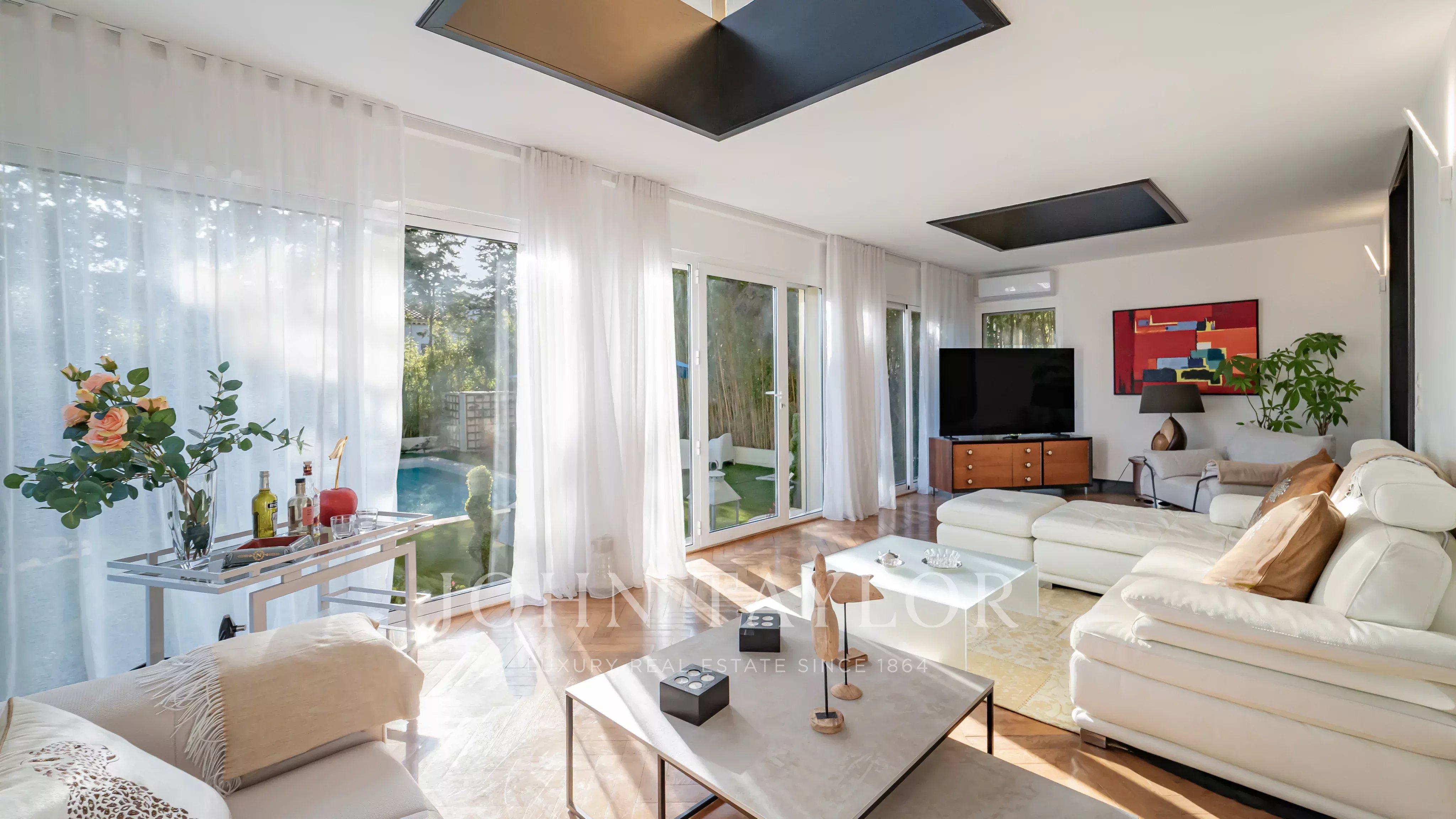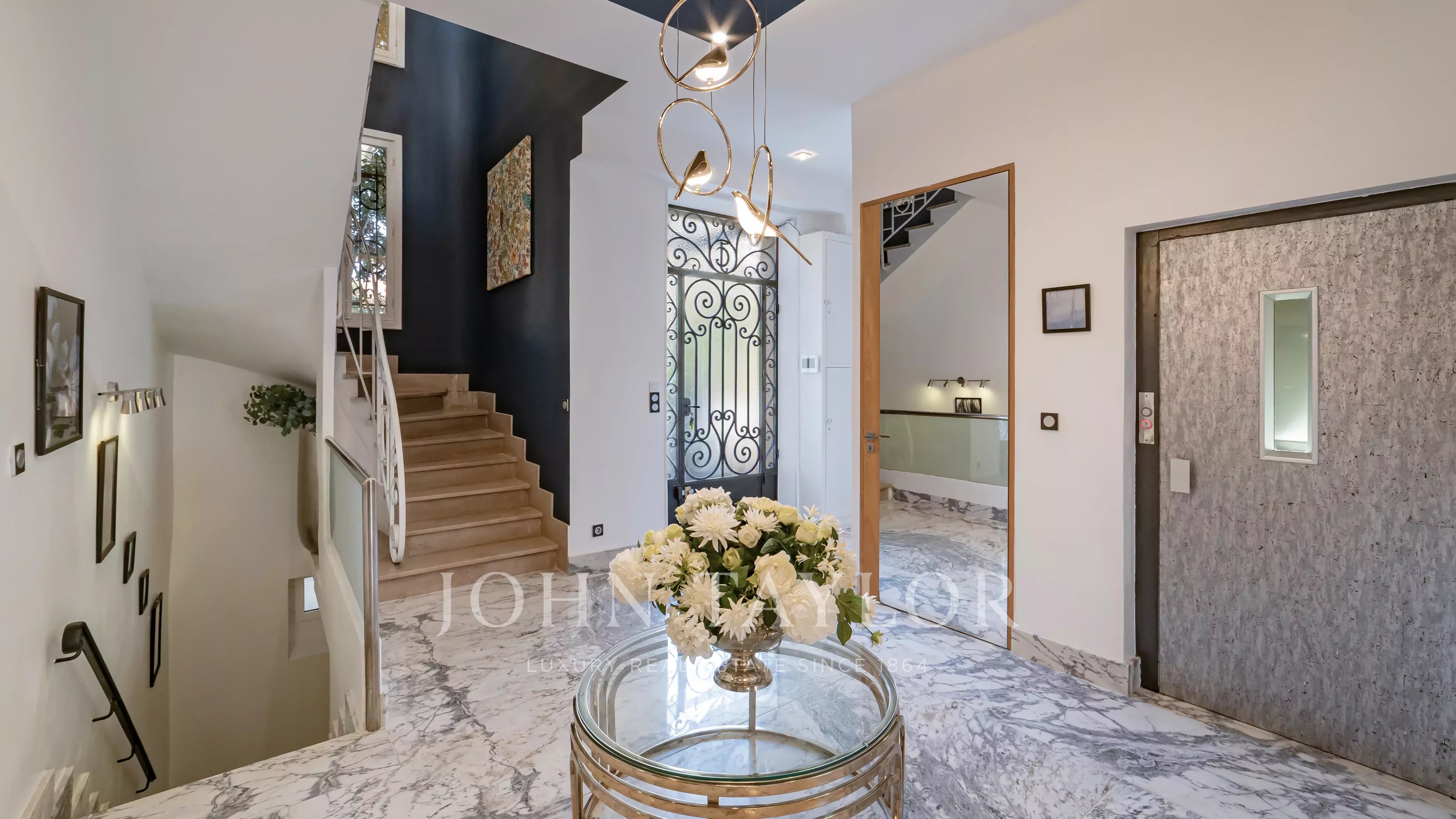 La villa est équipée d’un ascenseur desservant l’ensemble des niveaux. Elle s’ouvre sur une entrée menant à un vaste double séjour de 68 m², agrémenté d’une cheminée et d’un parquet ancien entièrement rénové. La cuisine, aux prestations haut de gamme, s’intègre harmonieusement à l’espace de vie.