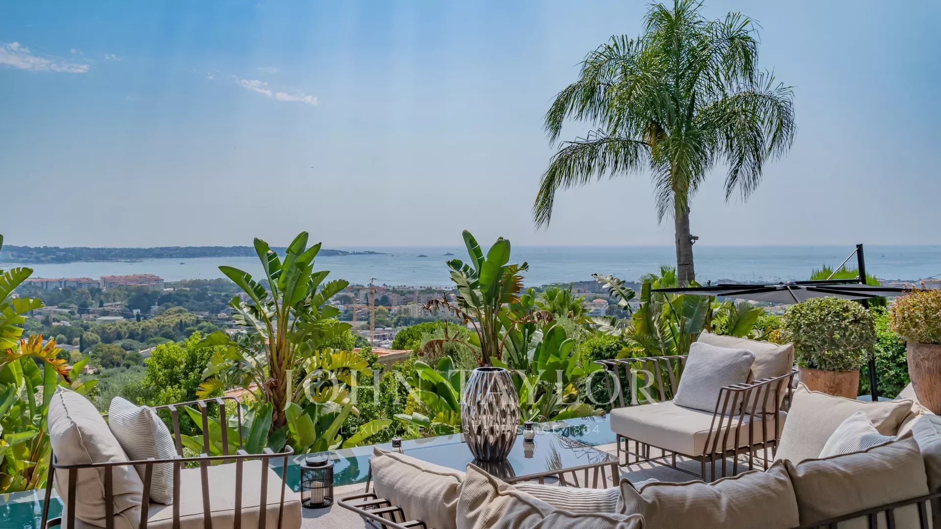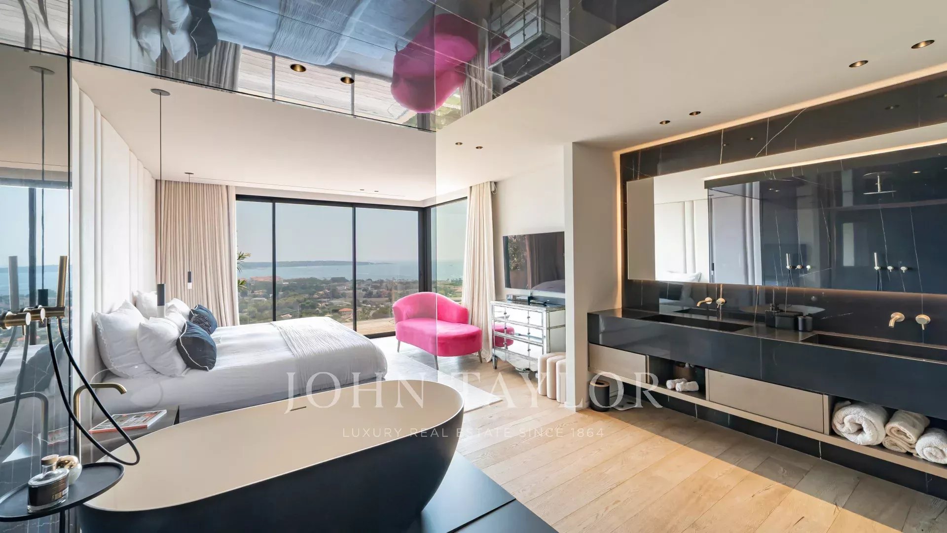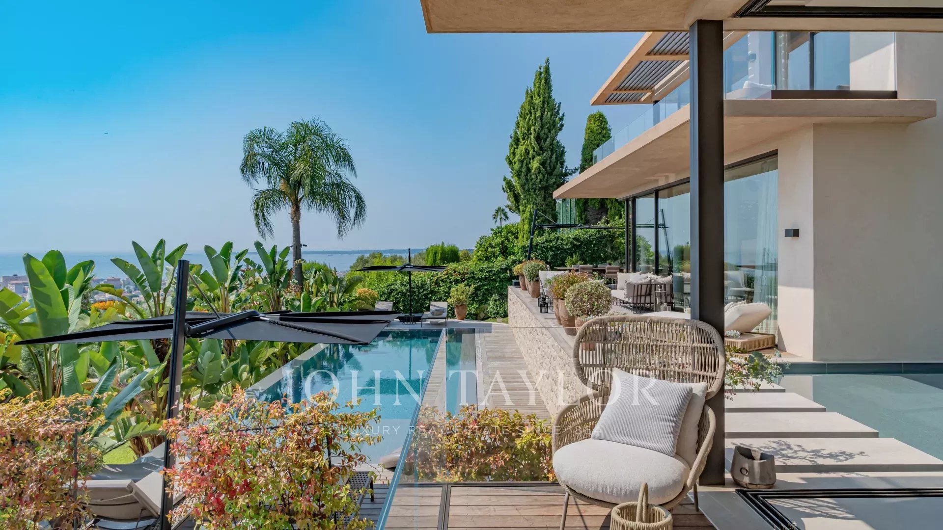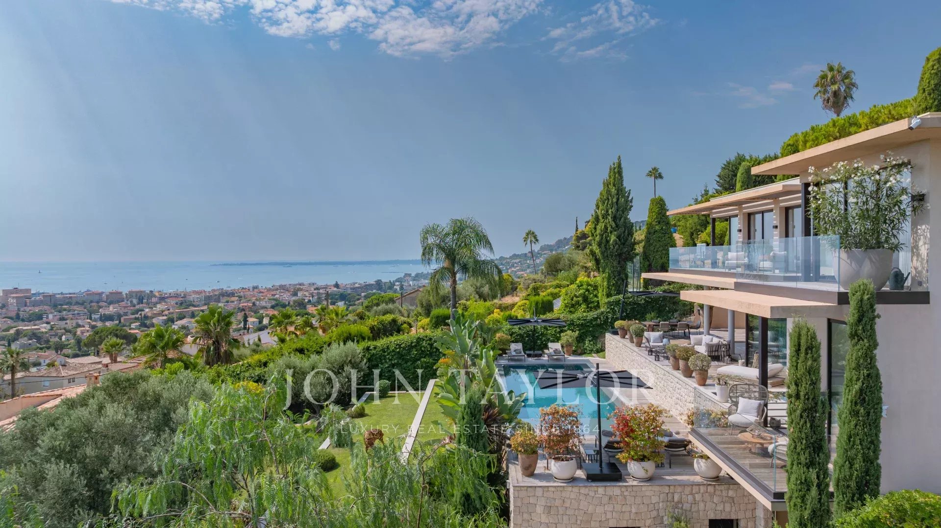 Idéalement située à Golfe Juan, cette maison d'architecte neuve offre une vue panoramique sur la mer et le Cap d'Antibes.