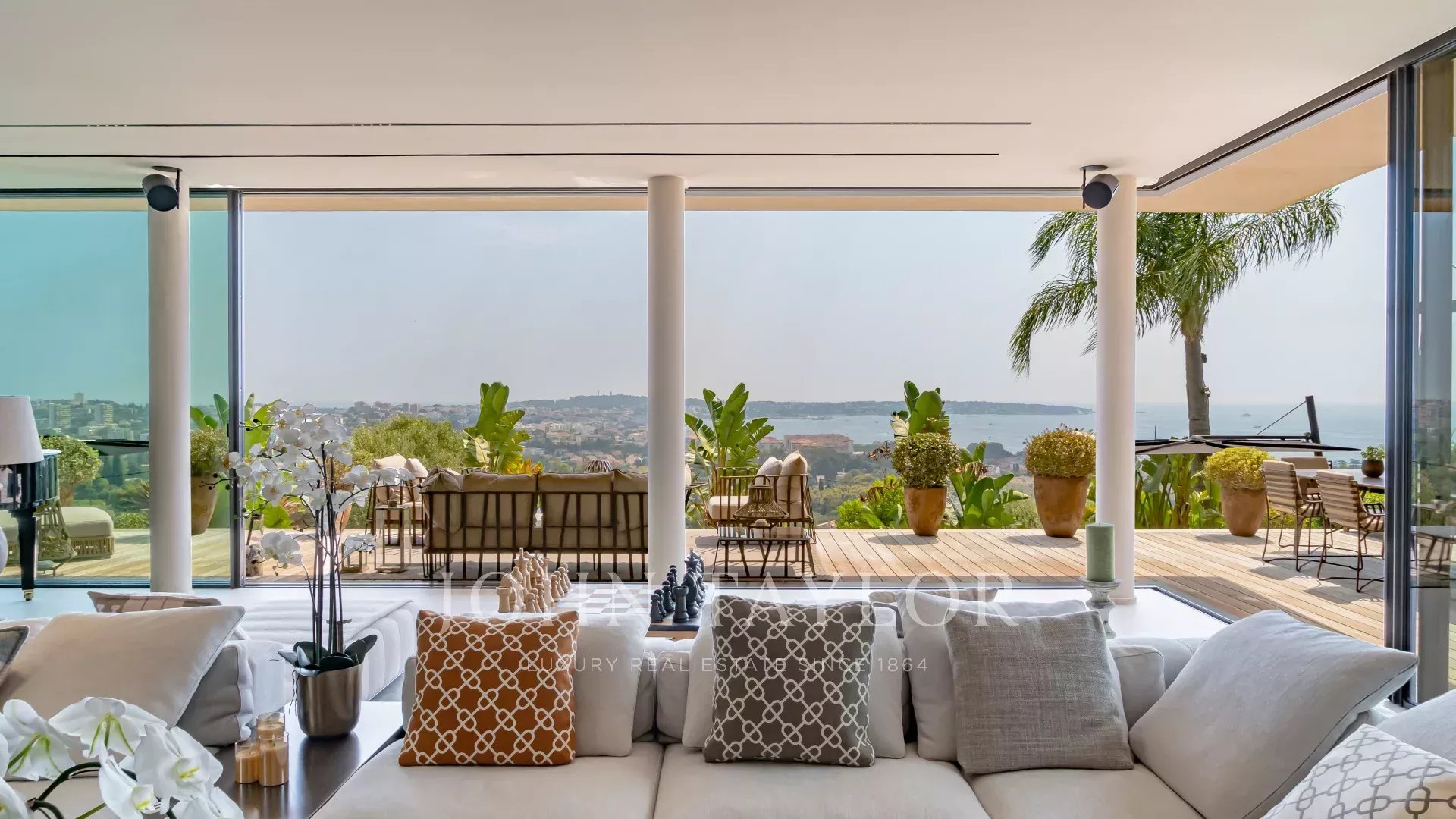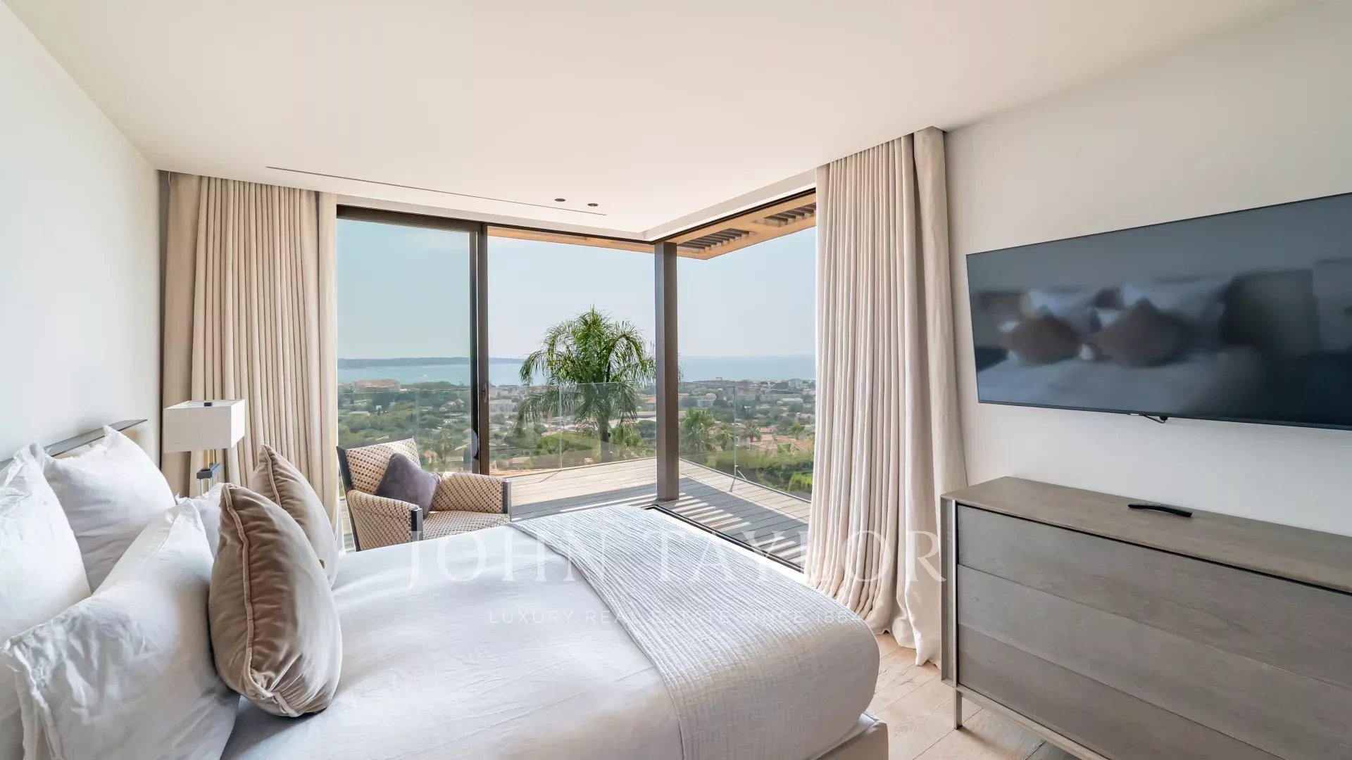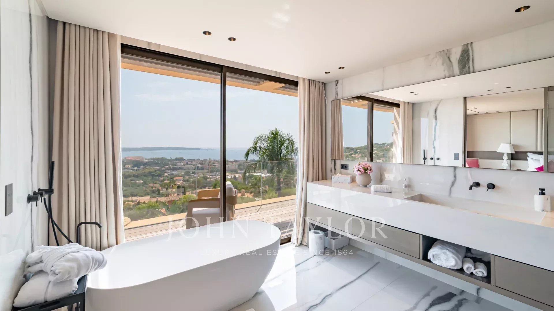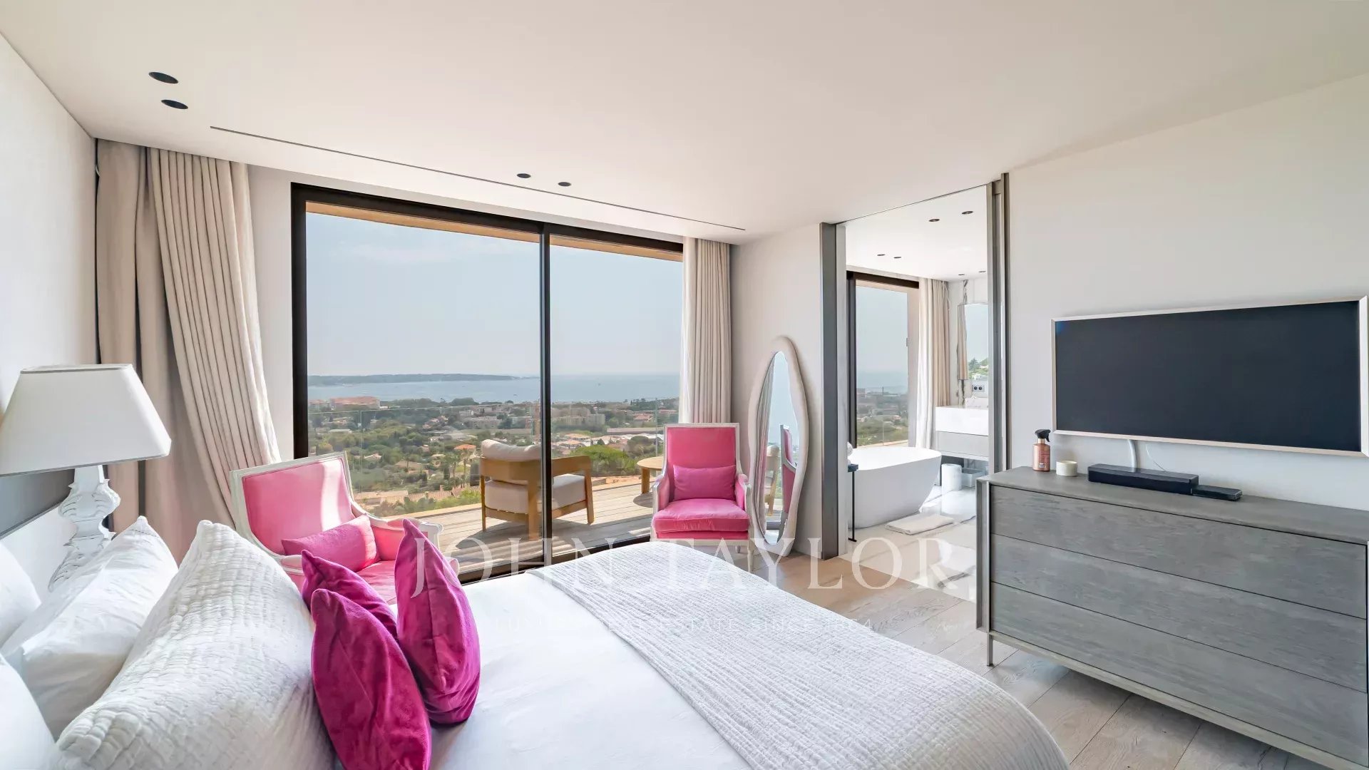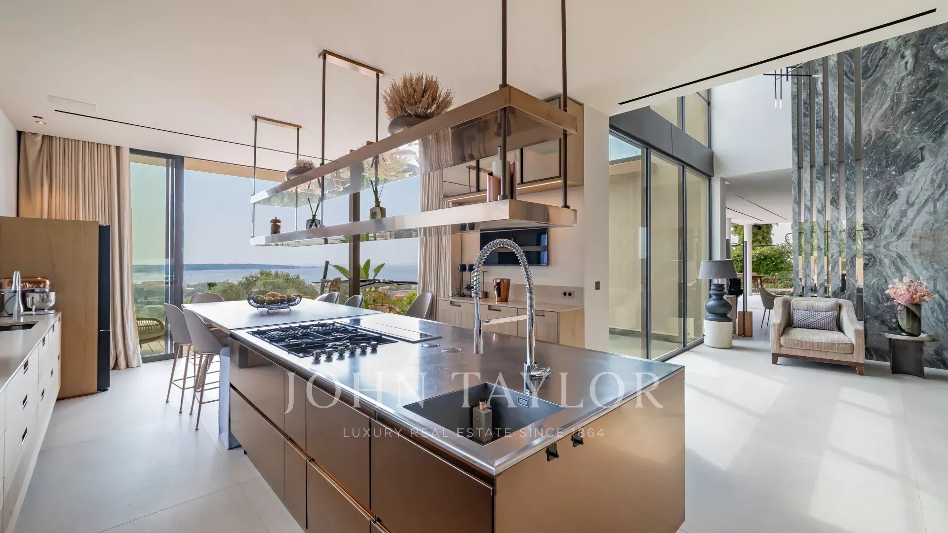 Idéalement située à Golfe Juan, cette maison d'architecte neuve offre une vue panoramique sur la mer et le Cap d'Antibes.