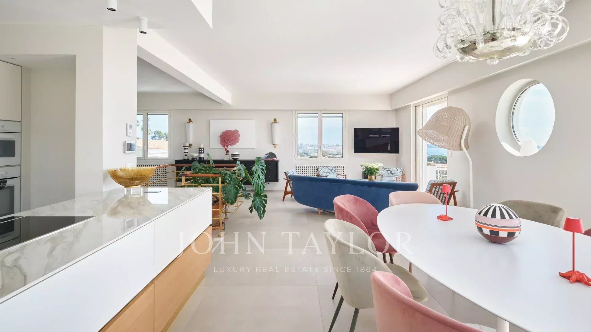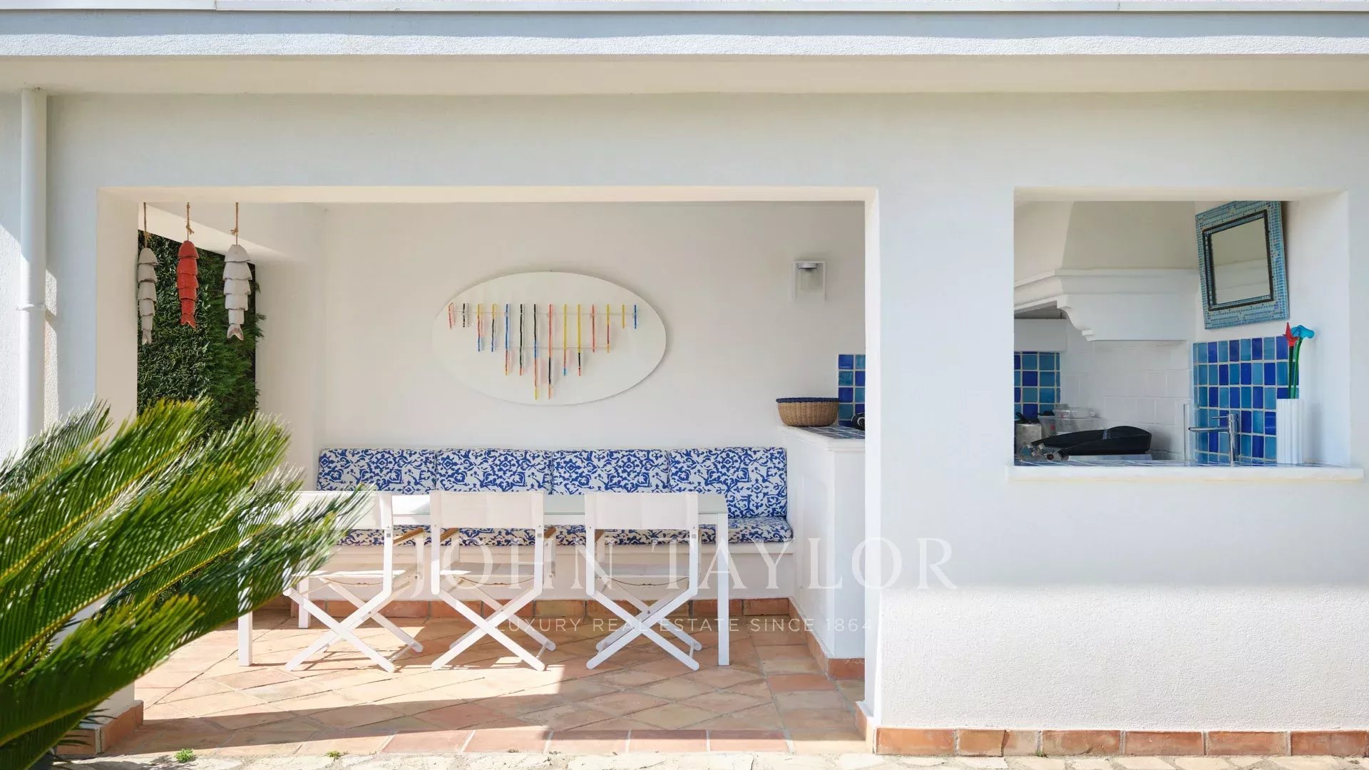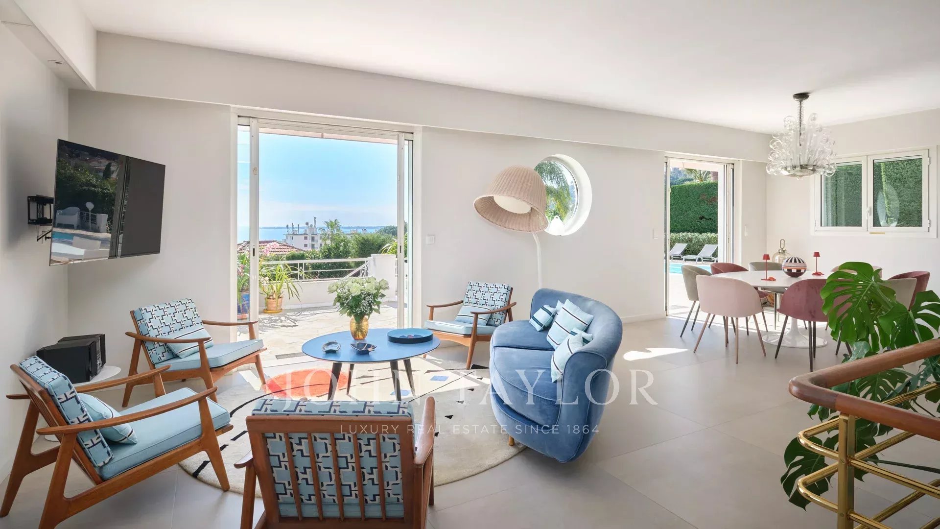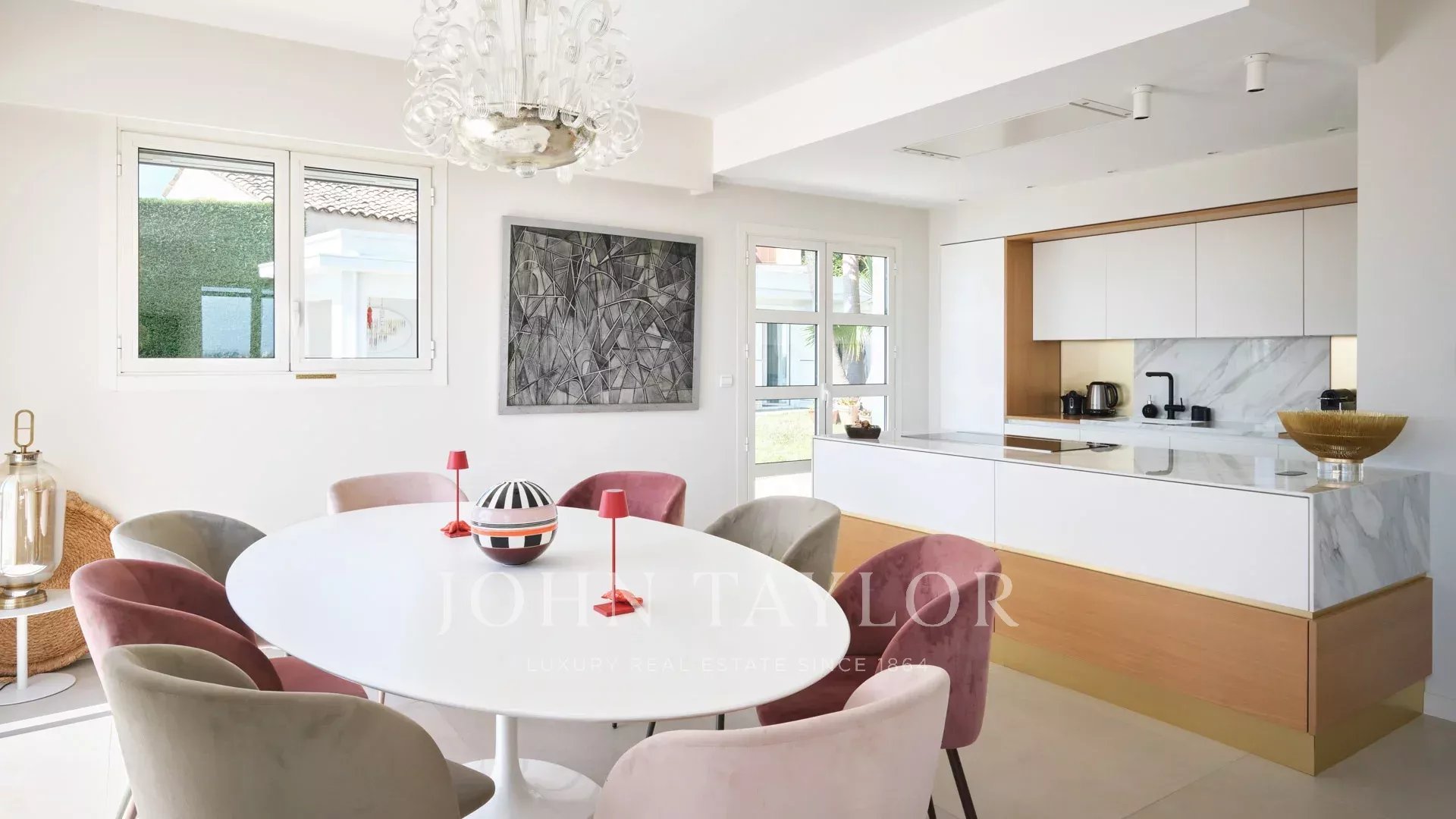 - Belle pièce de réception ouvrant sur le jardin et la piscine, comprenant un salon, une salle à manger et une cuisine américaine entièrement équipée