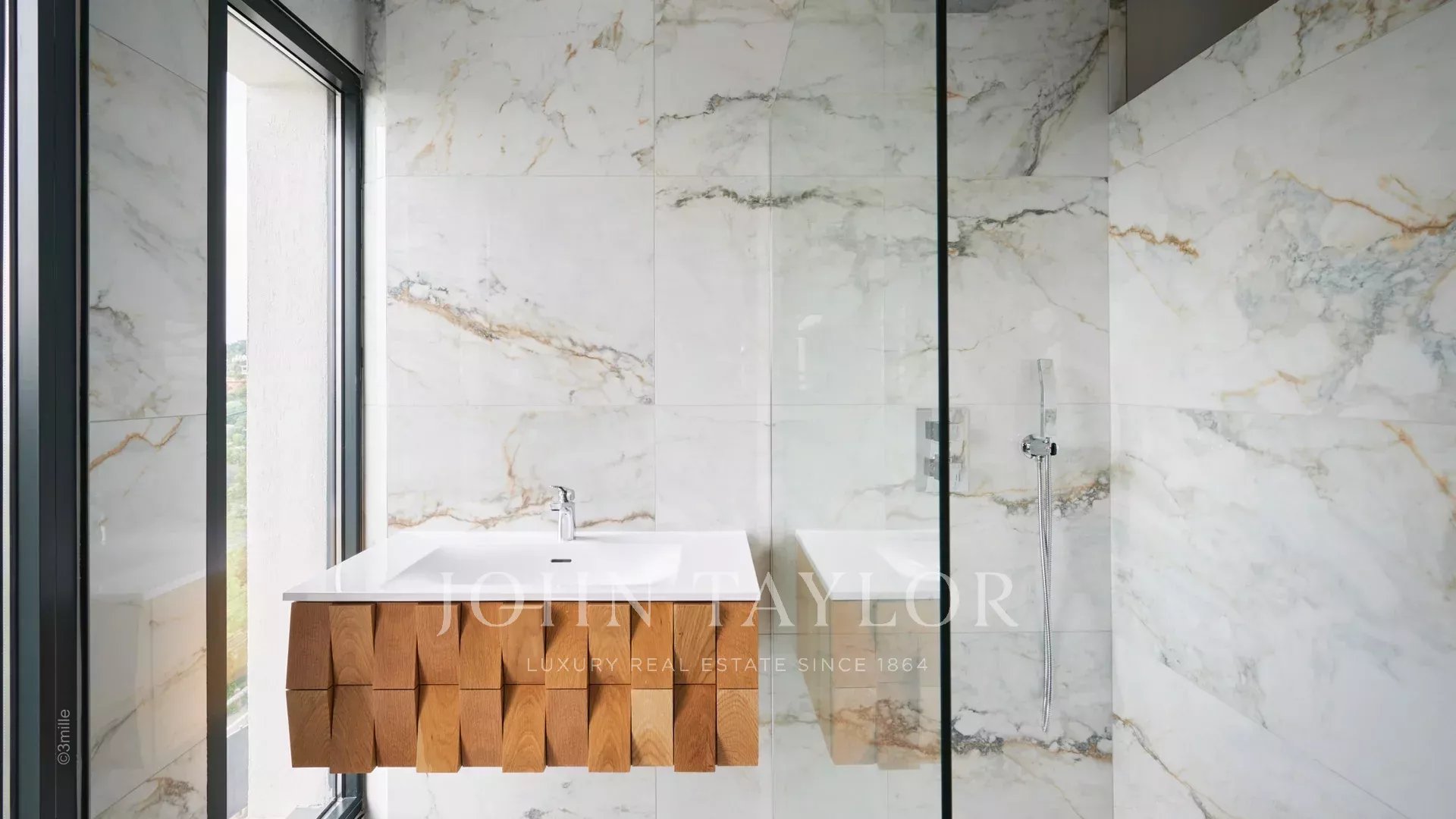 - Majestueux et lumineux séjour bénéficiant de 5 M. de hauteur sous plafond donnant sur une large terrasse et sa piscine à débordement chauffée 11mx5m,