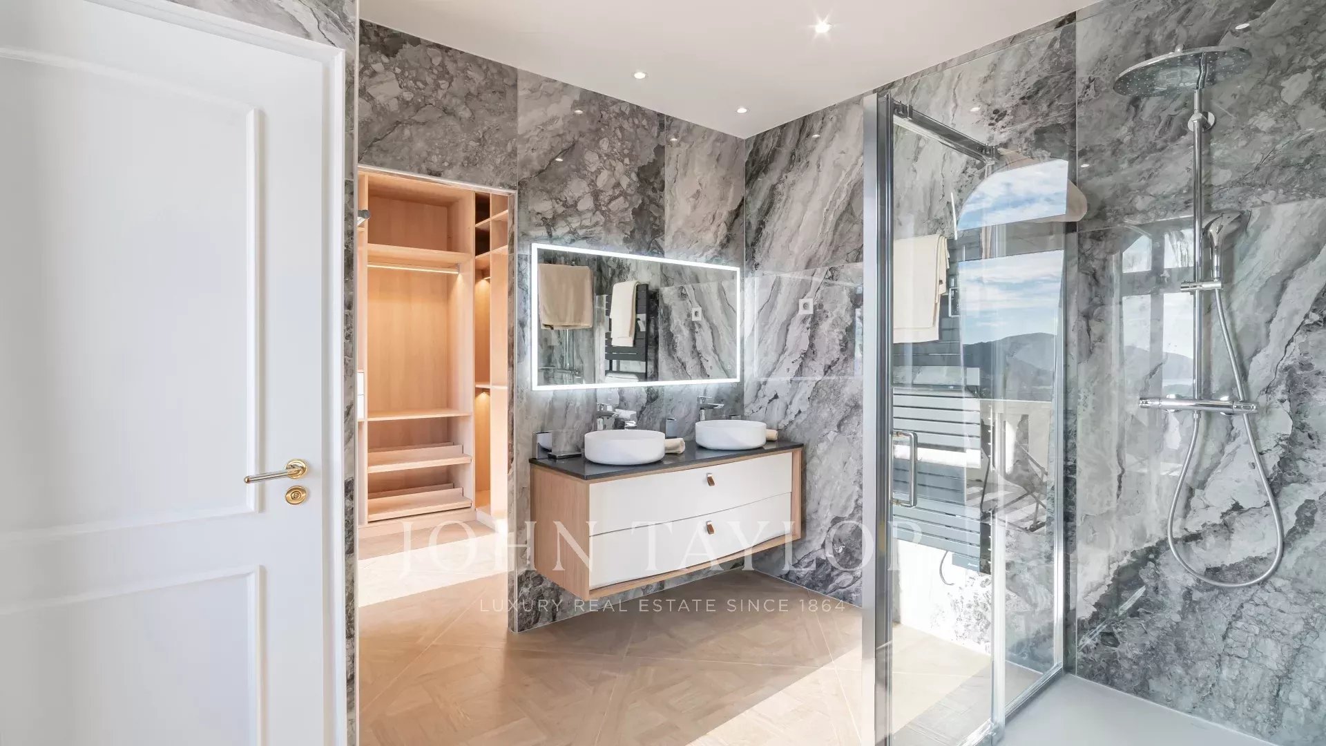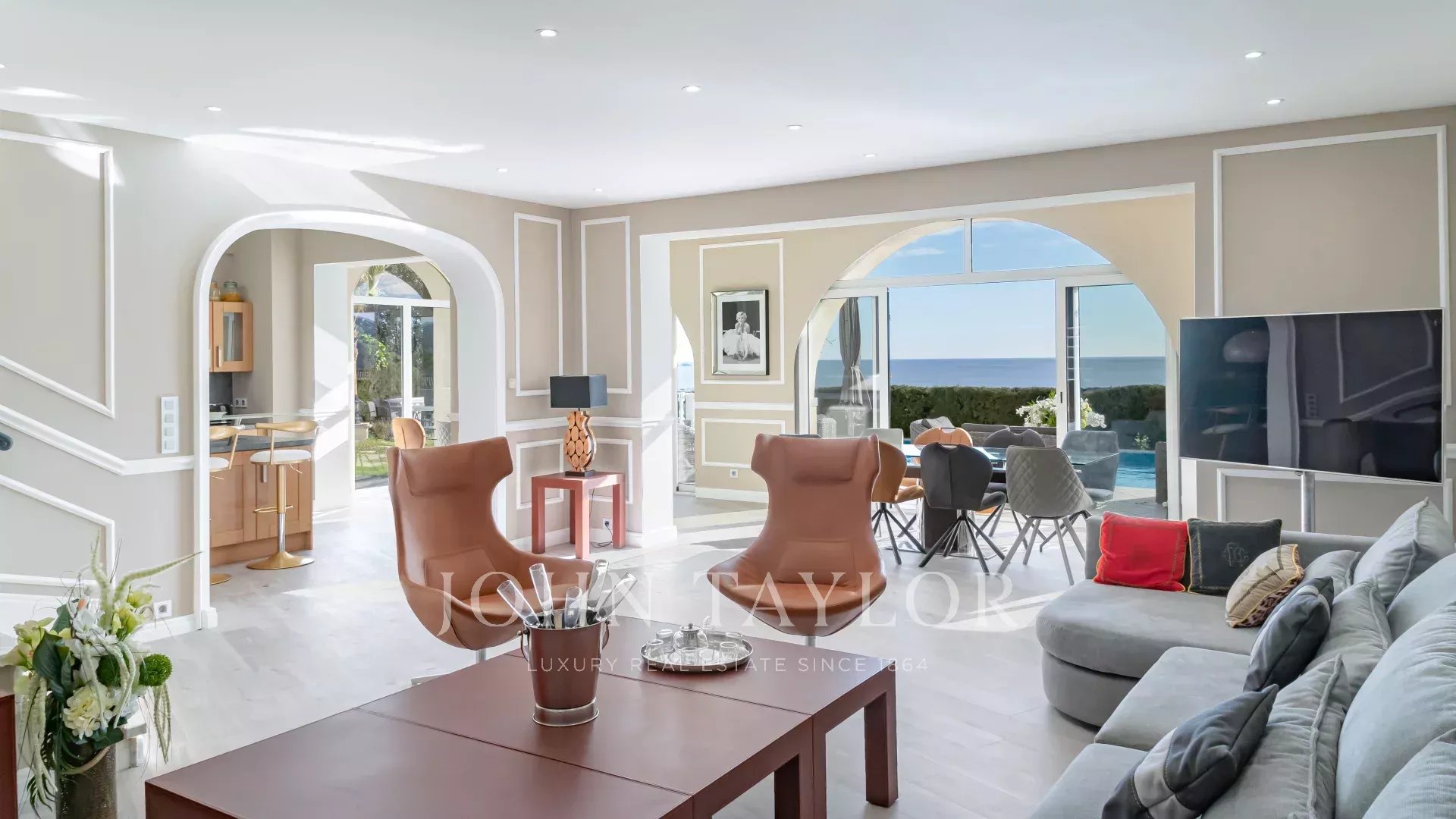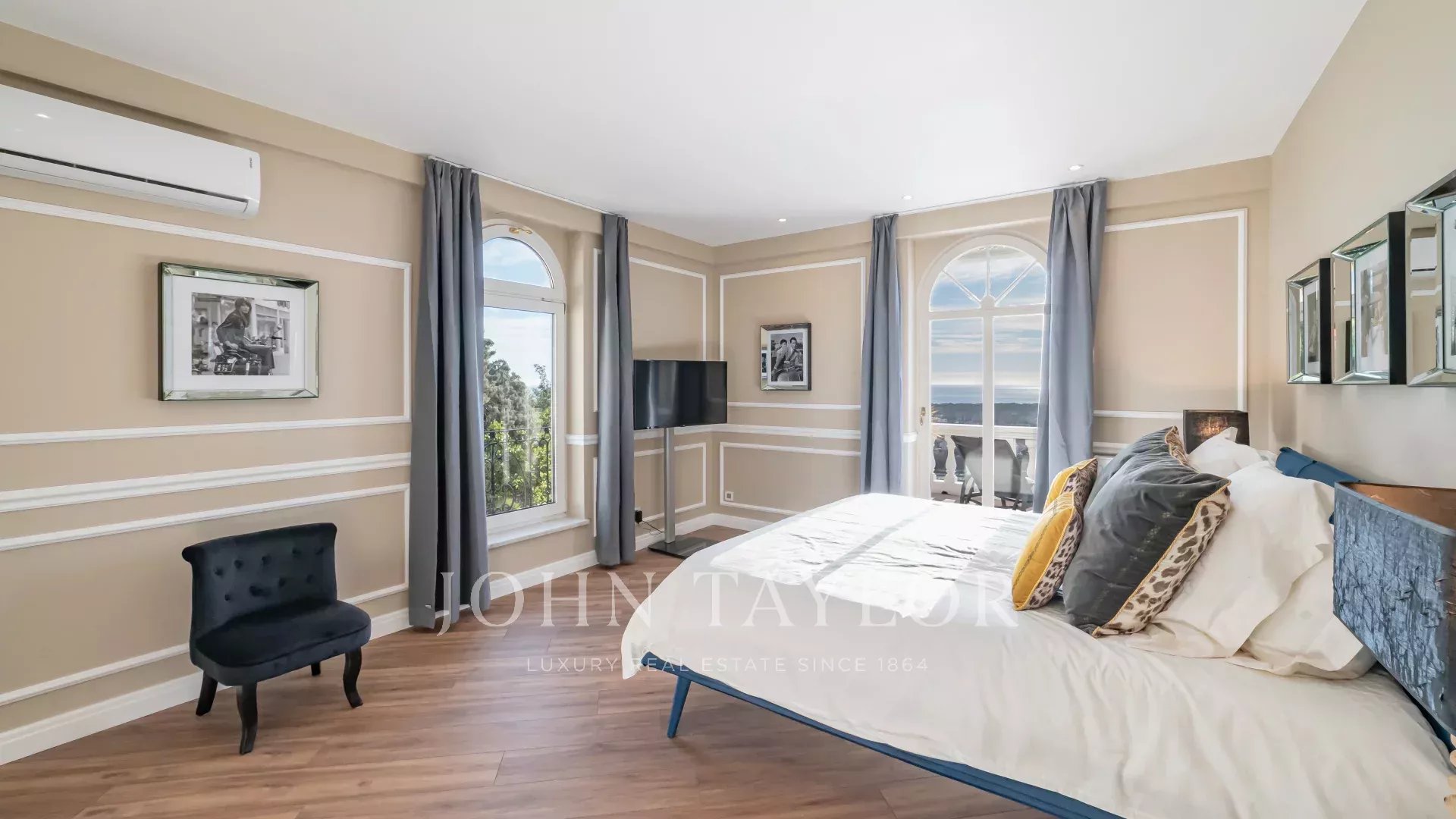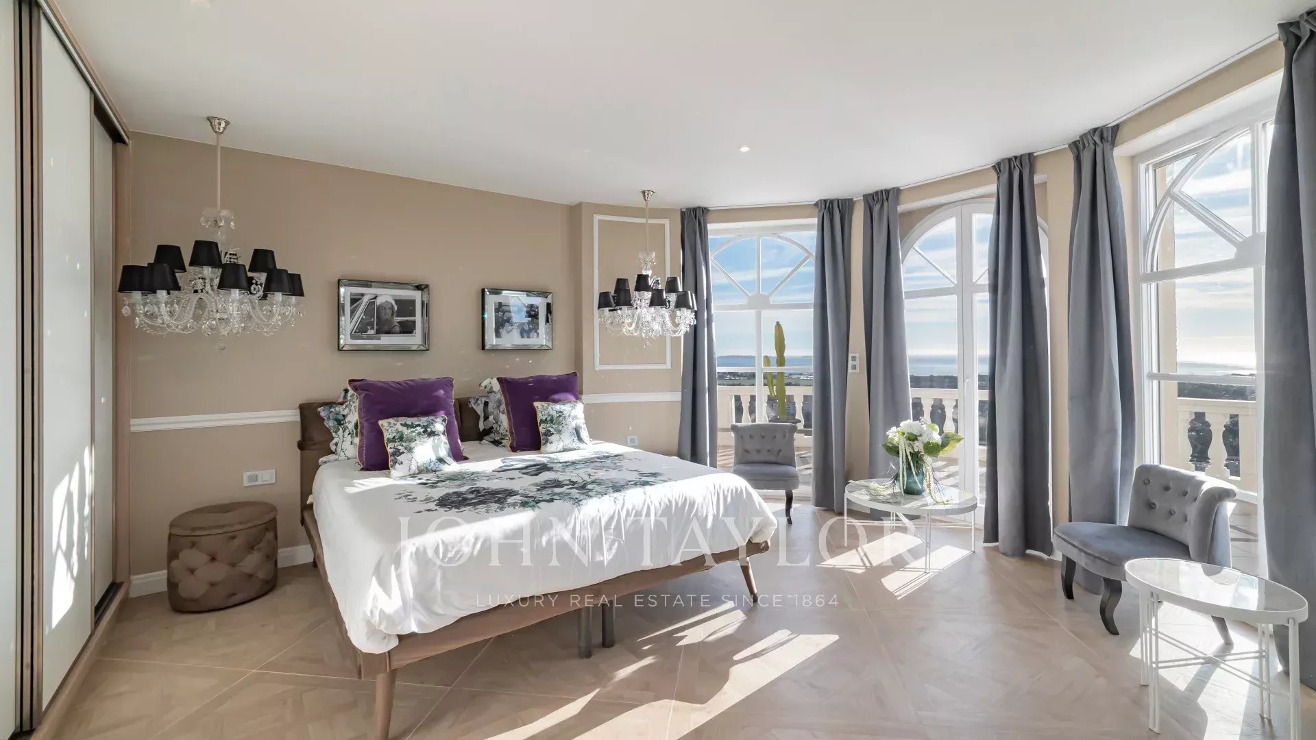 Située dans un quartier résidentiel proche du centre ville de Mandelieu, cette belle villa exposée plein-sud avec piscine à débordement offre une vue panoramique sur la baie de Cannes.