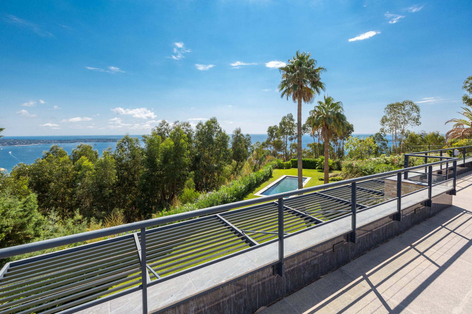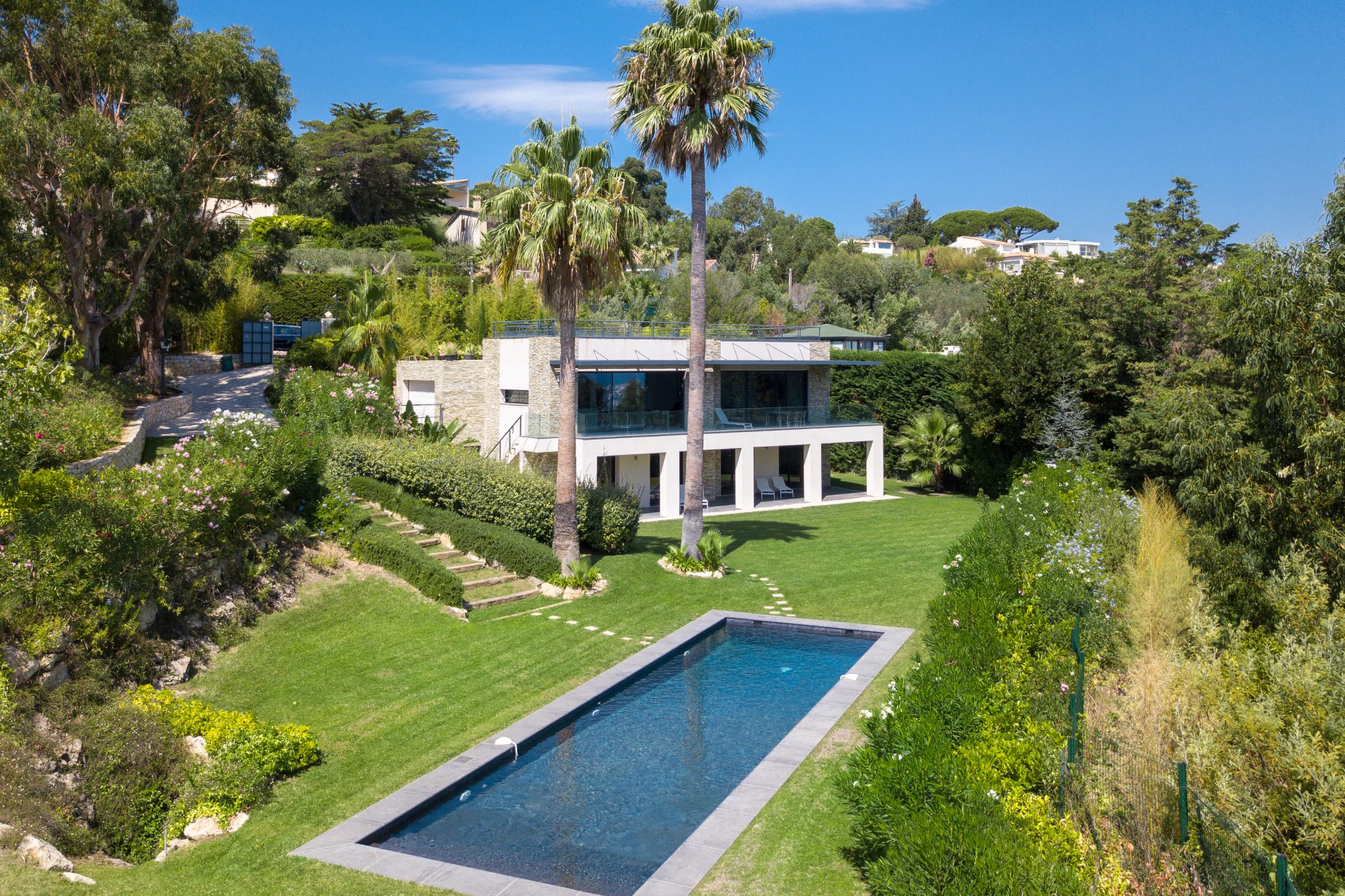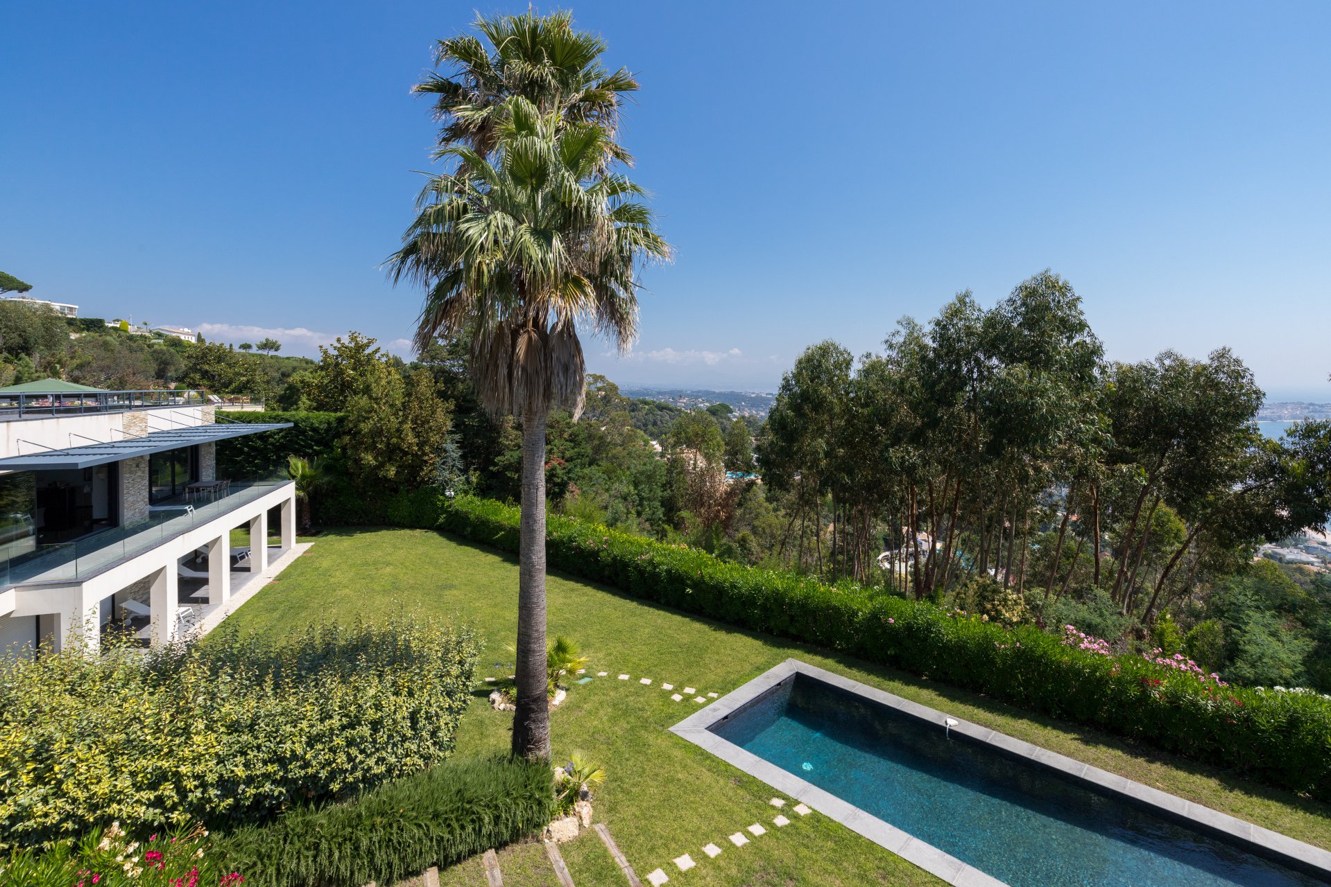 Au cœur d’un écrin de verdure, cette superbe villa contemporaine offre une vue mer panoramique s’étendant jusqu’au Cap d’Antibes.