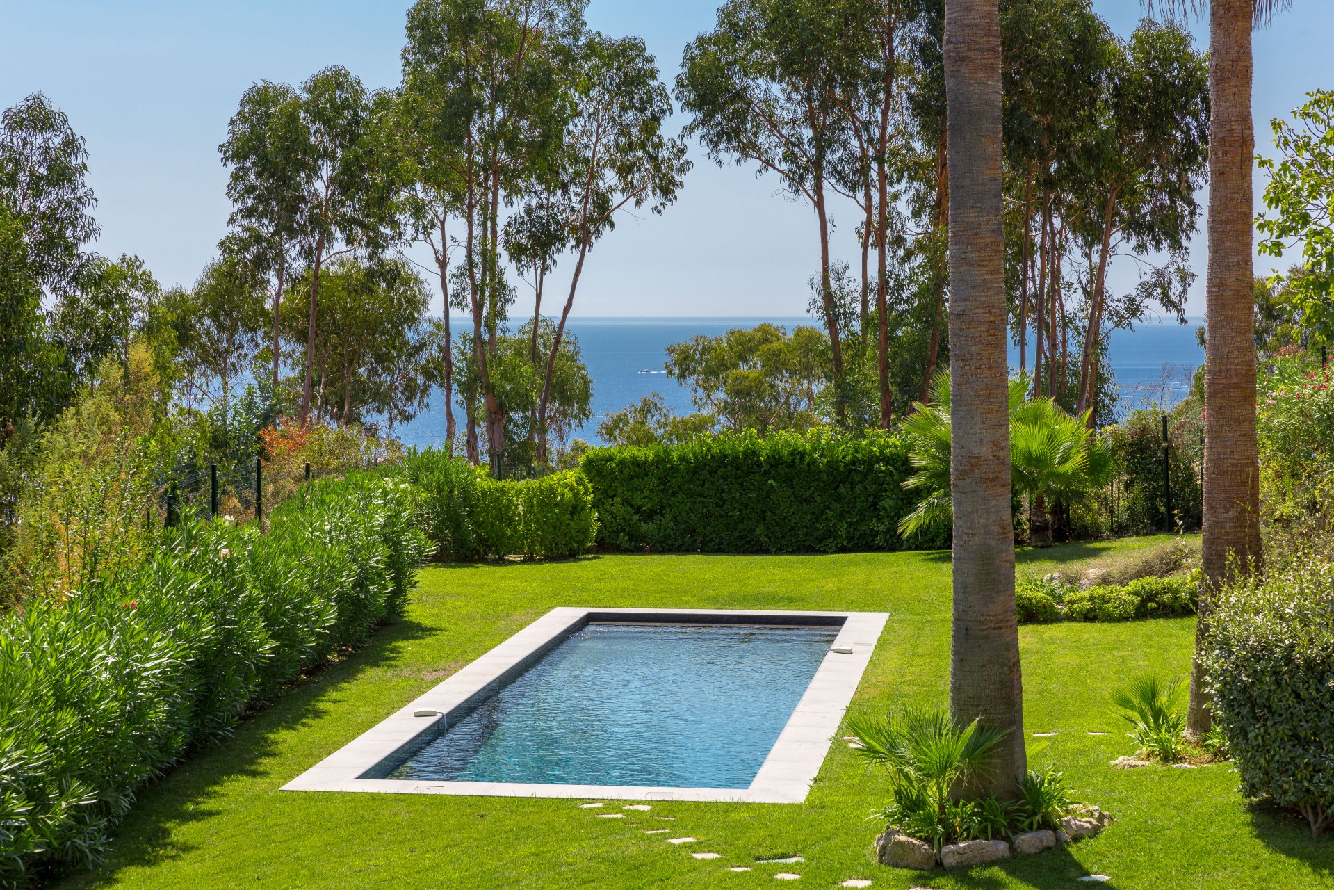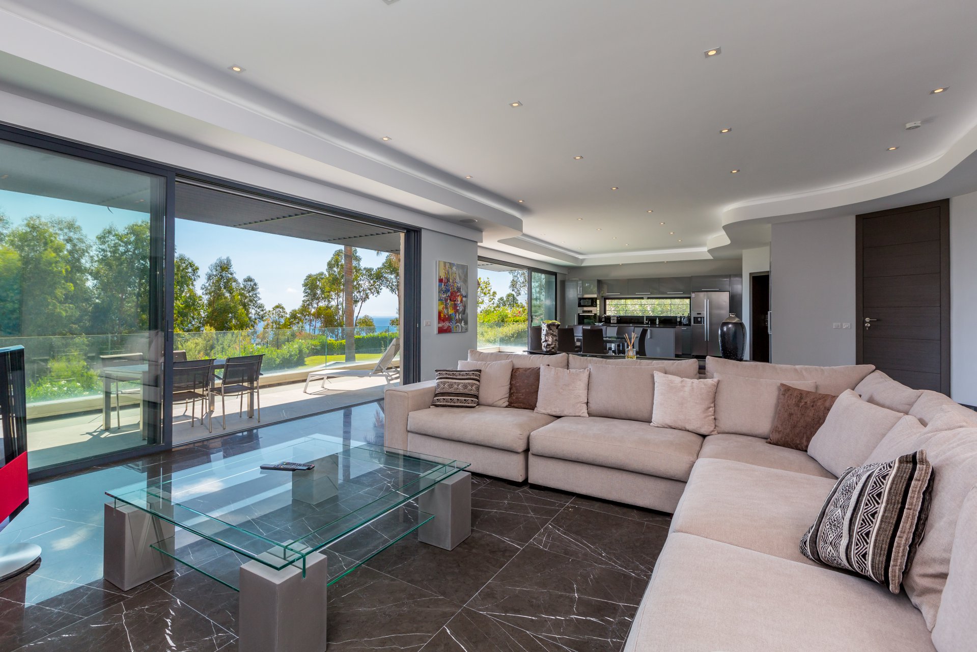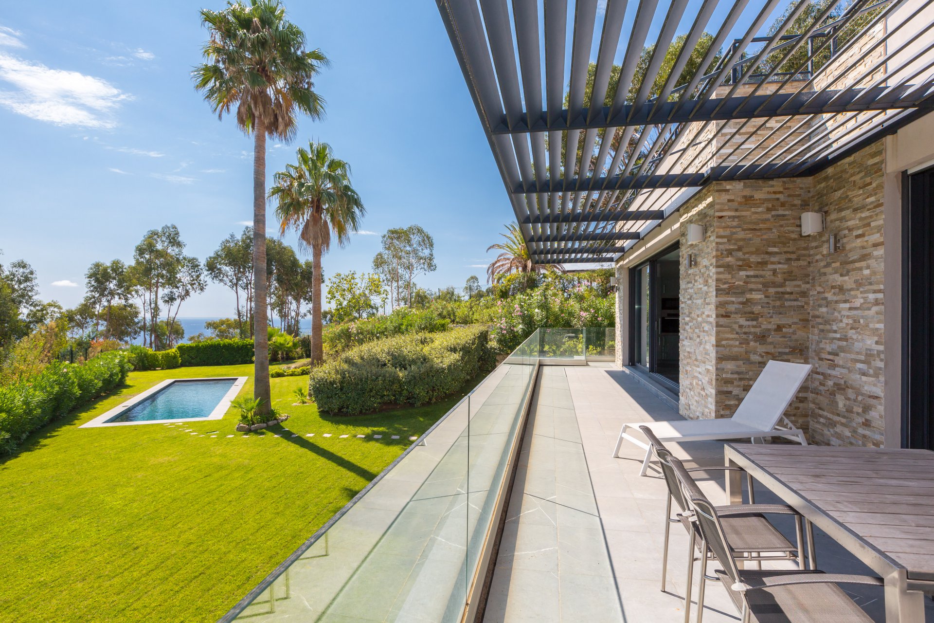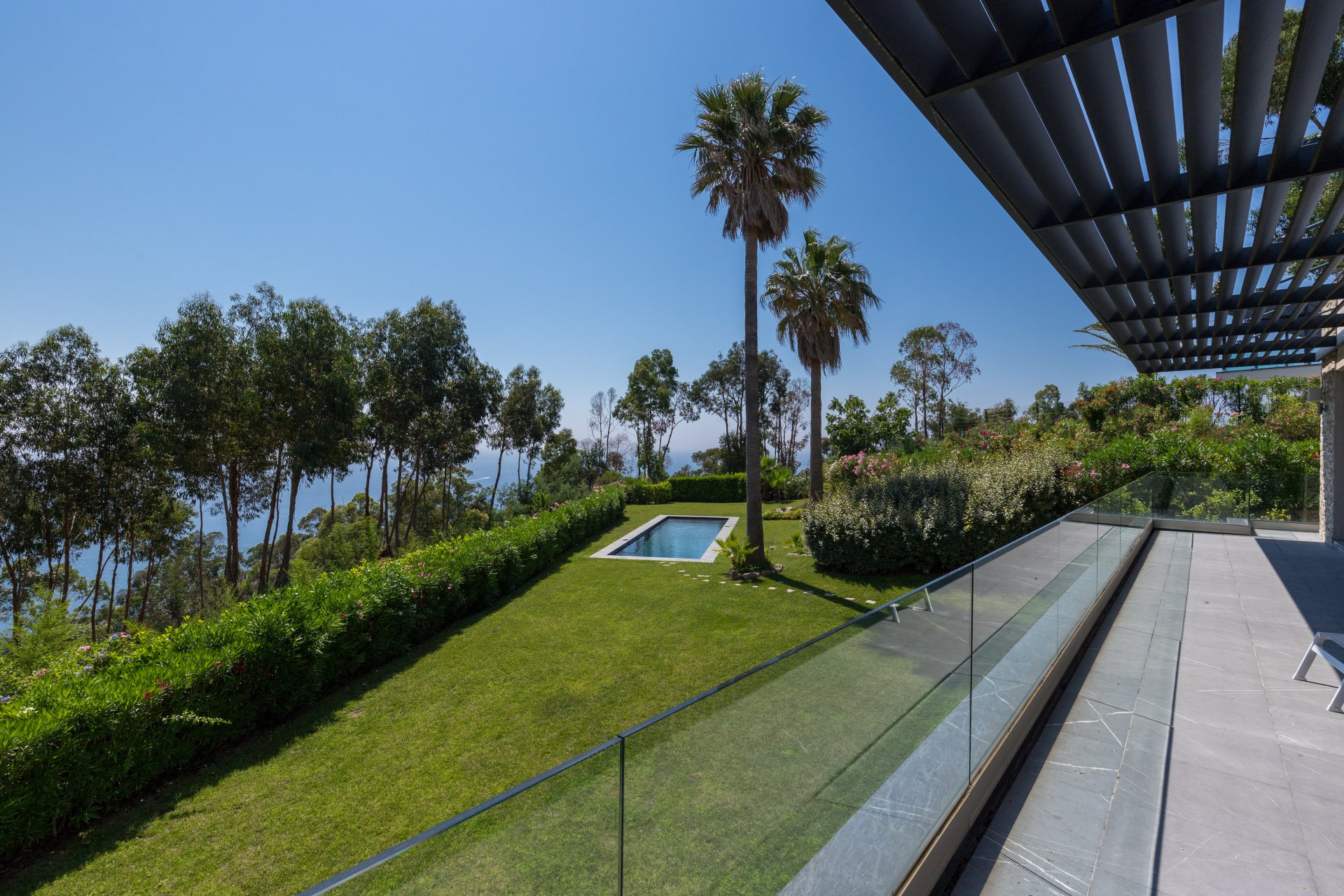 Au cœur d’un écrin de verdure, cette superbe villa contemporaine offre une vue mer panoramique s’étendant jusqu’au Cap d’Antibes.