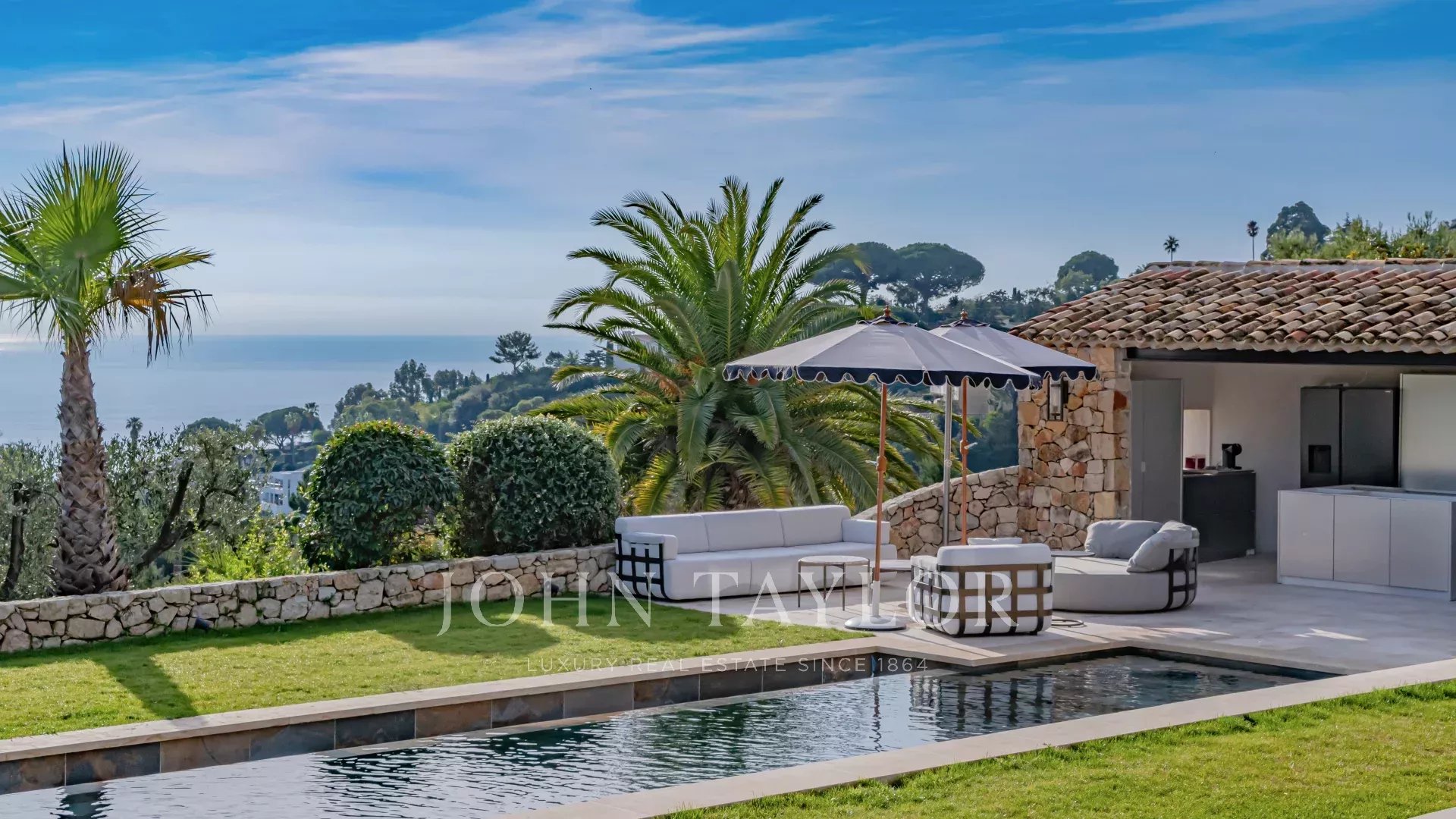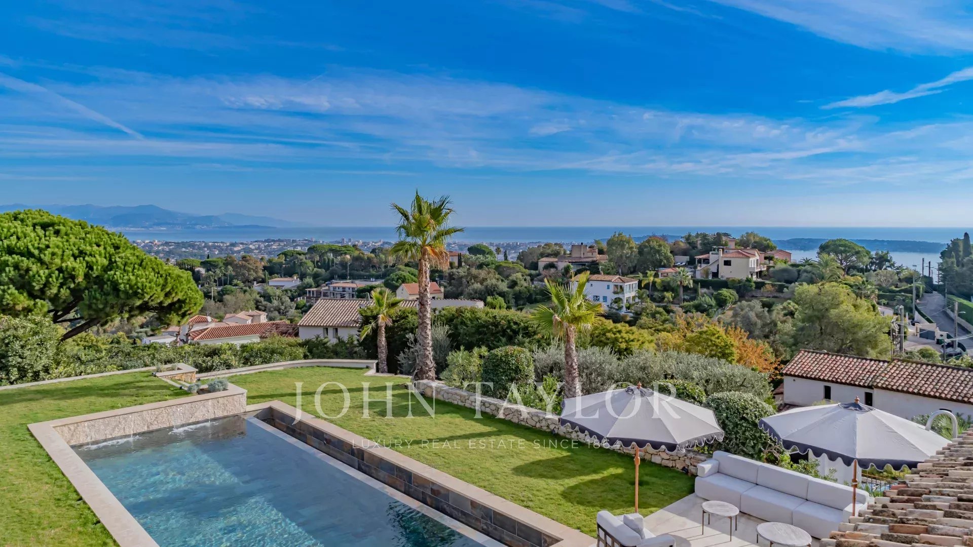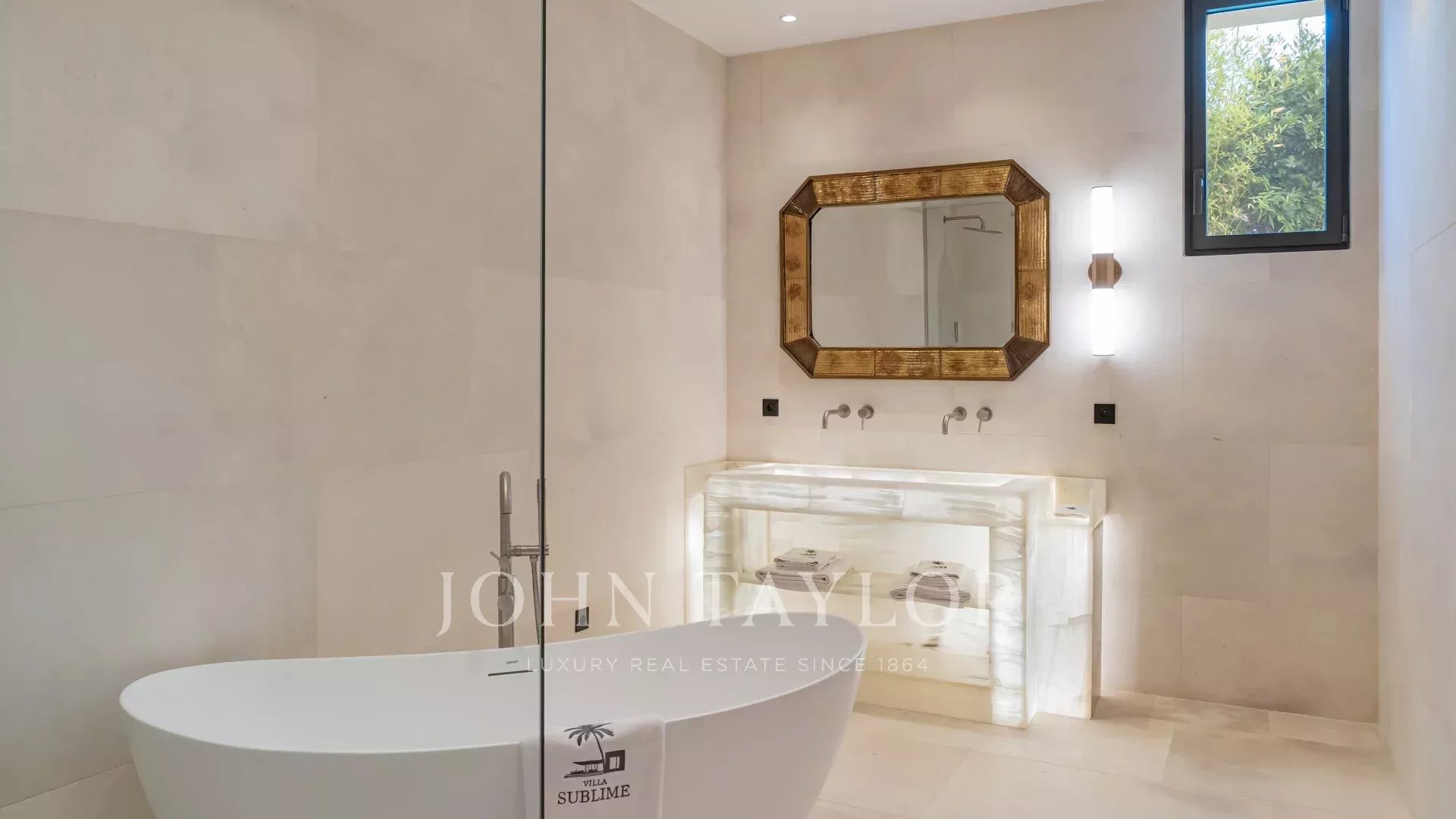 La villa est entourée d’un magnifique jardin paysager Méditerranéen agrémenté d’une piscine à débordement, d’un jacuzzi et d’un pool-house.