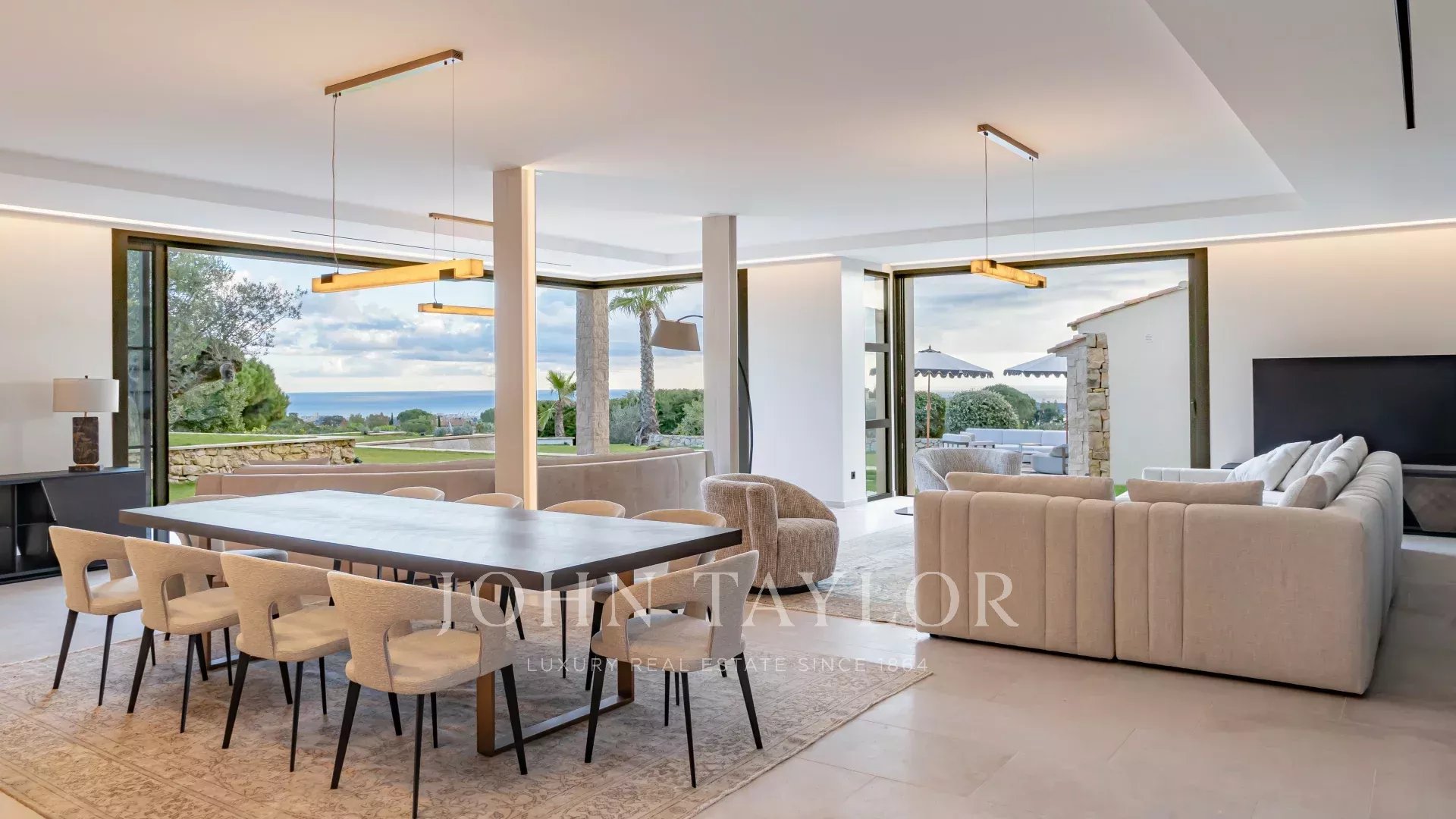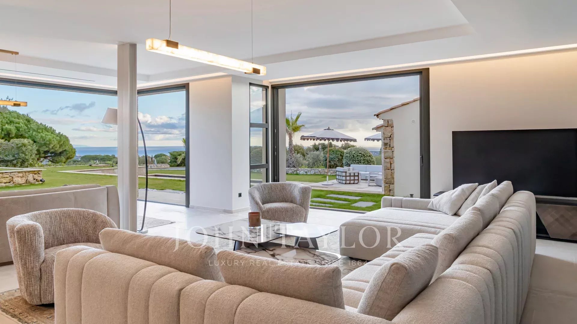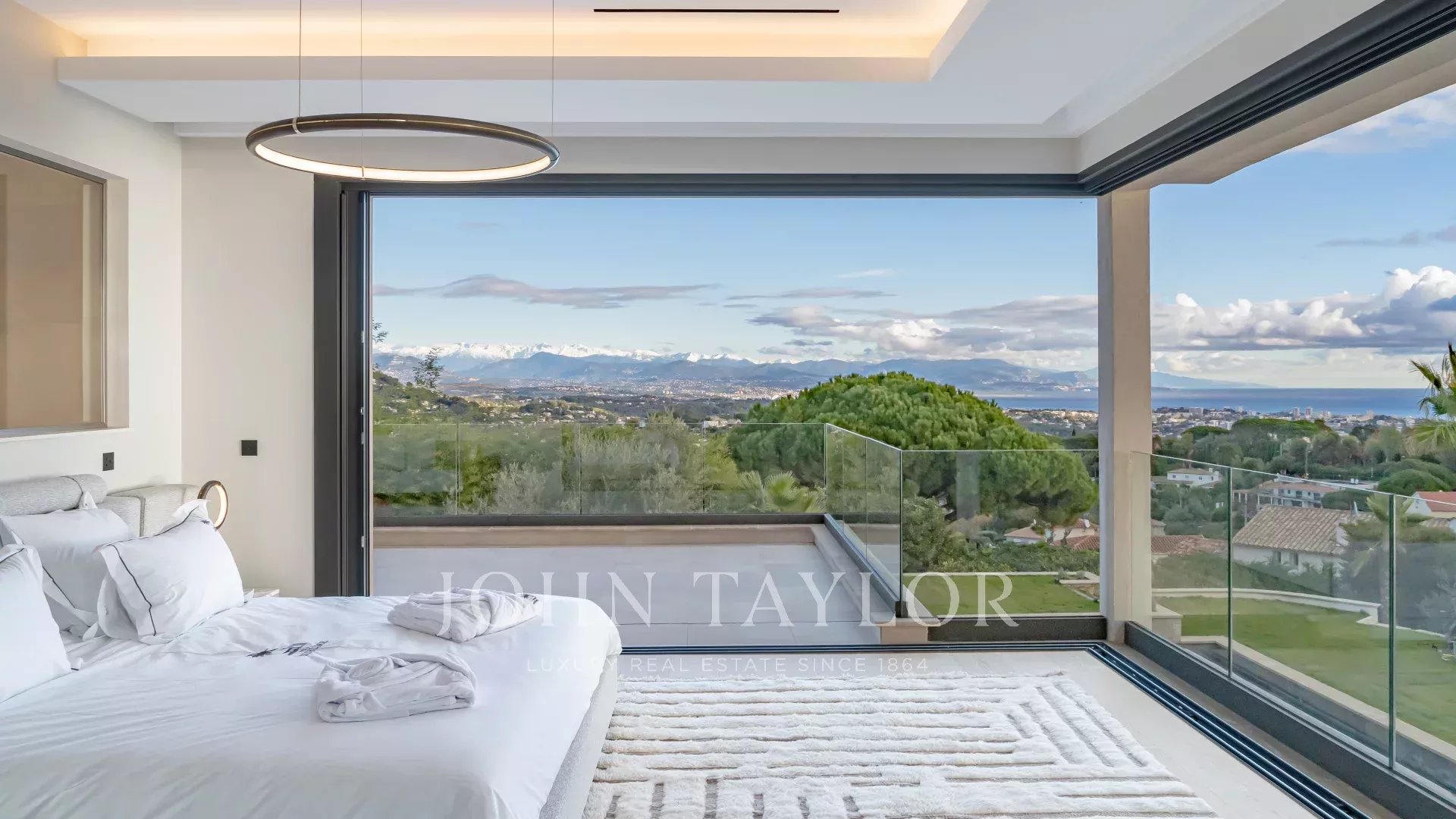 Dans le prestigieux secteur de Super Cannes, hautement calme et résidentiel, cette villa contemporaine d’environ 382 m² se situe dans un domaine fermé. Erigée sur un terrain de 2 090 m² en position dominante, la propriété jouit d’une vue sublime du Cap d'Antibes des Alpes jusqu’aux reliefs montagneux italiens.