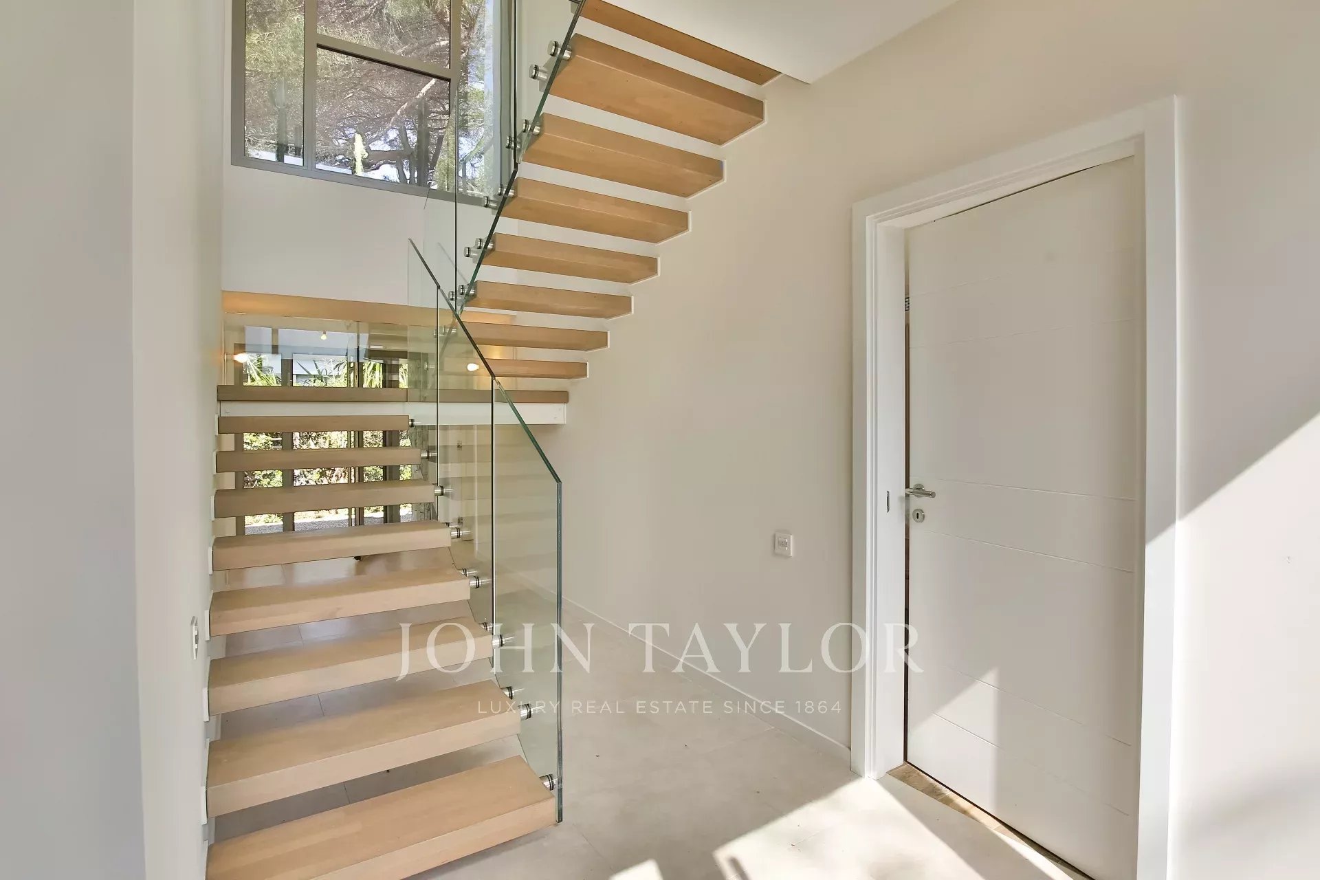 Située dans un domaine fermé avec gardien, au calme et a proximité des plages et des commerces, très belle villa contemporaine de 228m² entièrement rénovée avec qualité et édifiée au coeur d'un jardin magnifiquement arboré avec piscine.
