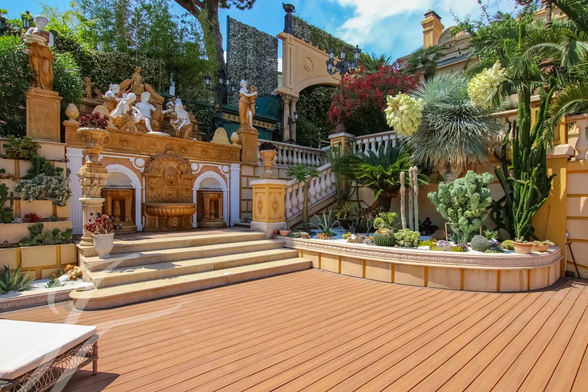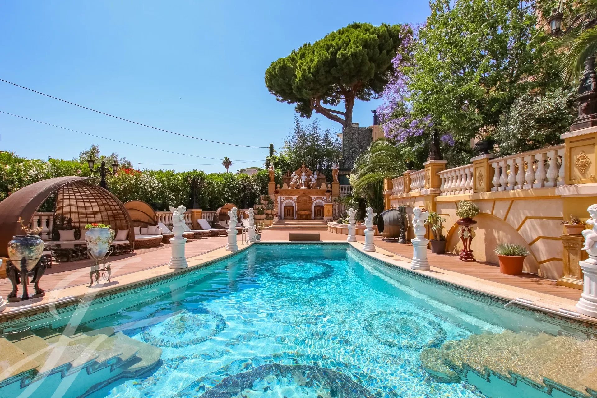 Le jardin est magnifiquement aménagé avec des parterres de fleurs colorées et une fontaine élégante. La piscine est grande et possède une terrasse spacieuse.