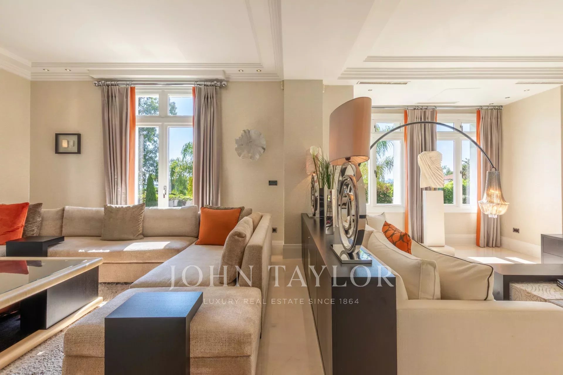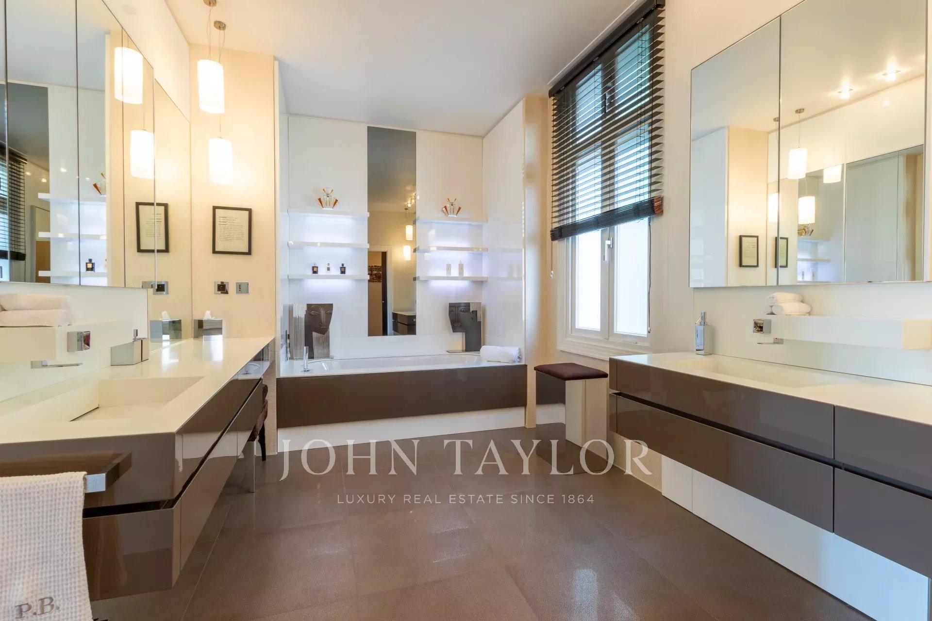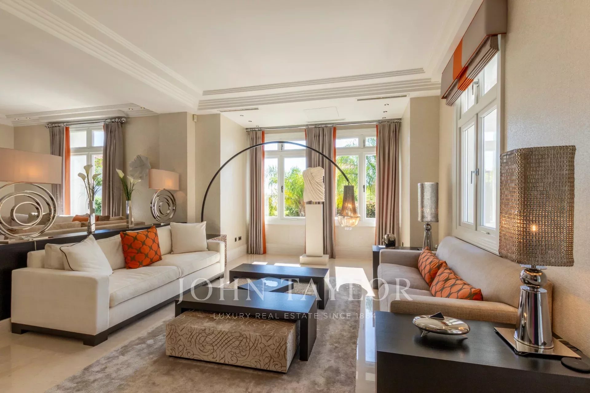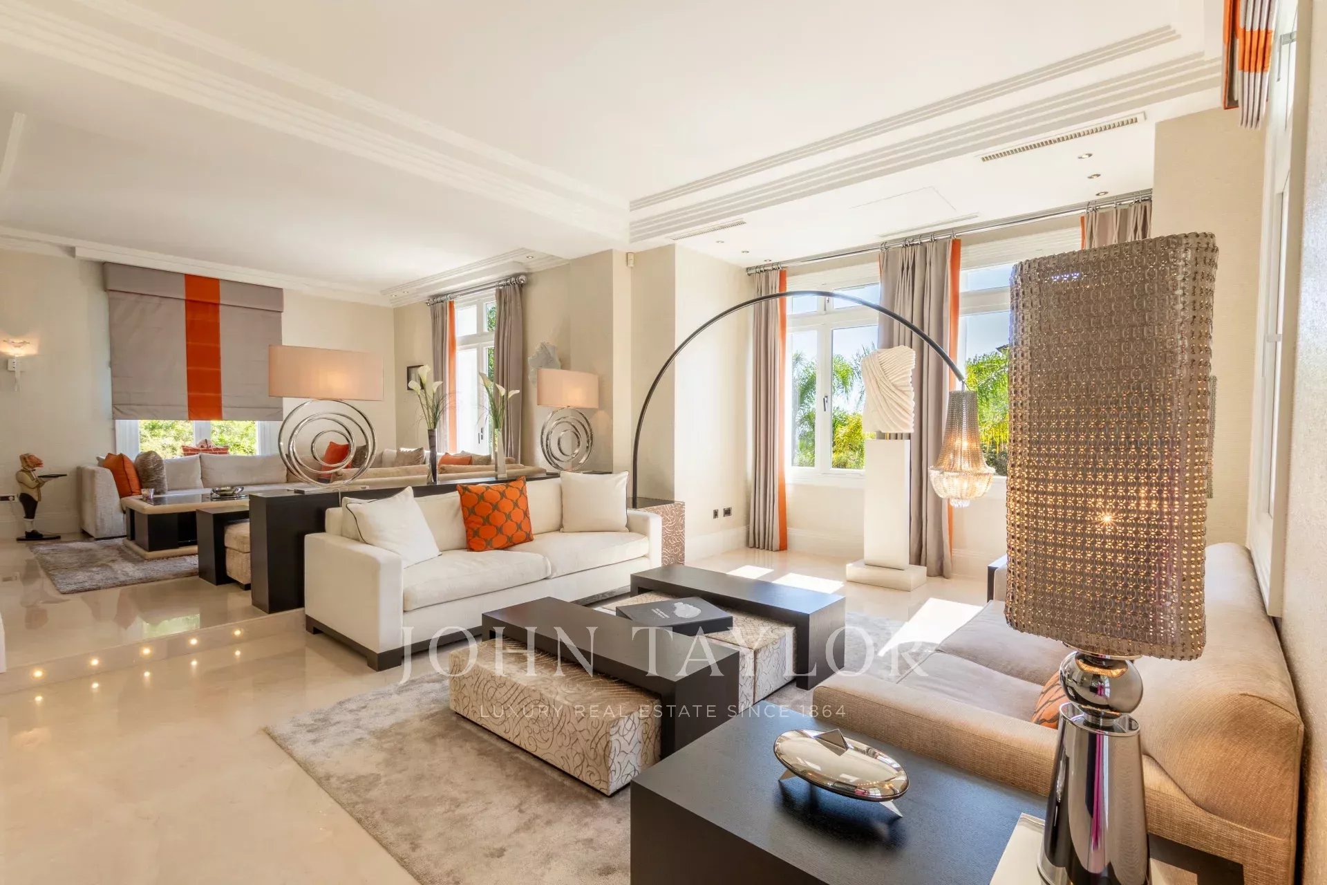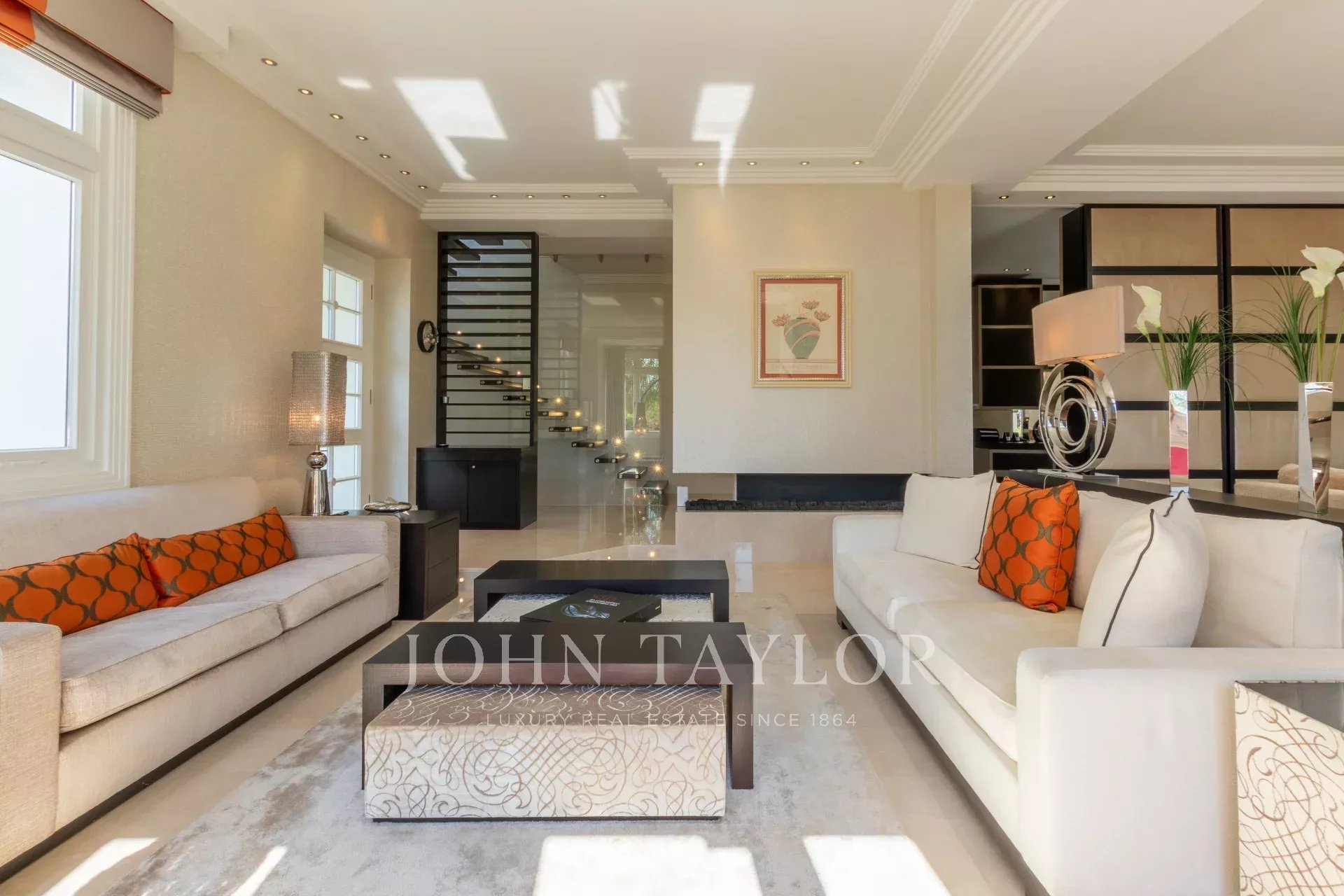 Elle offre environ 394 m² habitables sur un terrain de 1308 m² avec piscine à débordement de 15 mètres comprenant une fontaine et jet spa.