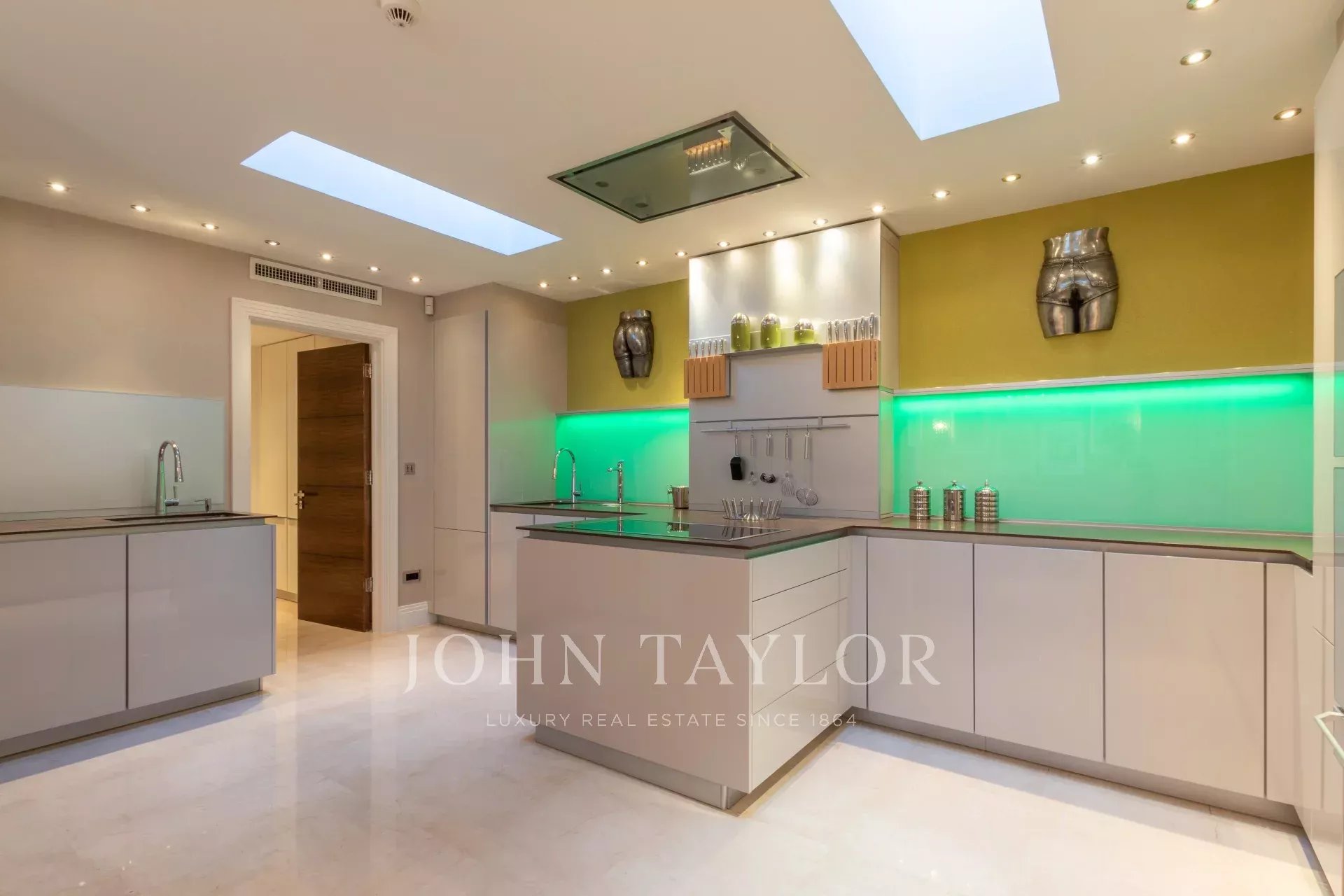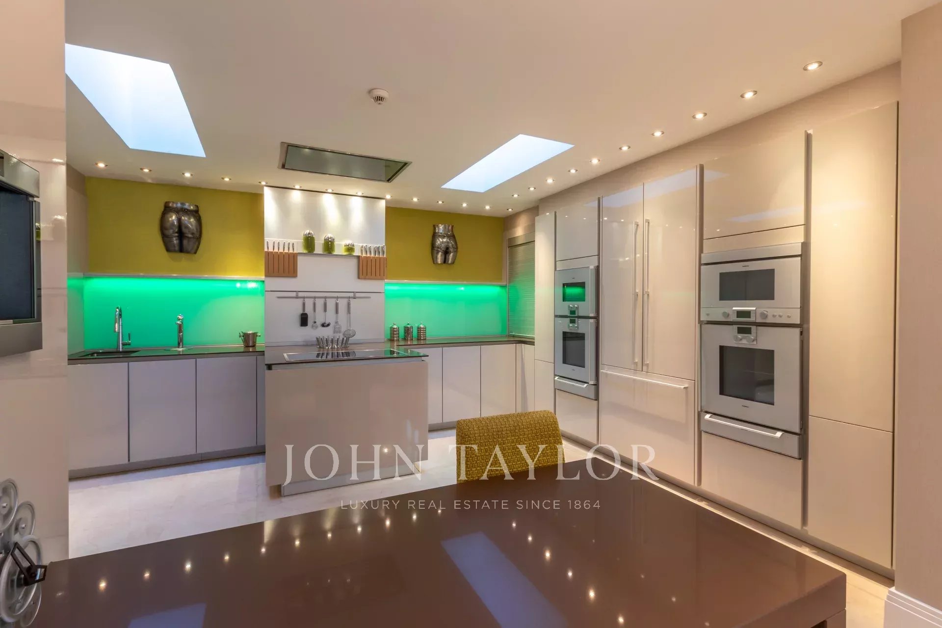 La cuisine a été conçue par Nicholas Anthony of Knightsbridge, elle est équipée de meubles Poggenpohl avec des tiroirs à commande électrique et des panneaux avec changement de couleur télécommandés et d'appareils électroménagers Gaggenau.