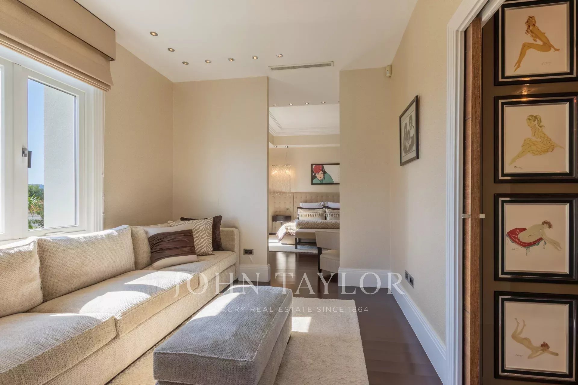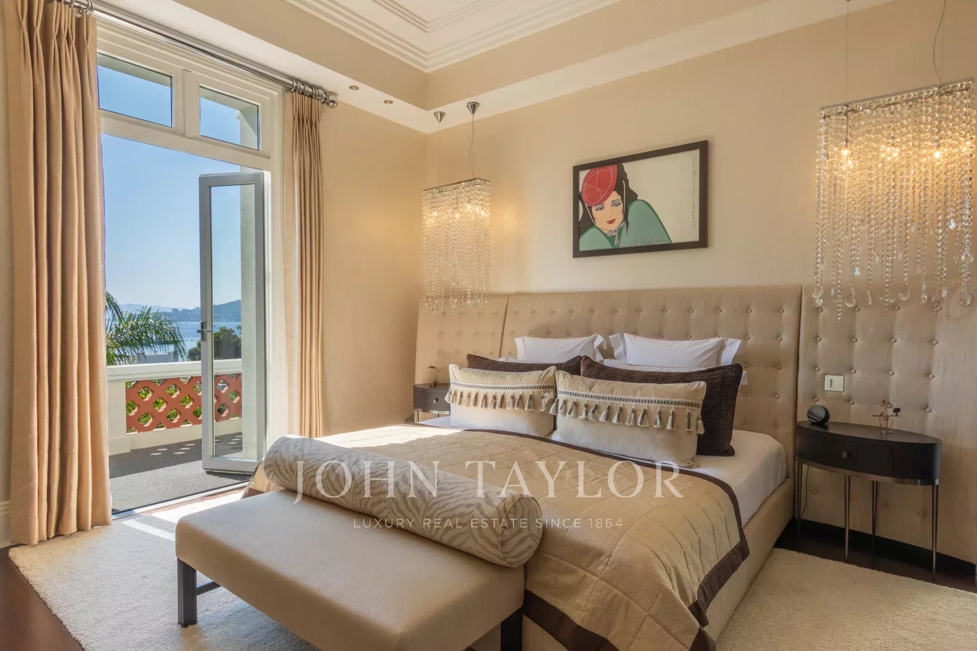 Chambre de maître d'environ 100 m² avec balcon et vue mer, salon, dressing et salle de bains luxueuse.