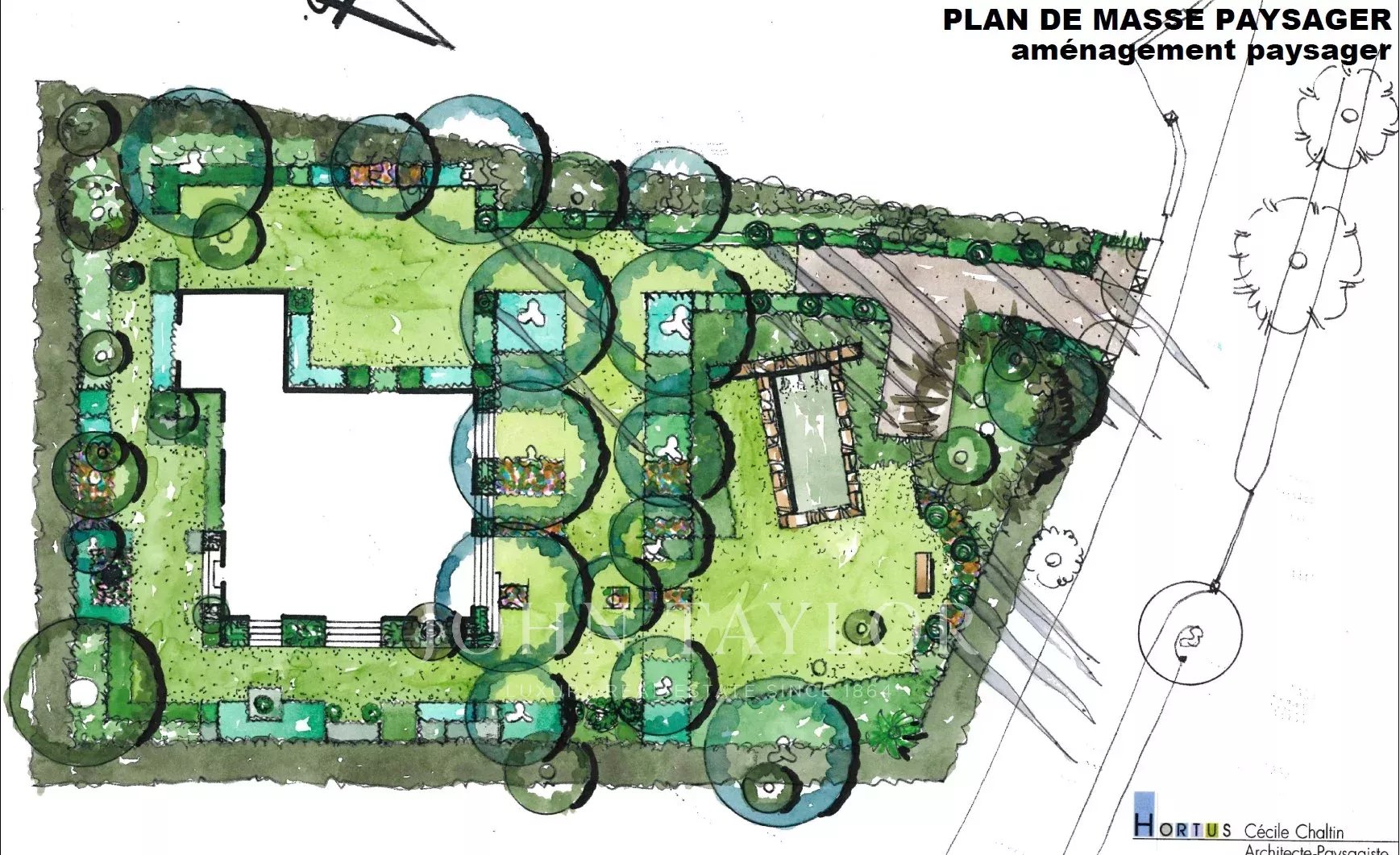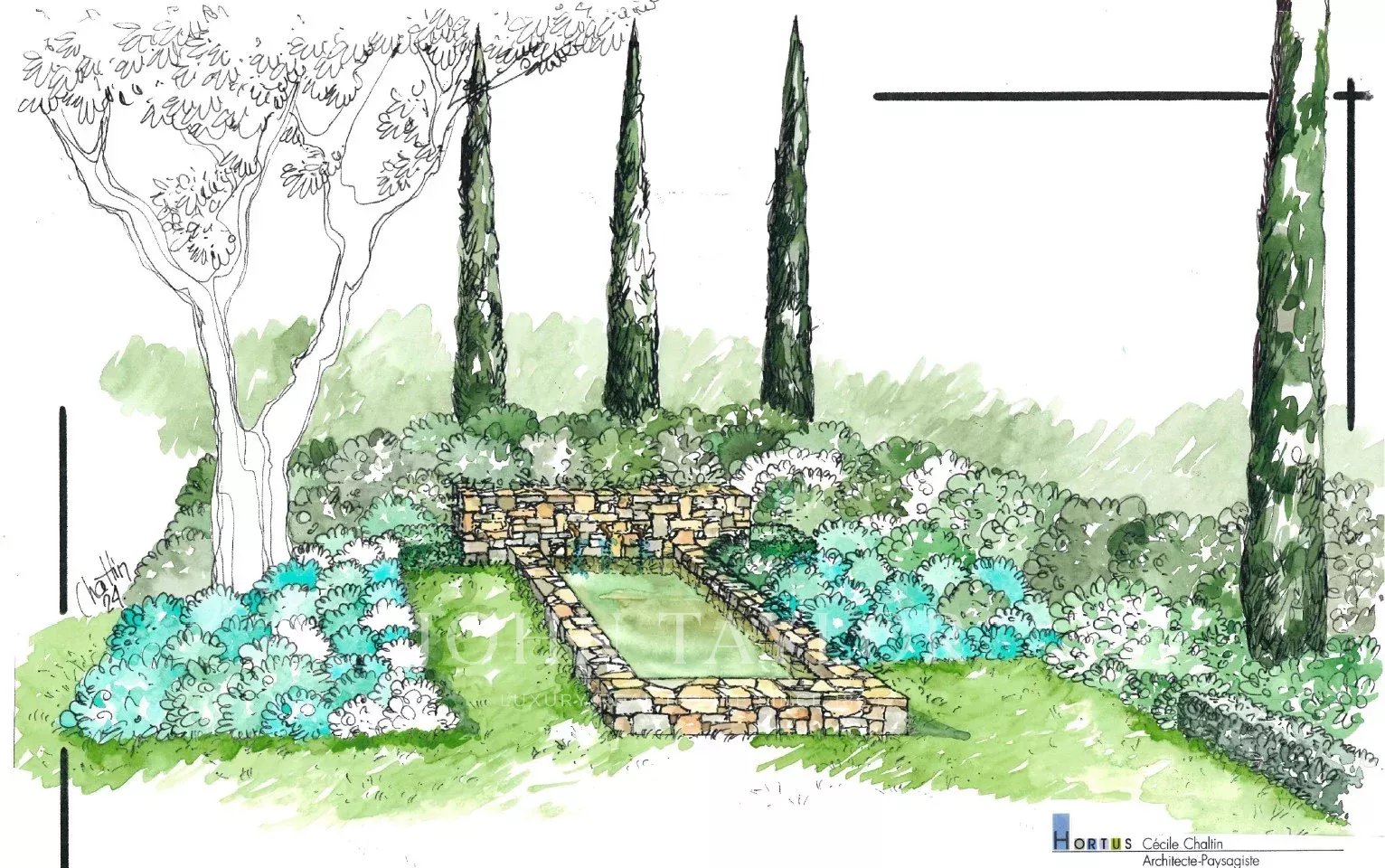 Un grand jardin plat avec un bassin en pierre d'agrément ..