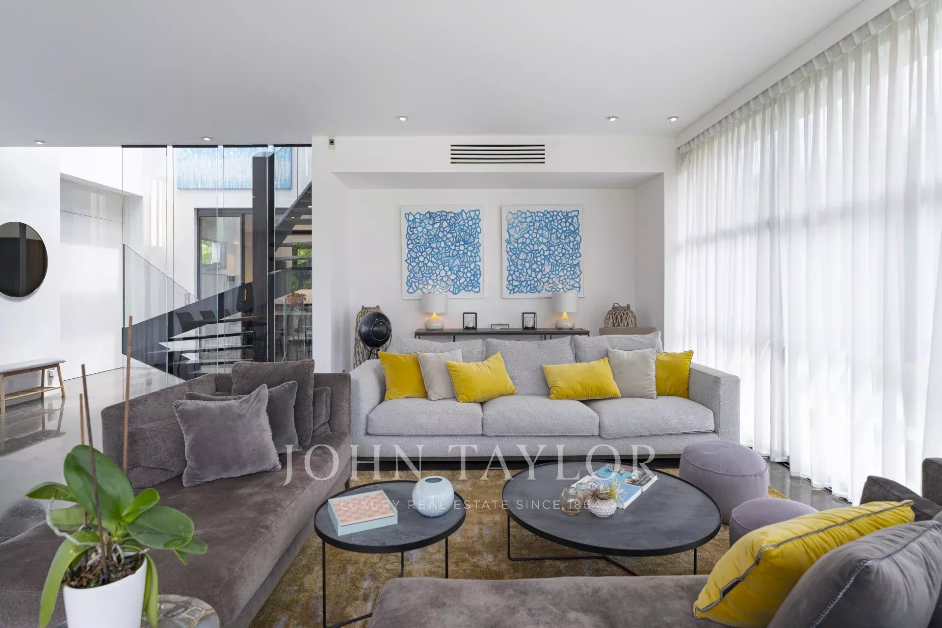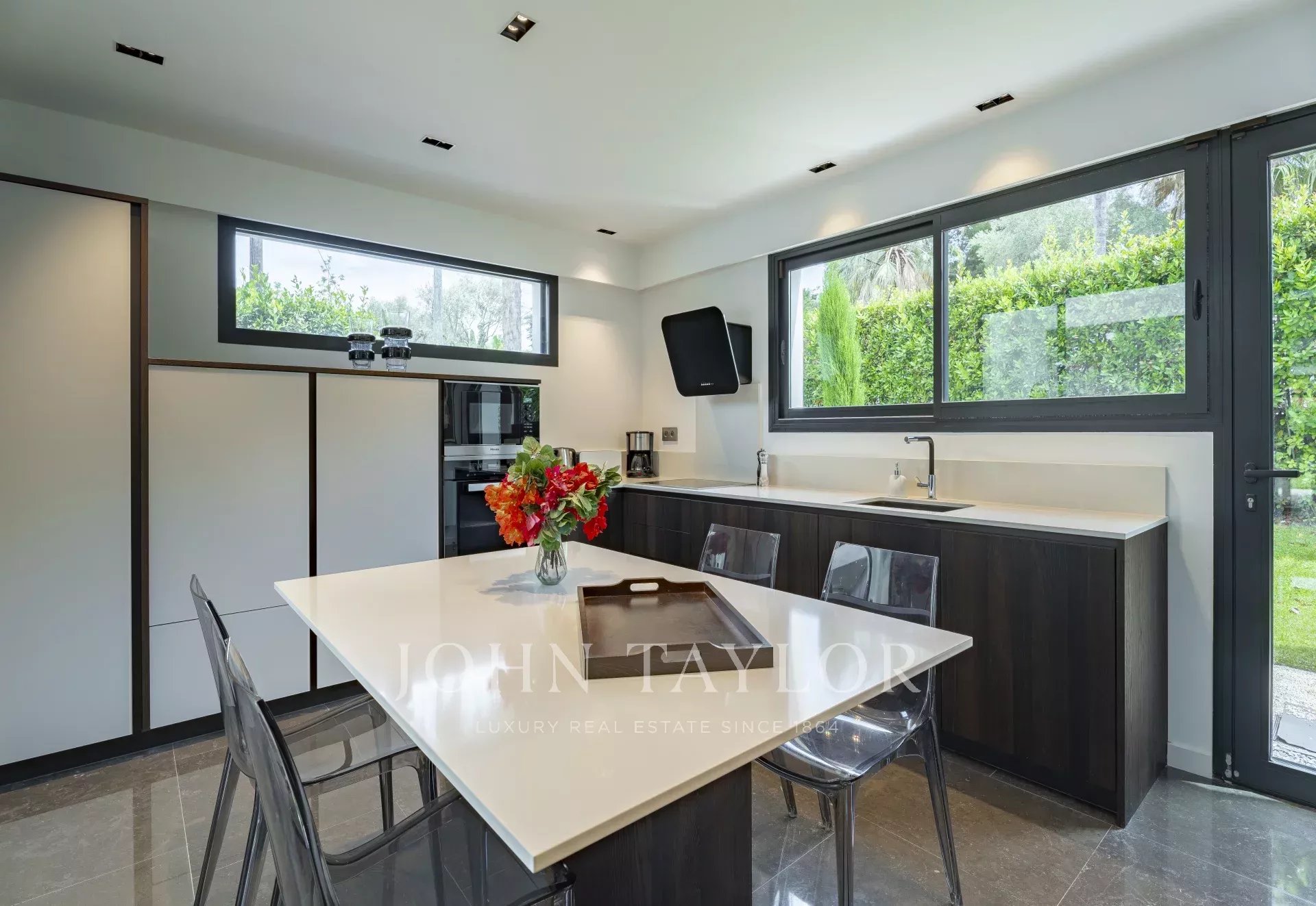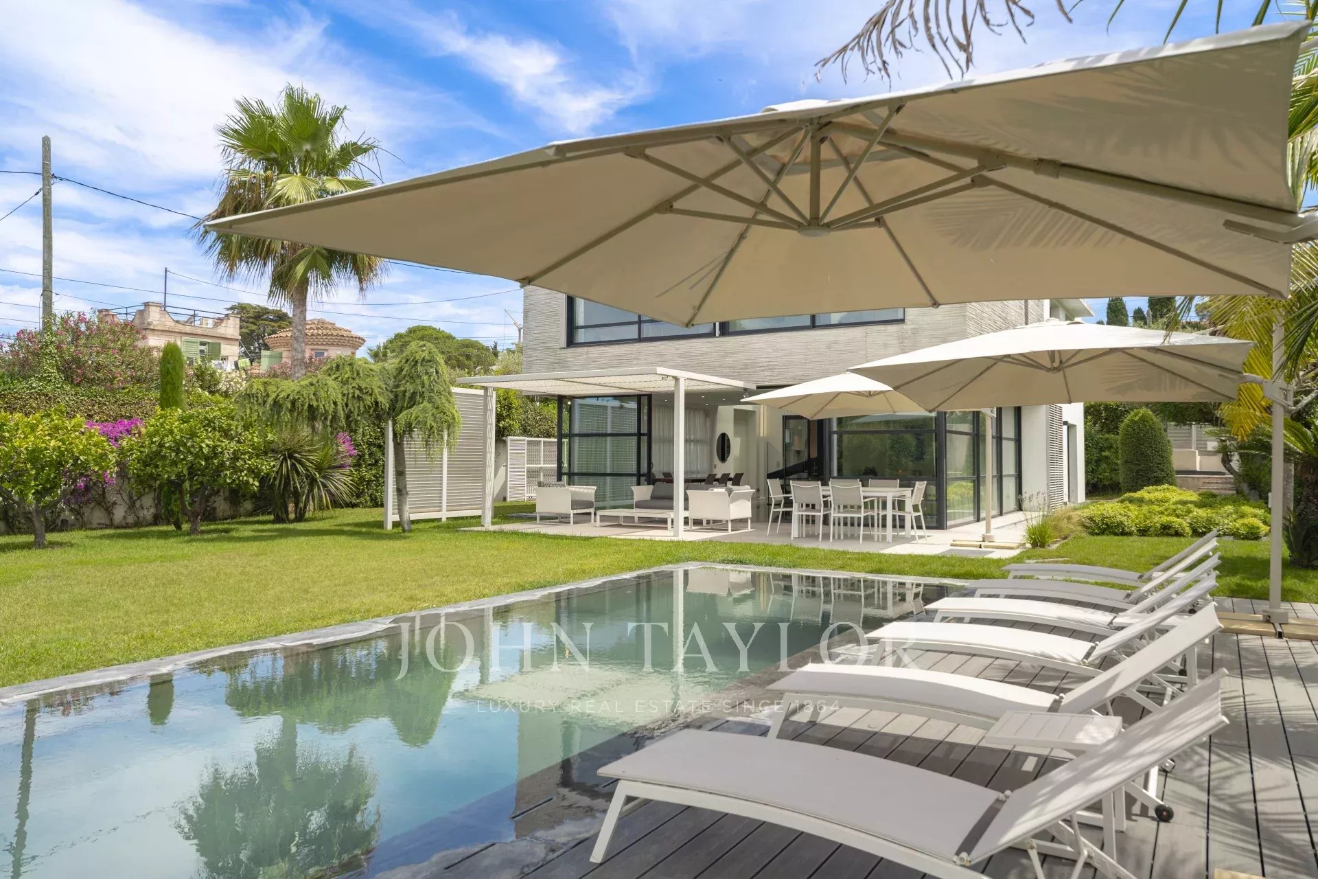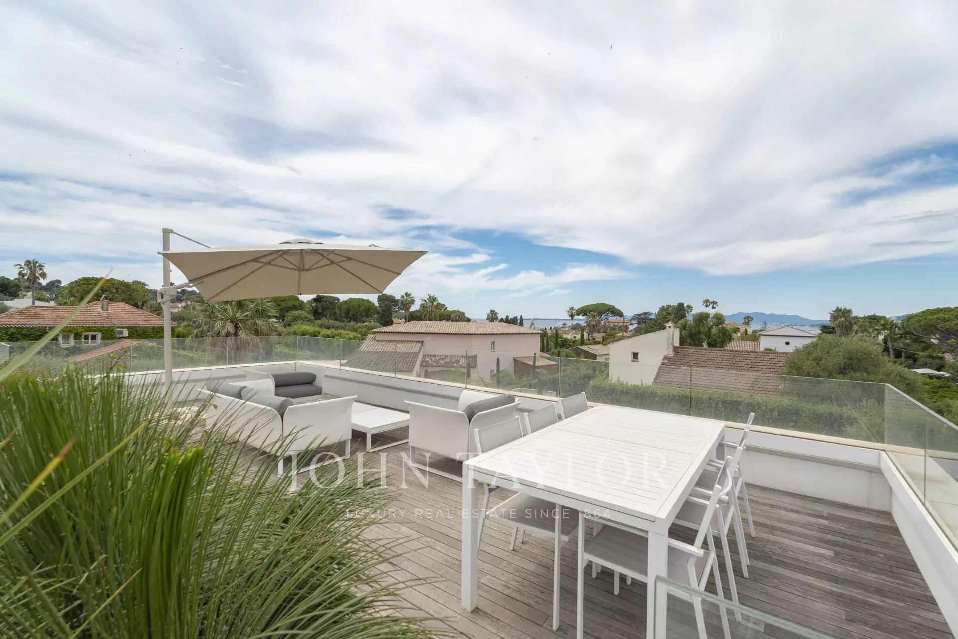 Belle villa contemporaine terminée à l'été 2020, offrant 320 m² de surface habitable au coeur d'un terrain de 940 m² et bénéficiant de belles vues sur la mer (la baie de Juan les Pins et les Iles de Lerins) depuis son toit-terrasse/solarium.