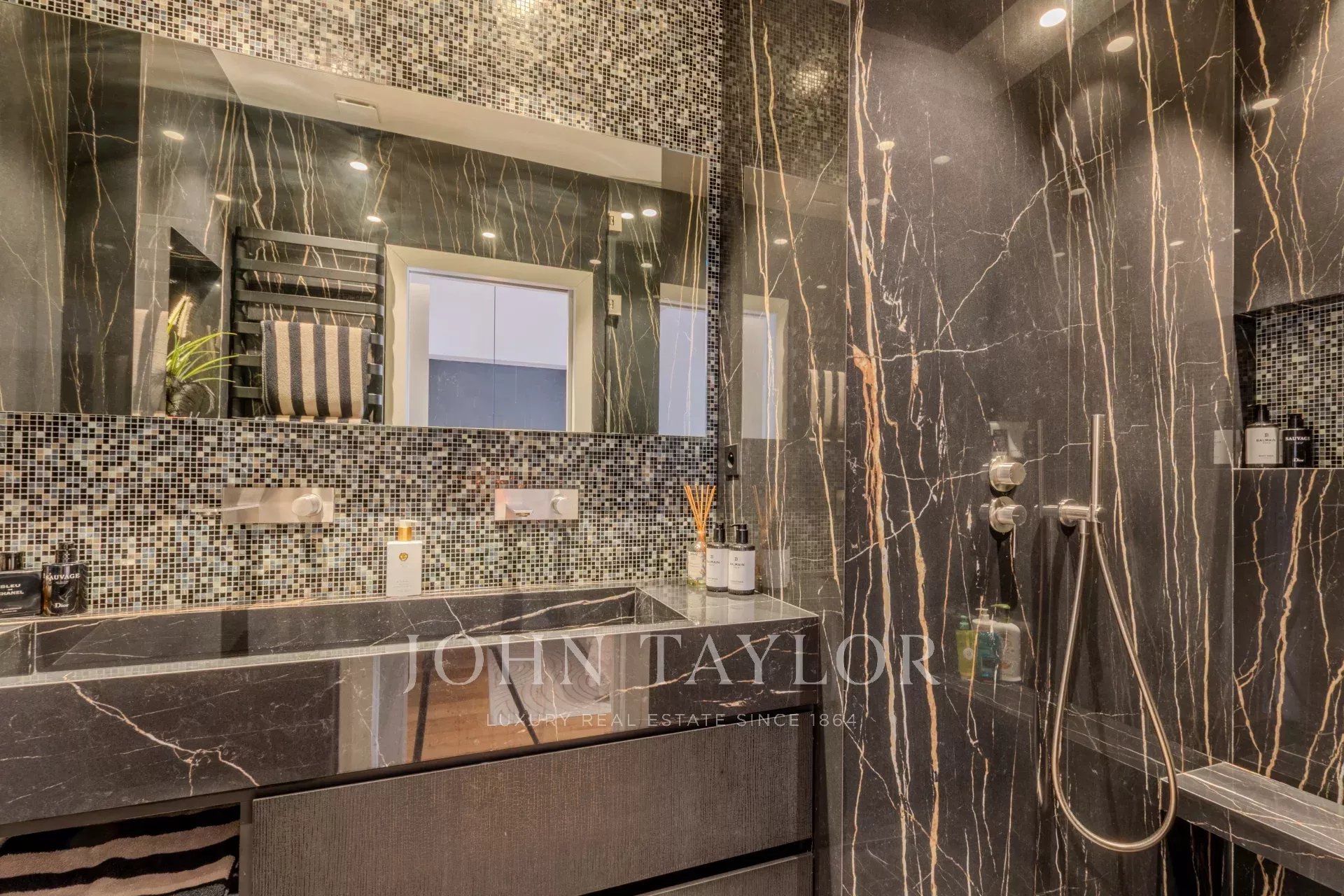 Une entrée, séjour avec cuisine américaine, WC, dégagement donnant sur deux chambre en suite avec salle de douche.