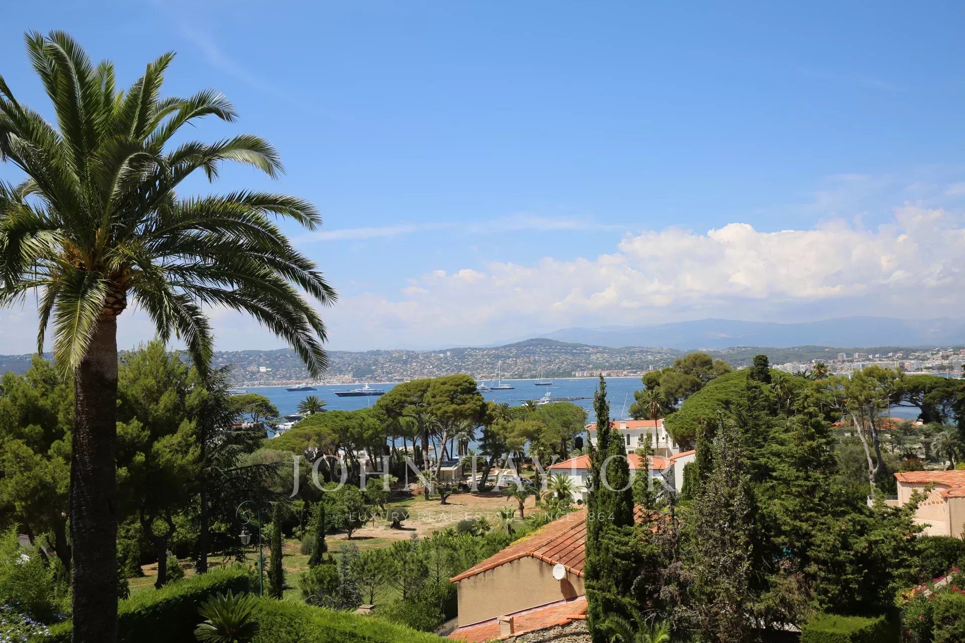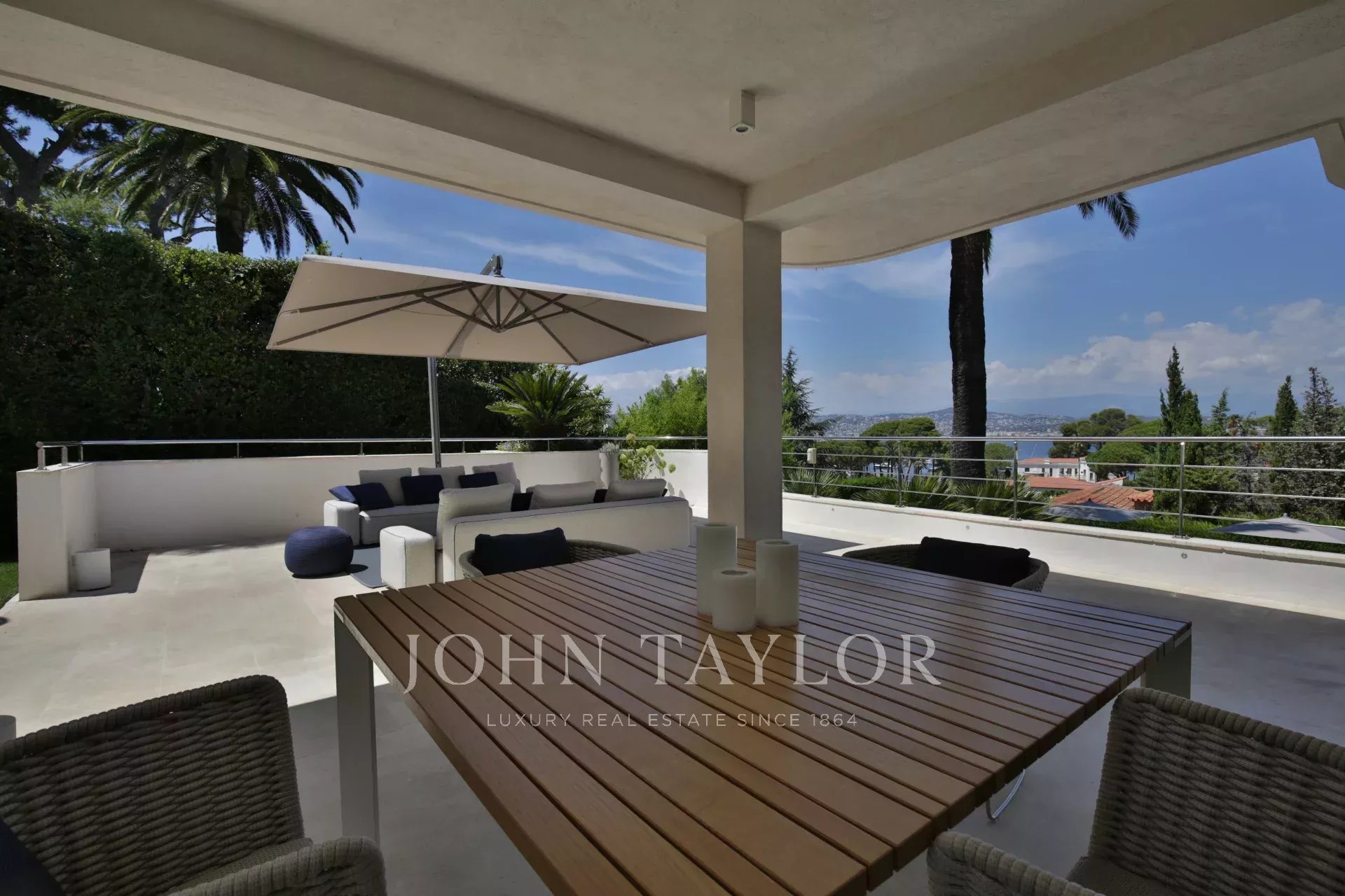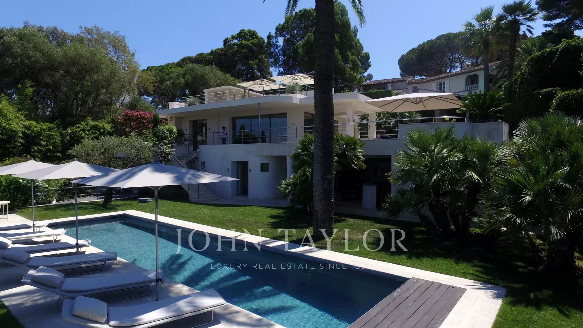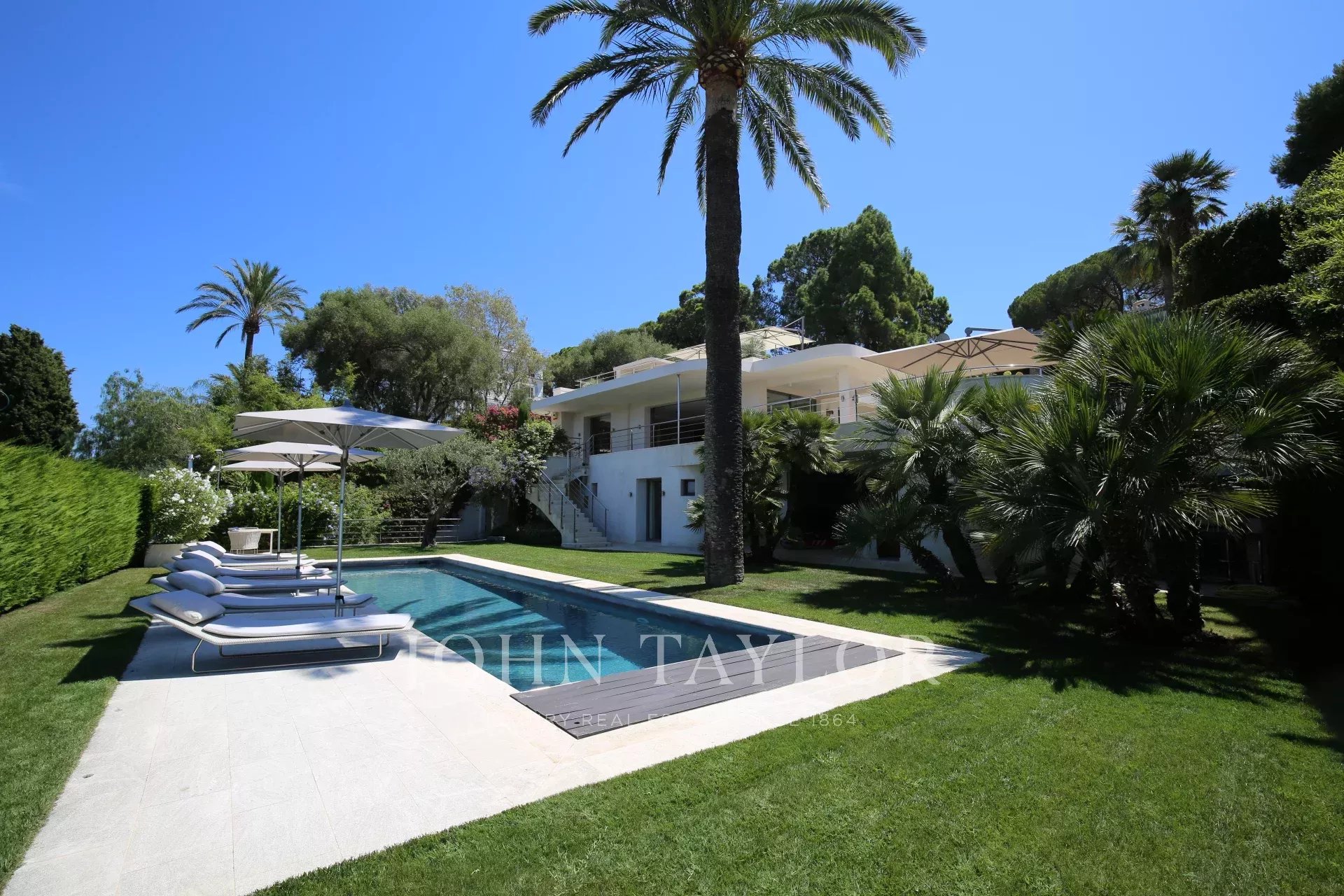 Au Cap d'Antibes, sur le versant ouest dans un domaine fermé et au calme, cette villa moderne bénéficie d'une très belle vue sur la baie de Juan-les-Pins.