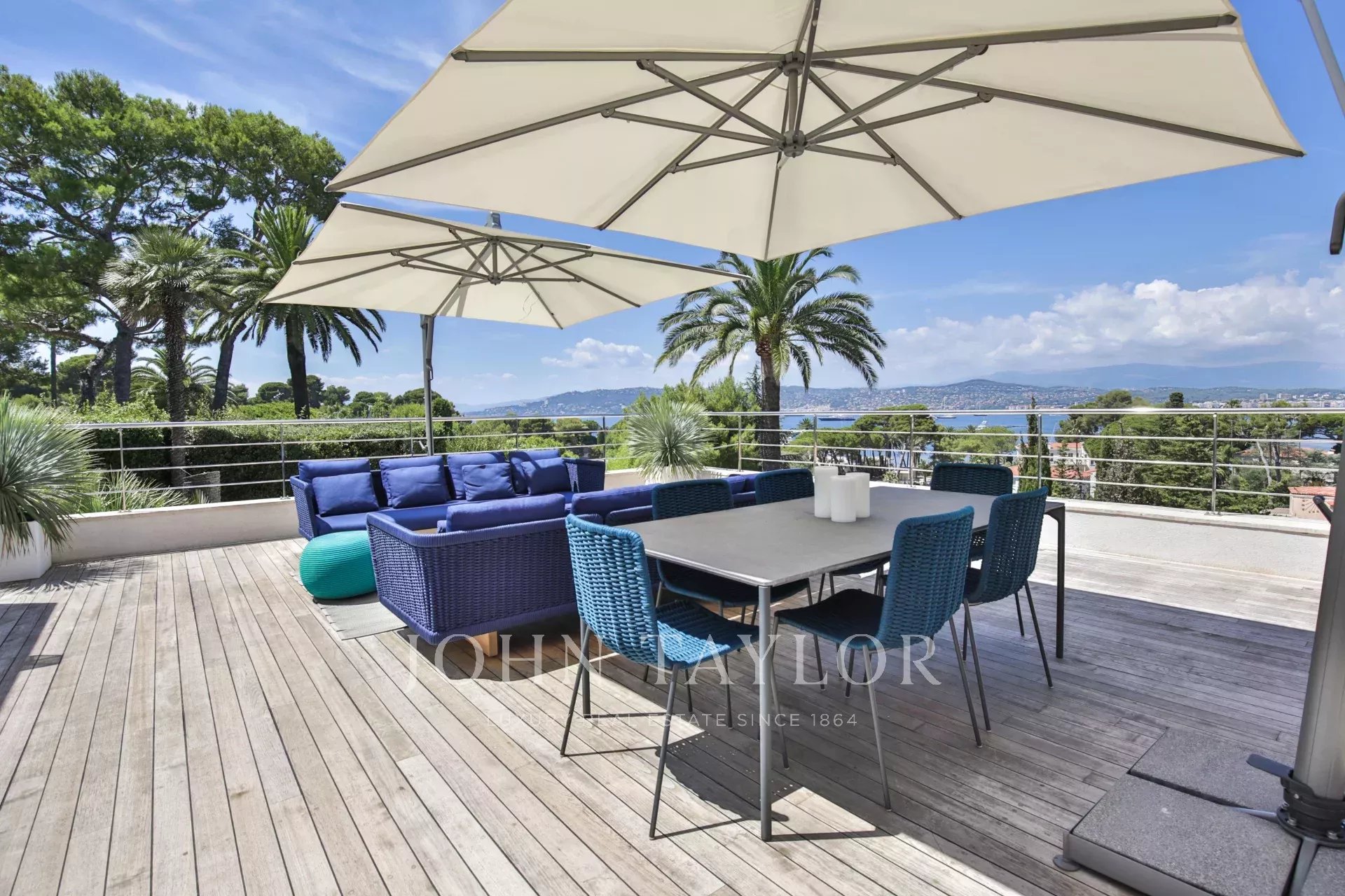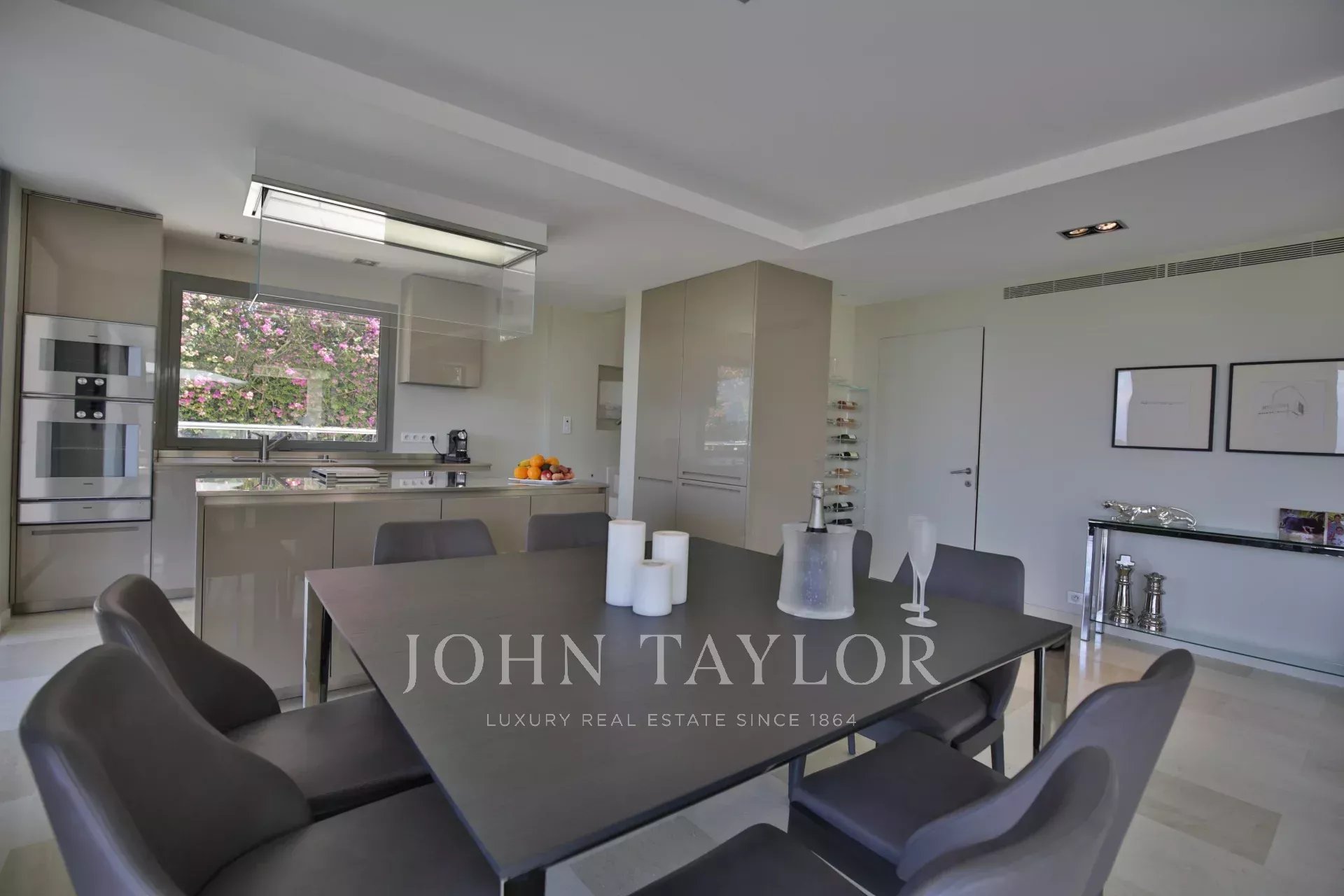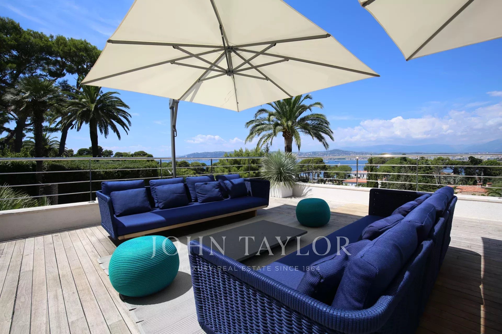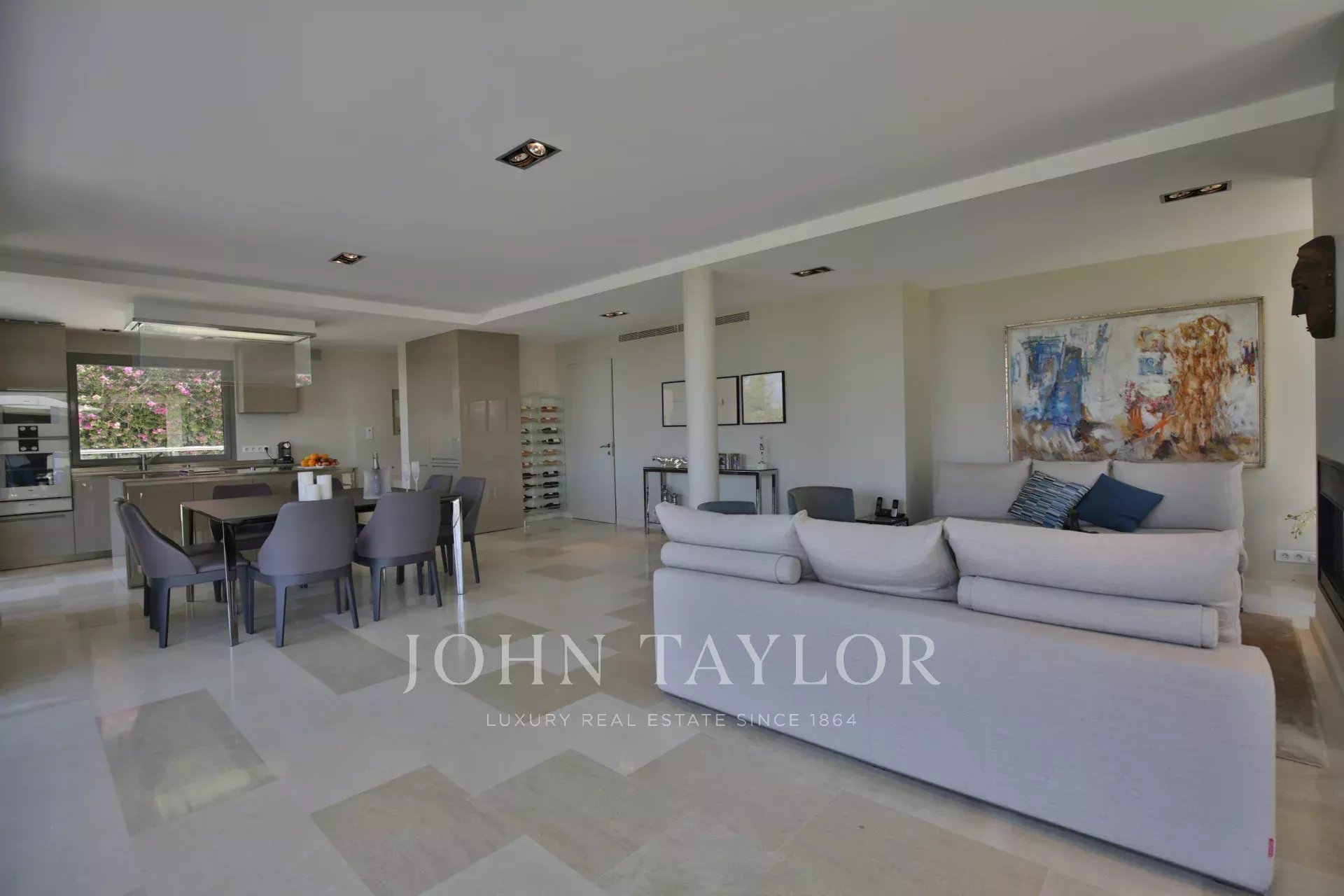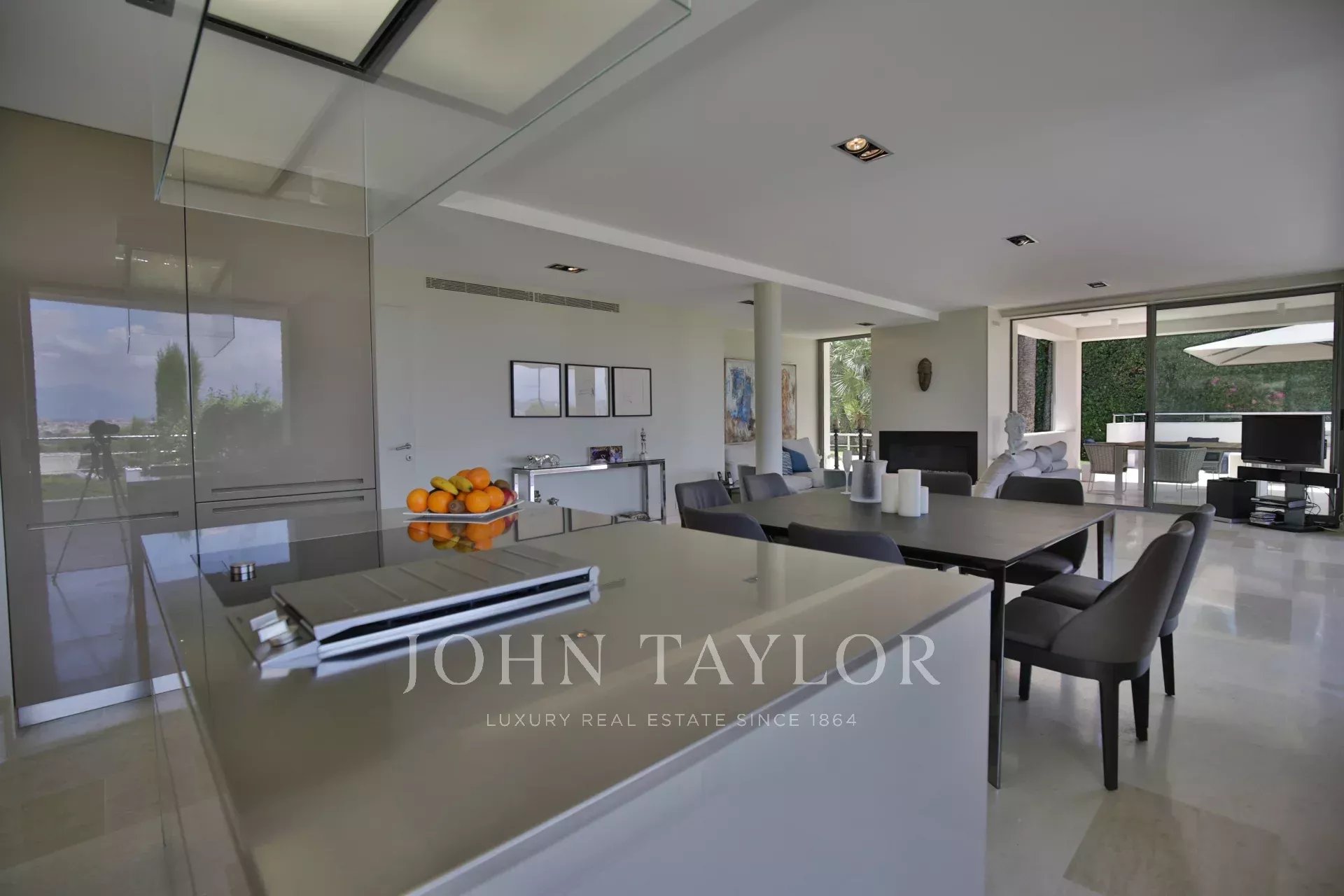 Au Cap d'Antibes, sur le versant ouest dans un domaine fermé et au calme, cette villa moderne bénéficie d'une très belle vue sur la baie de Juan-les-Pins.