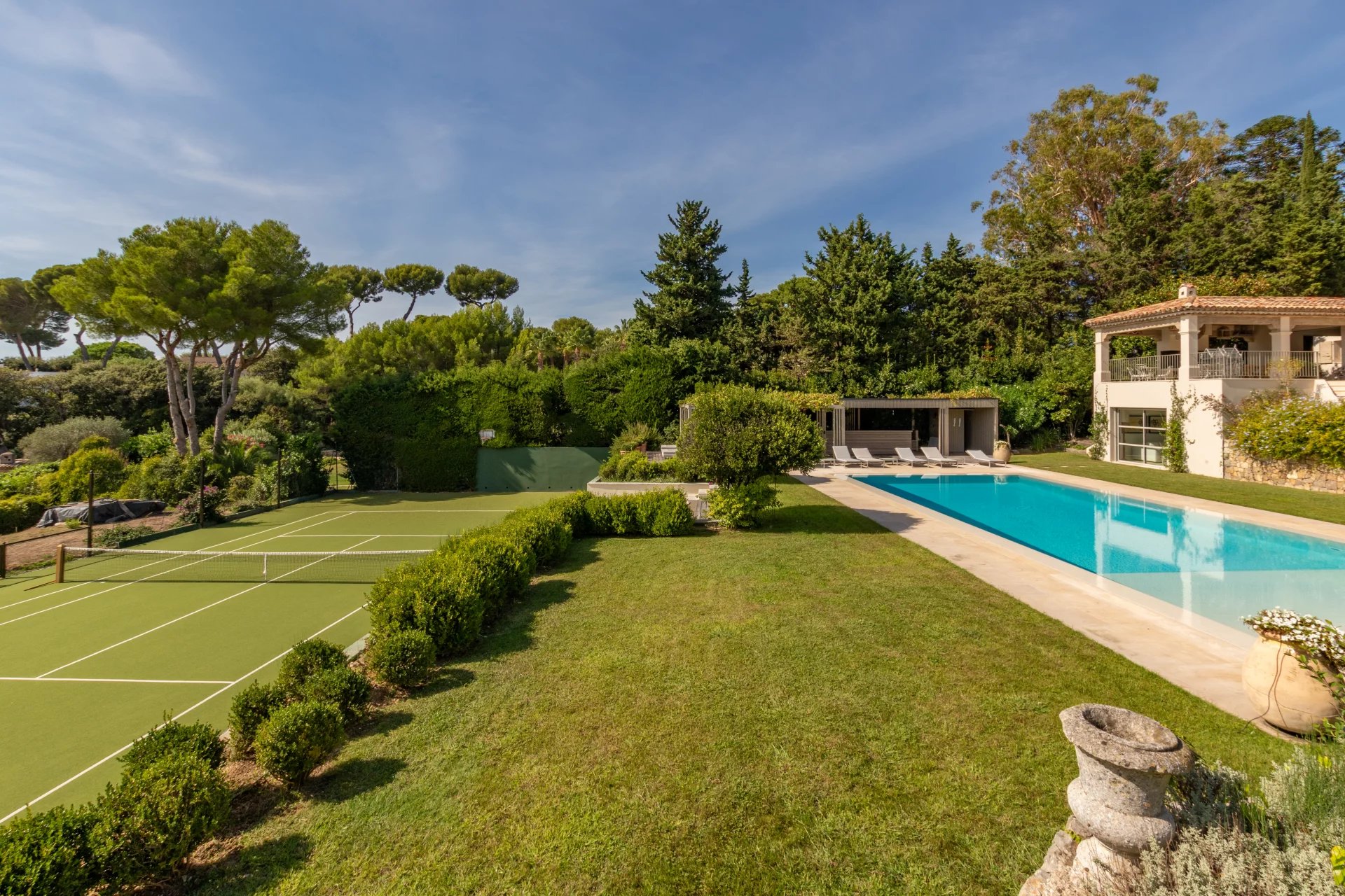 D'une surface habitable de 570 m² sur une parcelle de terrain de 3840 m² avec une grande piscine à miroir de 20 m et un tennis; elle se compose: