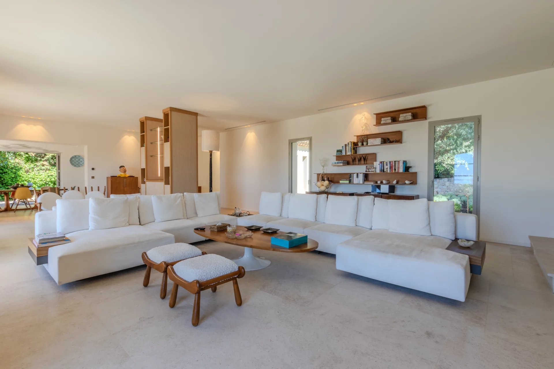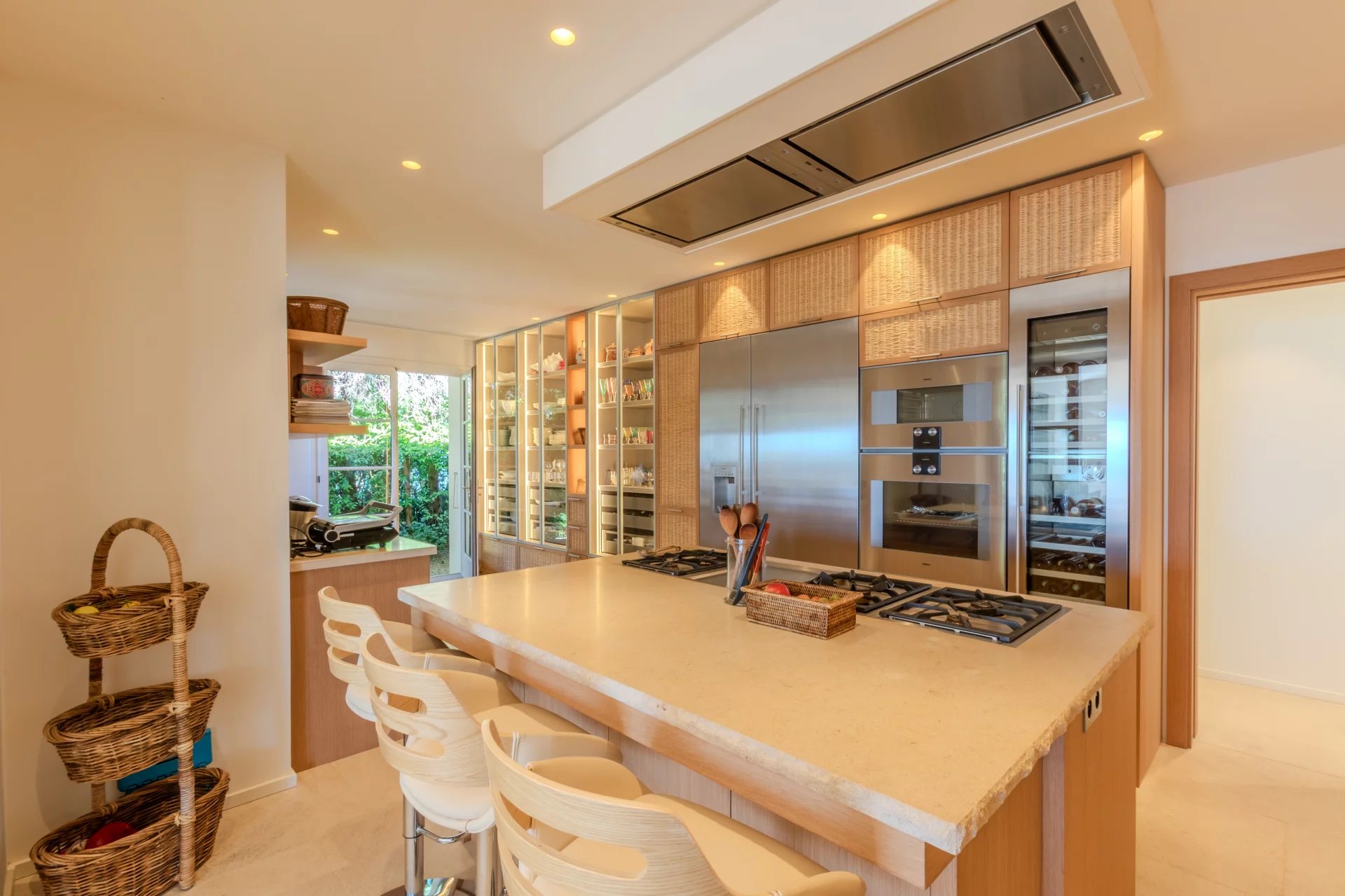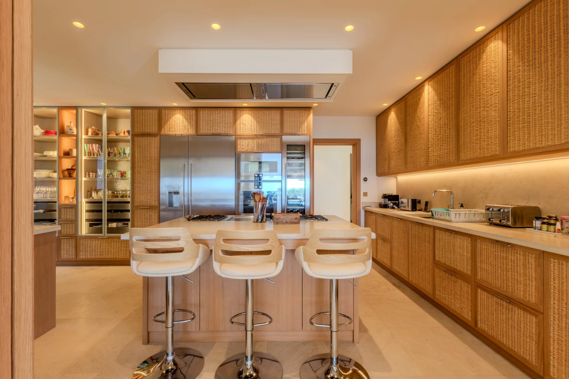 Un hall d'entrée, une WC invité, un grand salon sur de larges terrasses, une salle à manger donnant une sur terrasse couverte avec BBQ, une large cuisine équipée, une buanderie avec chambre froide. Un couloir donnant accès à trois chambres en-suite avec salles de bains et placards donnant accès des terrasses.