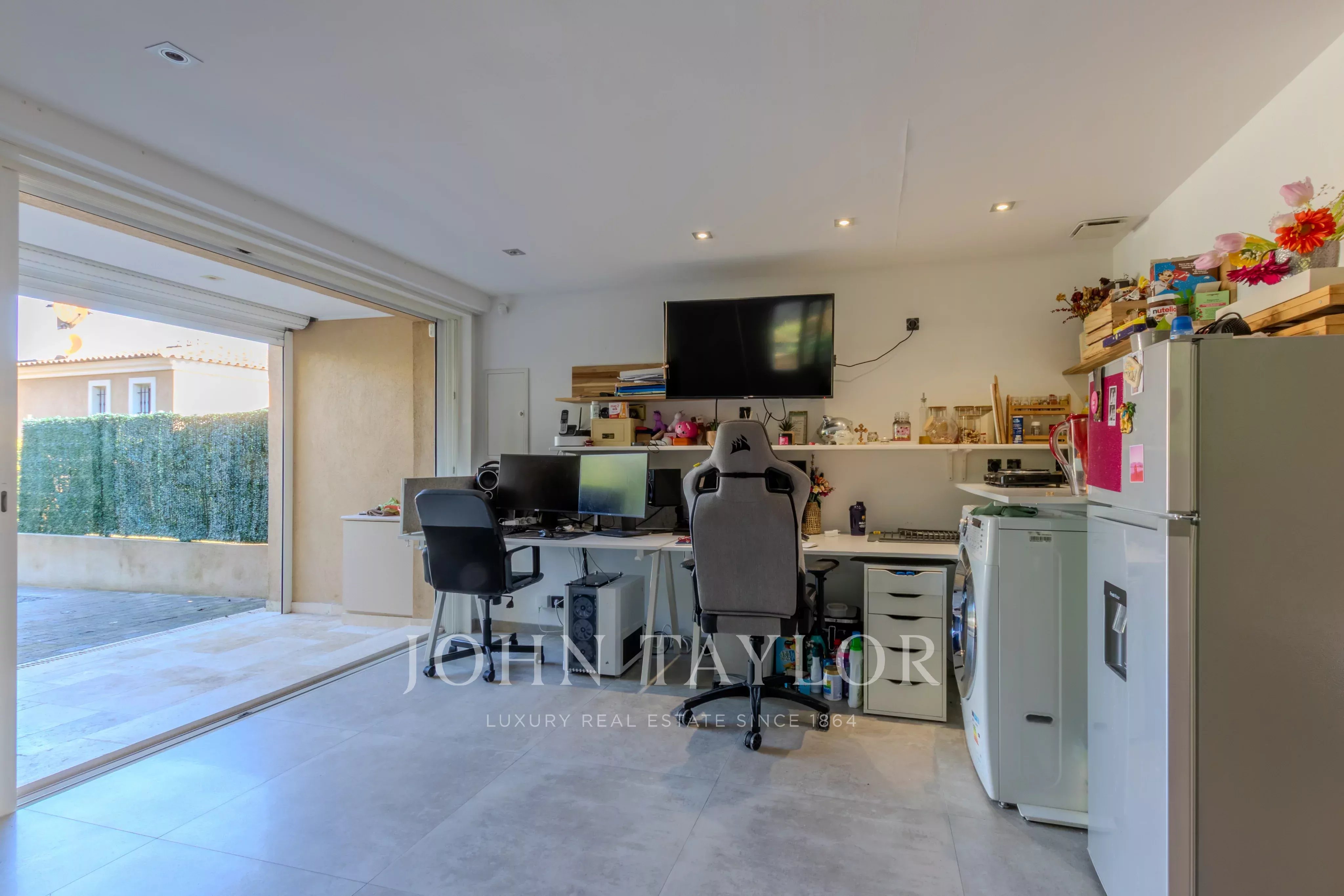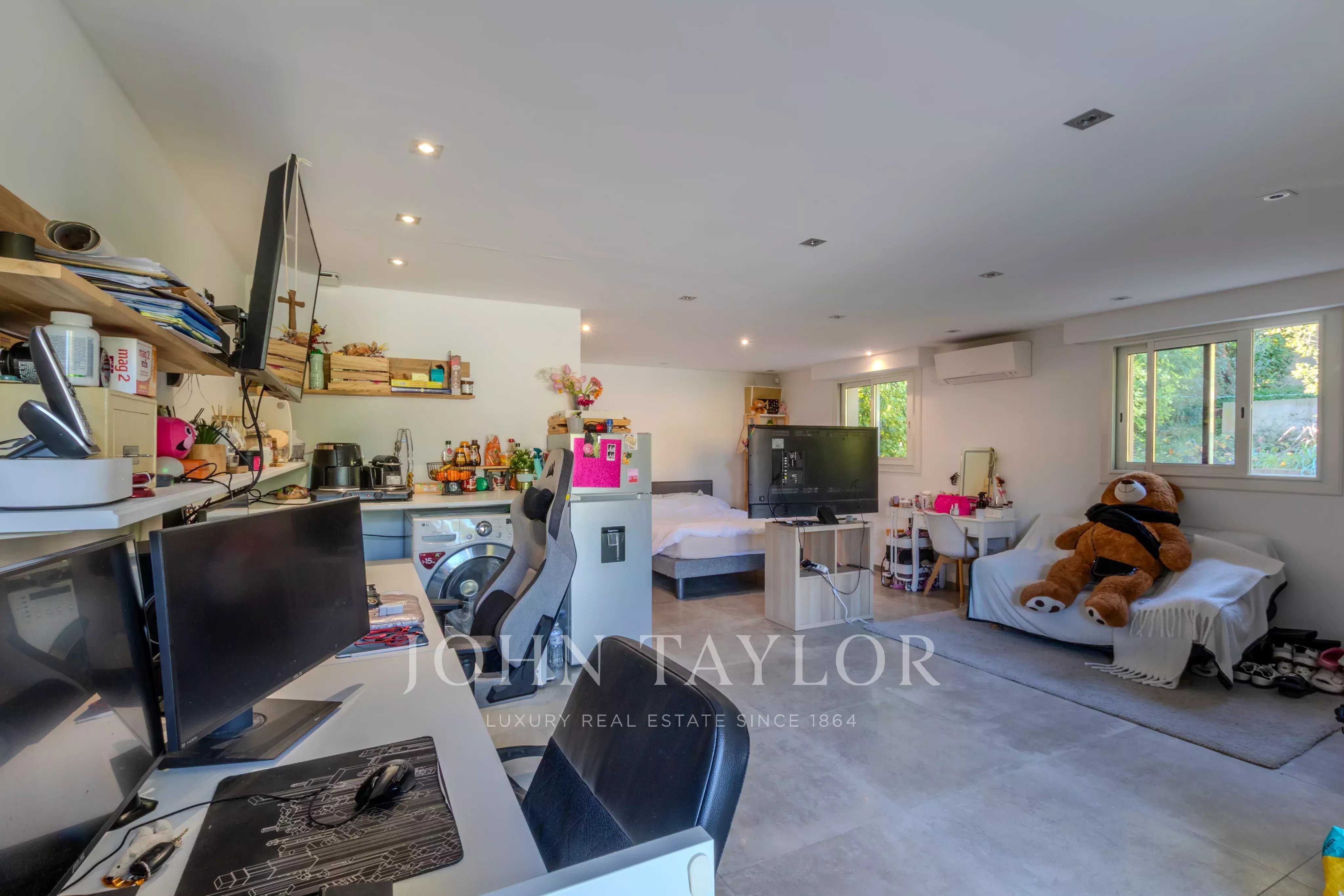 Découvrez cette somptueuse villa de 200 m² avec un studio de 50 m² située à Antibes, offrant un confort exceptionnel et des équipements modernes. La propriété dispose de trois chambres dont une master bedroom très spacieuse et de six pièces au total, toutes climatisées pour un confort optimal toute l'année. Profitez de la lumière naturelle à travers les fenêtres coulissantes et appréciez l'élégance des volets roulants électriques.