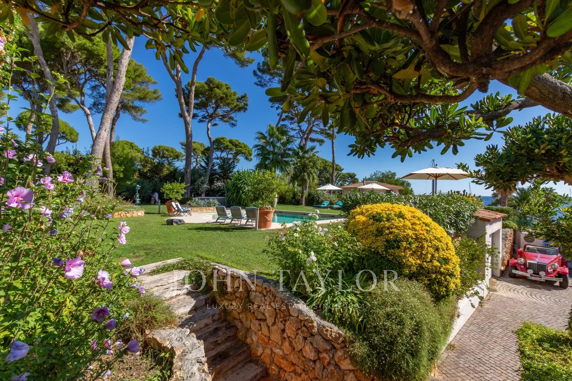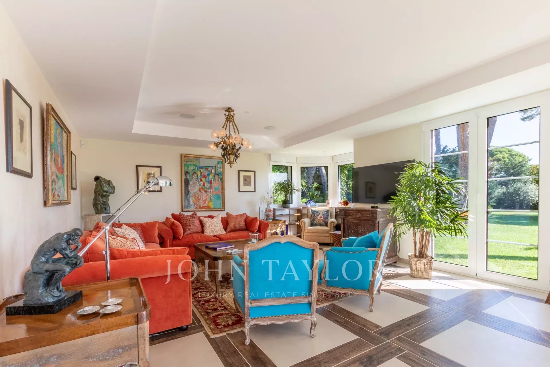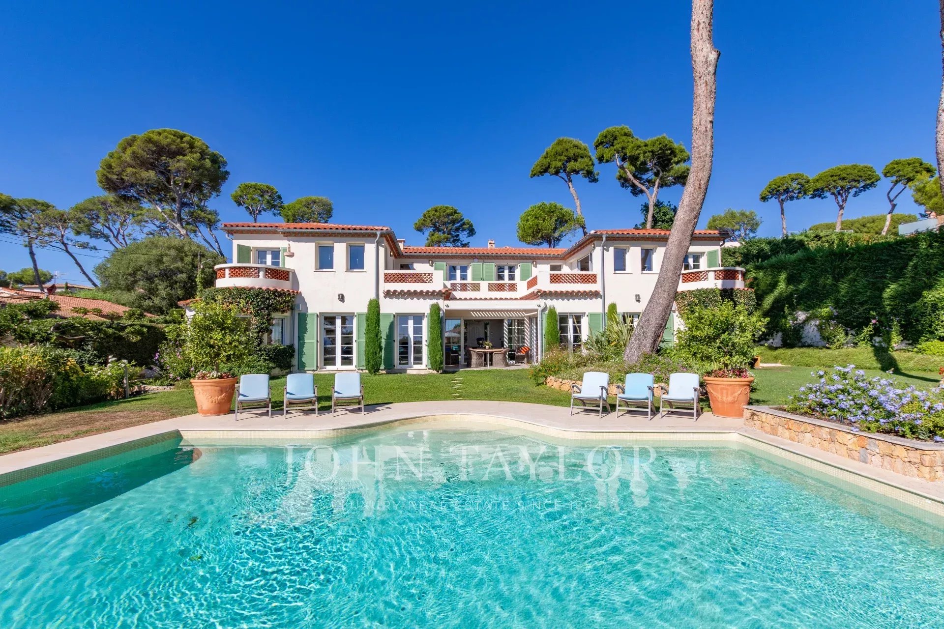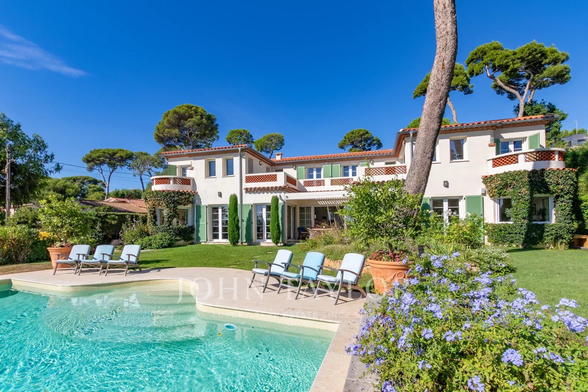 Proche des plages de la Garoupe, belle villa sur deux niveaux et un sous sol pour une surface totale de 335 m² entièrement climatisée au cœur d’un terrain de 1 573 m2 bénéficiant de très jolies vues sur la mer.
