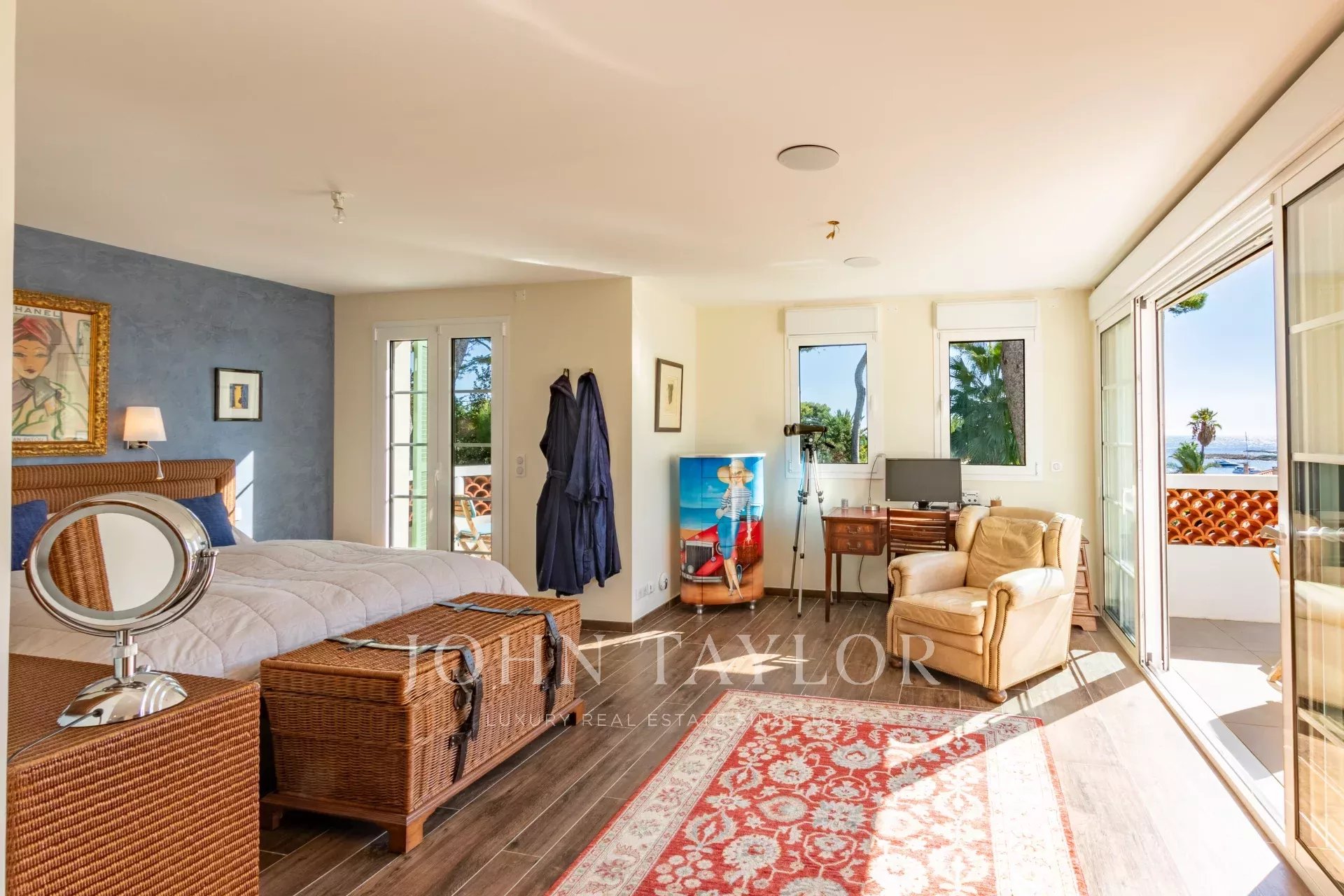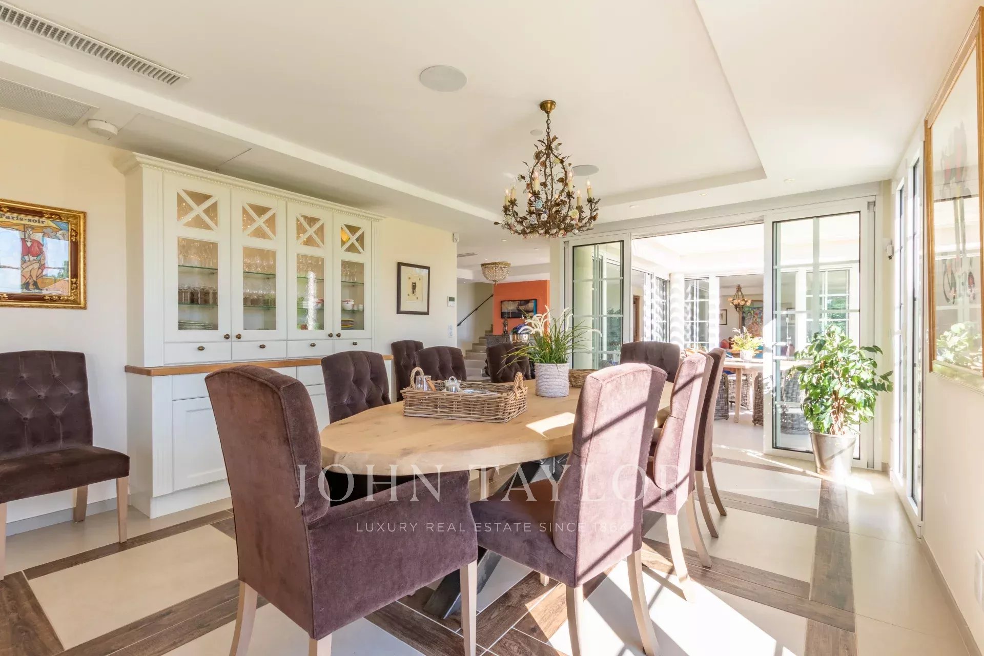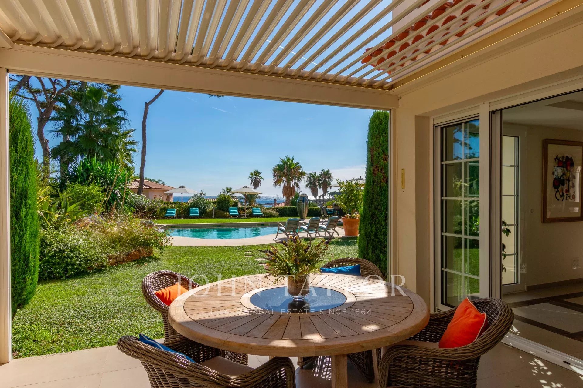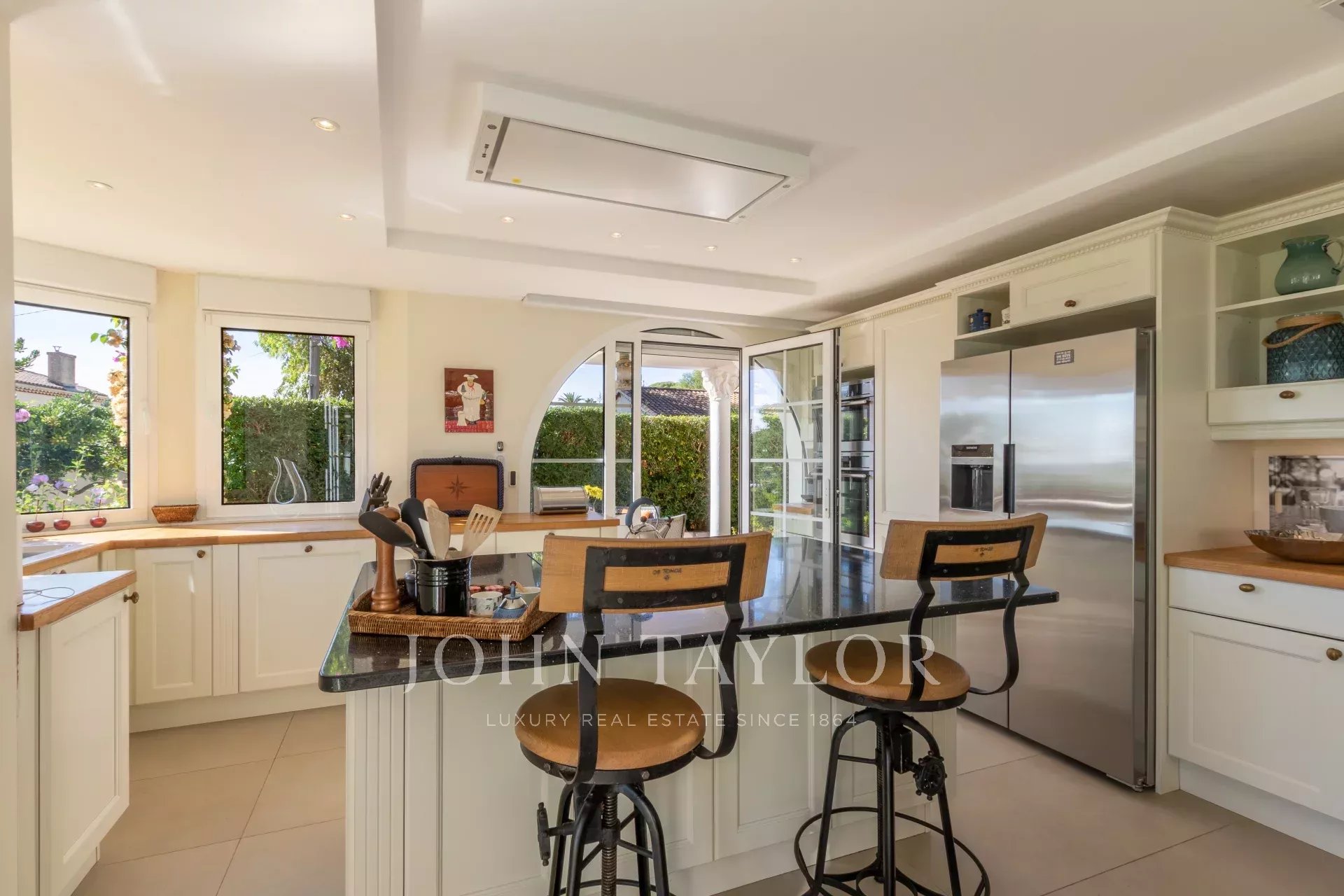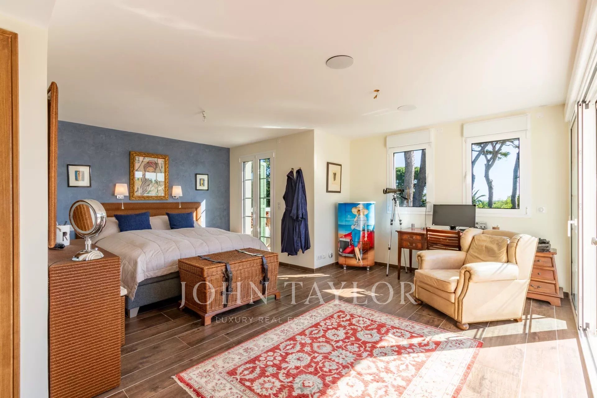 Proche des plages de la Garoupe, belle villa sur deux niveaux et un sous sol pour une surface totale de 335 m² entièrement climatisée au cœur d’un terrain de 1 573 m2 bénéficiant de très jolies vues sur la mer.