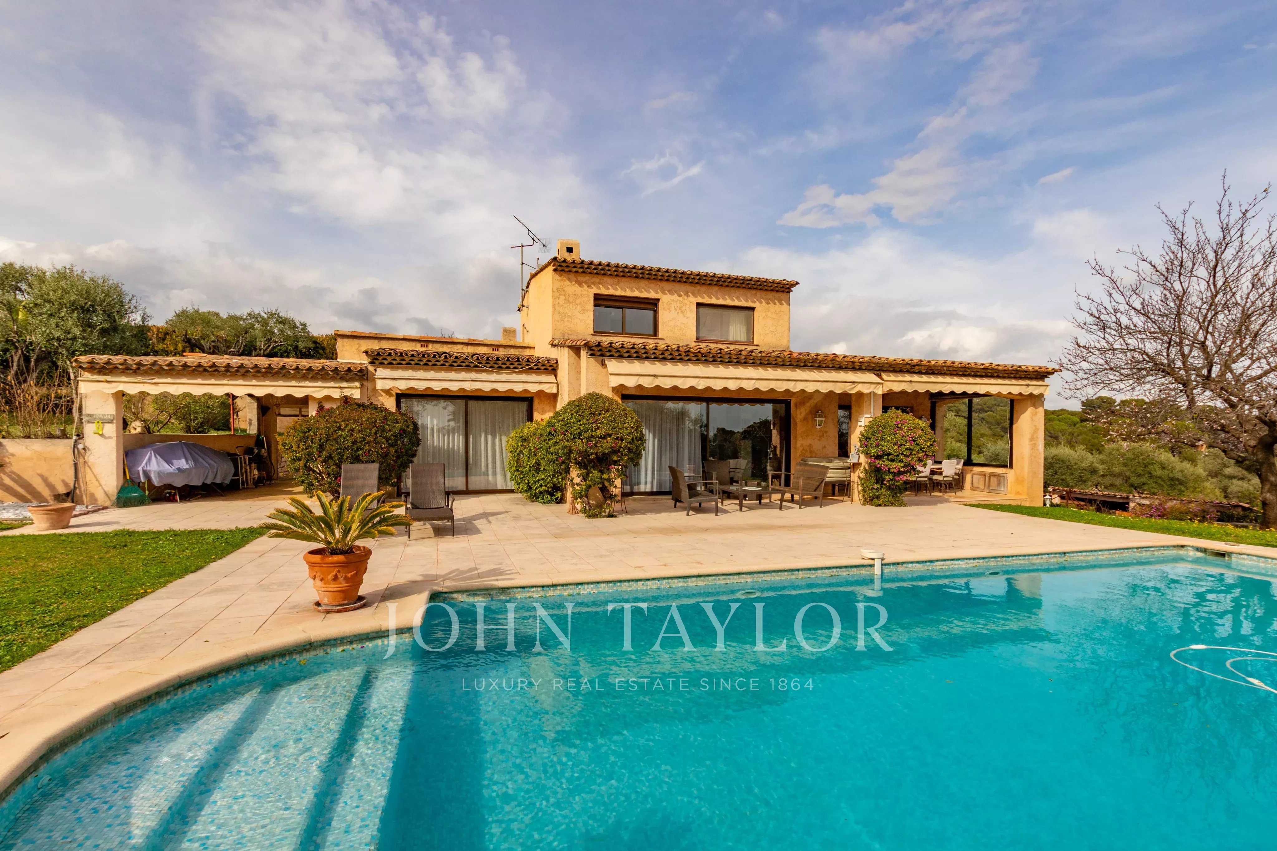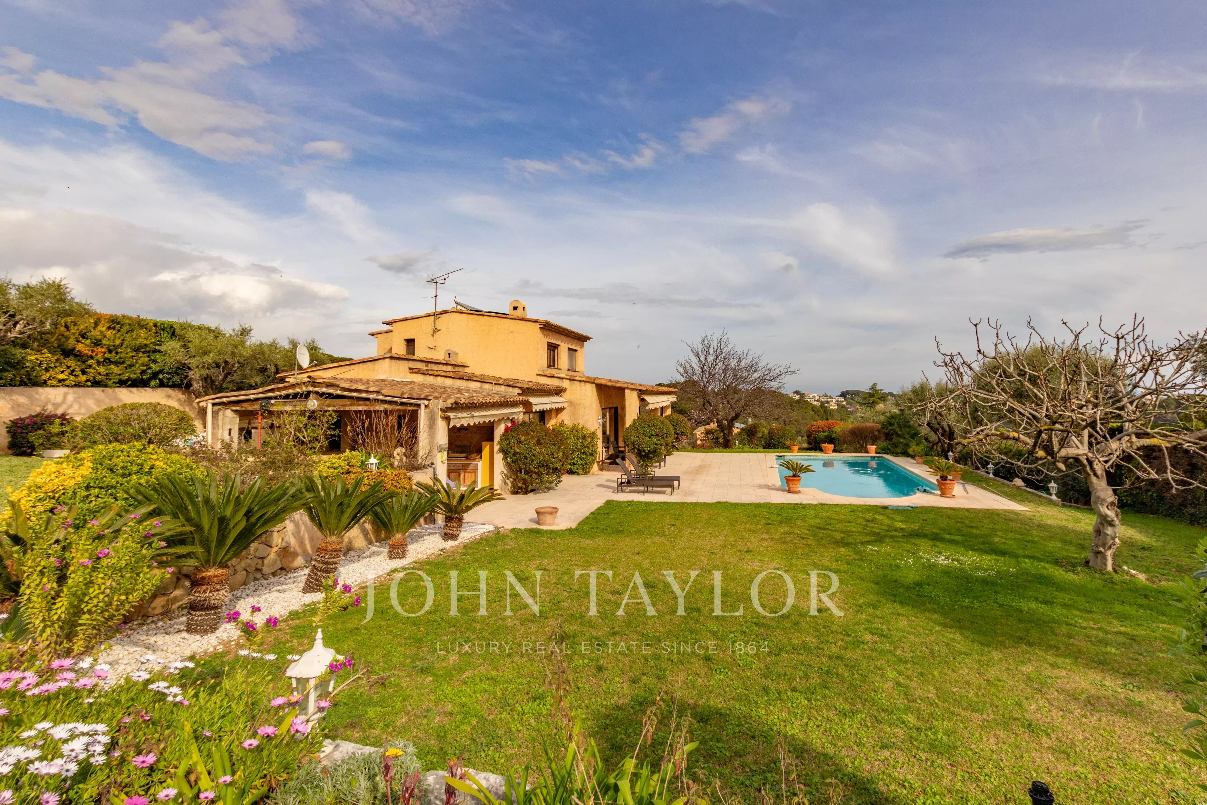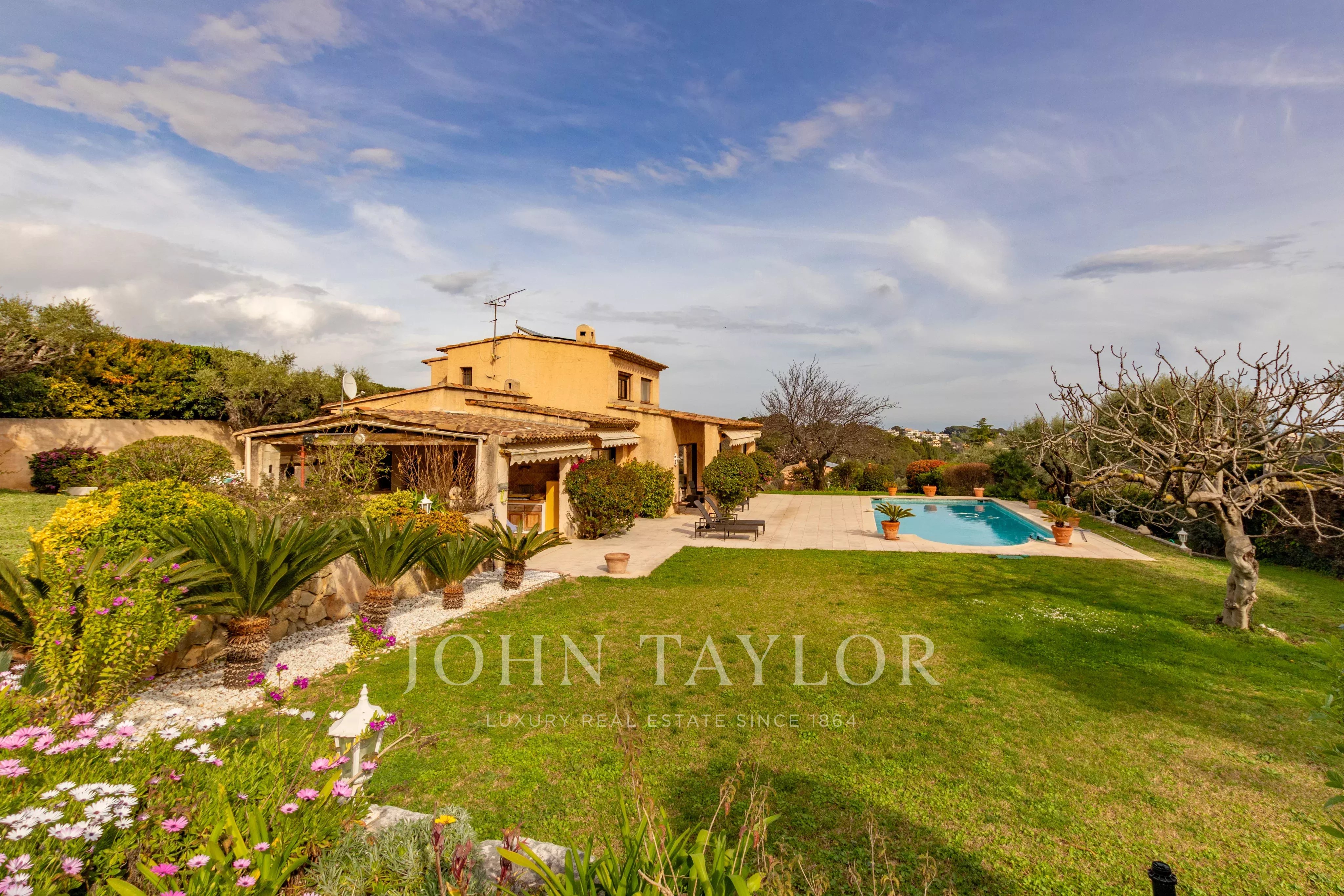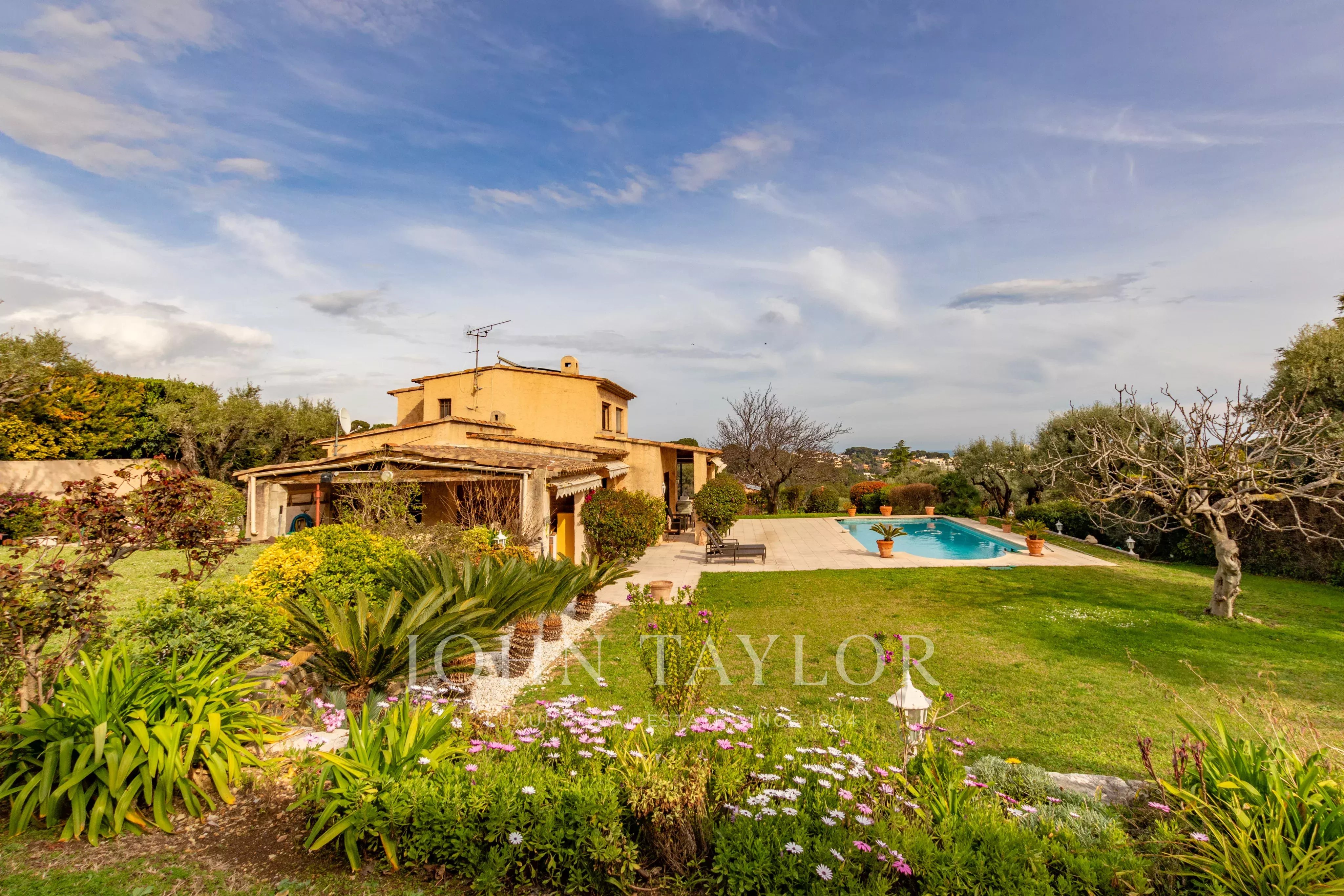 Nichée sur les hauteurs d'Antibes avec vue dégagée jusqu'à la mer, cette villa de charme jouit d'une exposition sud généreuse. Les façades dorées, les terrasses orientées sur un jardin magnifiquement arborisé avec oliviers productifs, abricotiers et arbre à citron, invitent à profiter pleinement du climat méditerranéen. La piscine bien exposée, la cuisine d'été et l'accès direct à la terrasse depuis le salon complètent ce cadre de vie exceptionnel.