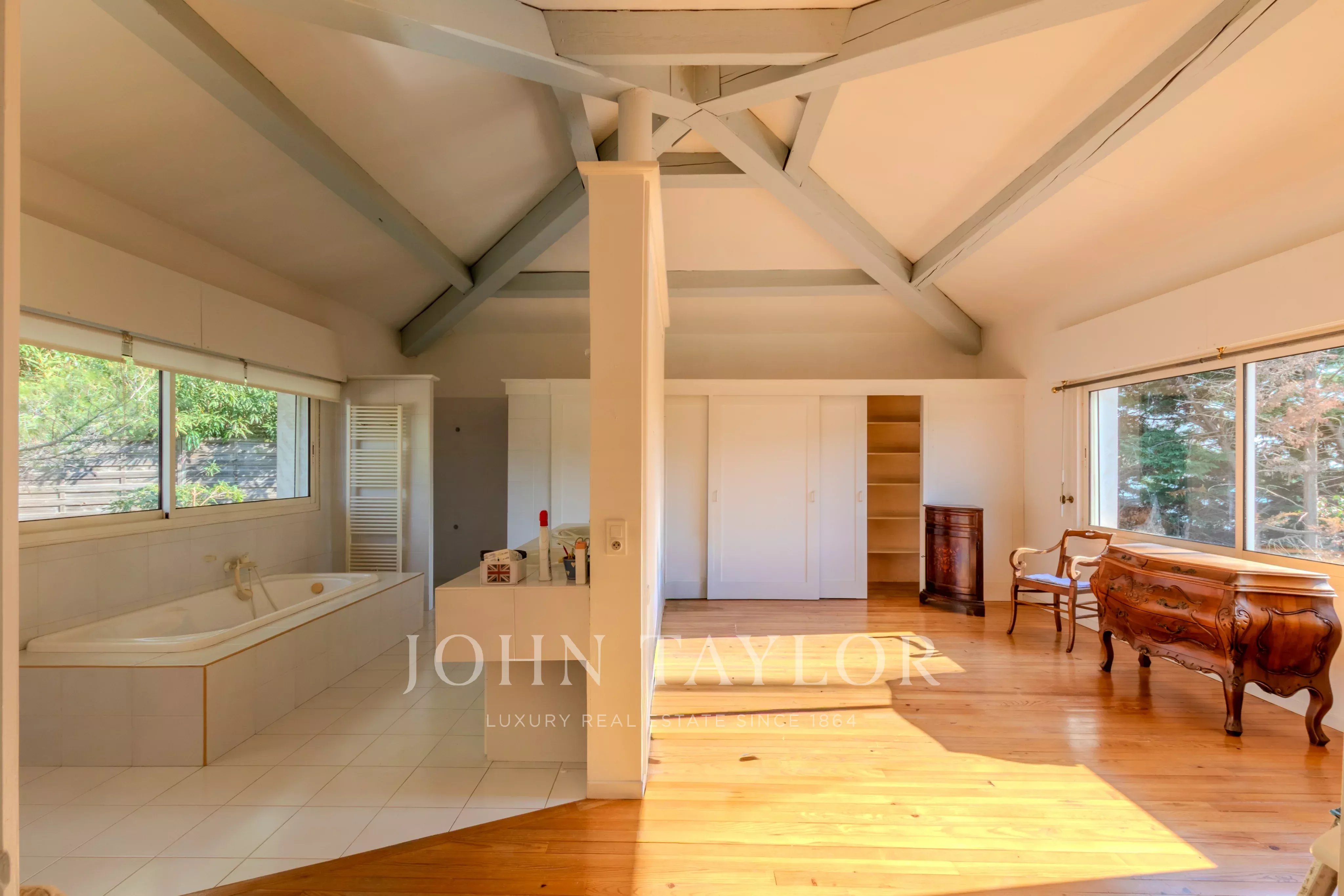 À l'étage, une magnifique suite parentale d'environ 40 m² profite d'une exposition sud-ouest et d'une vue dégagée. Elle est équipée de placards de rangement et d'une élégante salle de bains avec douche et doubles vasques.