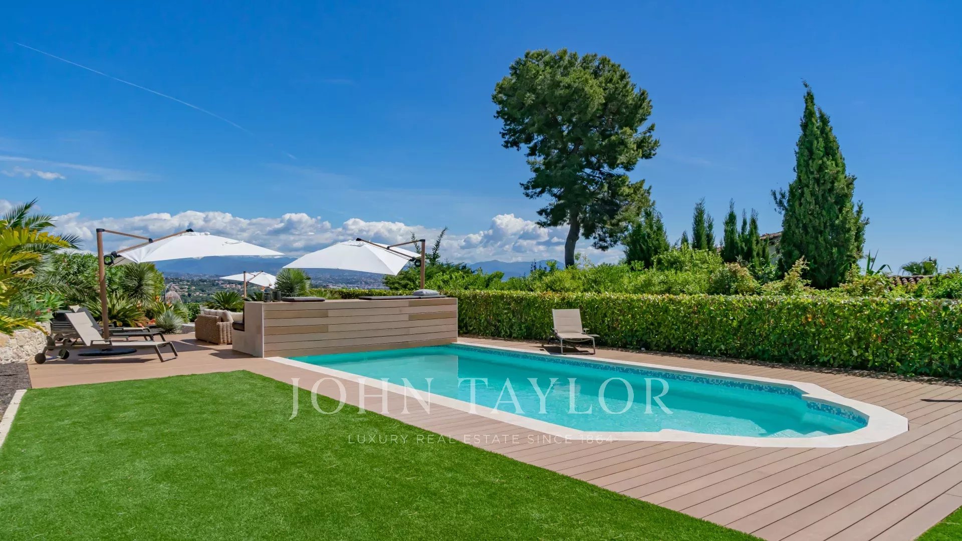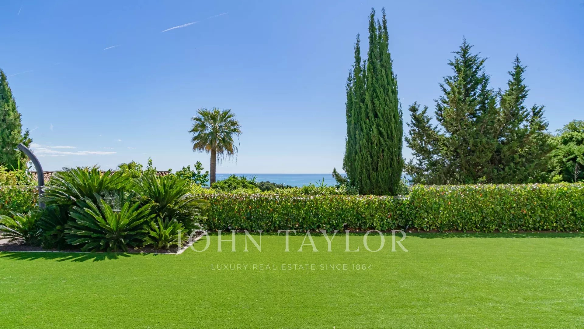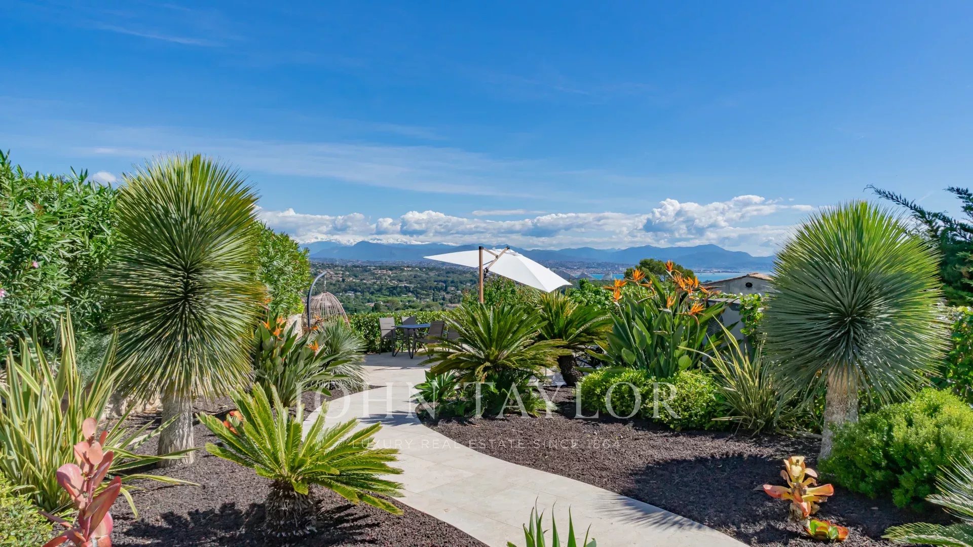 À l’extérieur : un jardin méditerranéen avec arrosage automatique, une vaste terrasse autour de la piscine (volet roulant), une seconde terrasse avec terrain de boules et une vue panoramique mer et montagnes. Un petit verger complète l’ensemble.