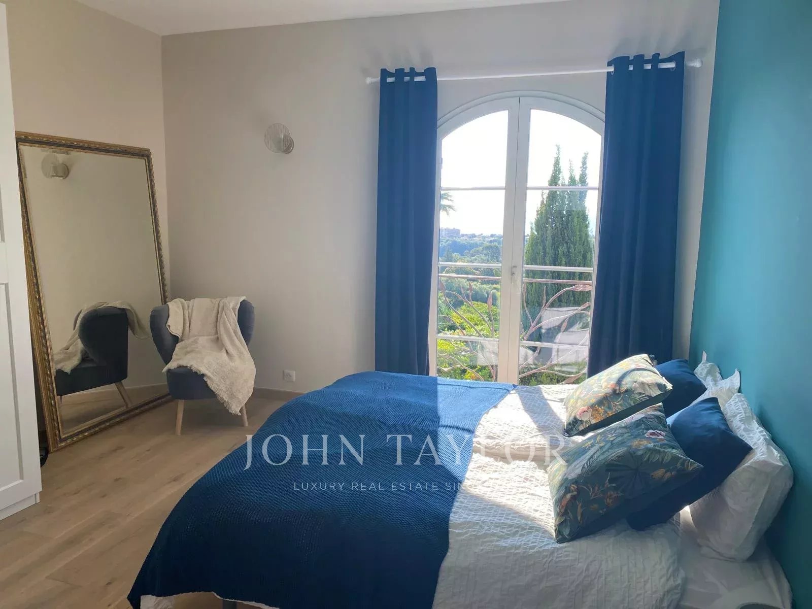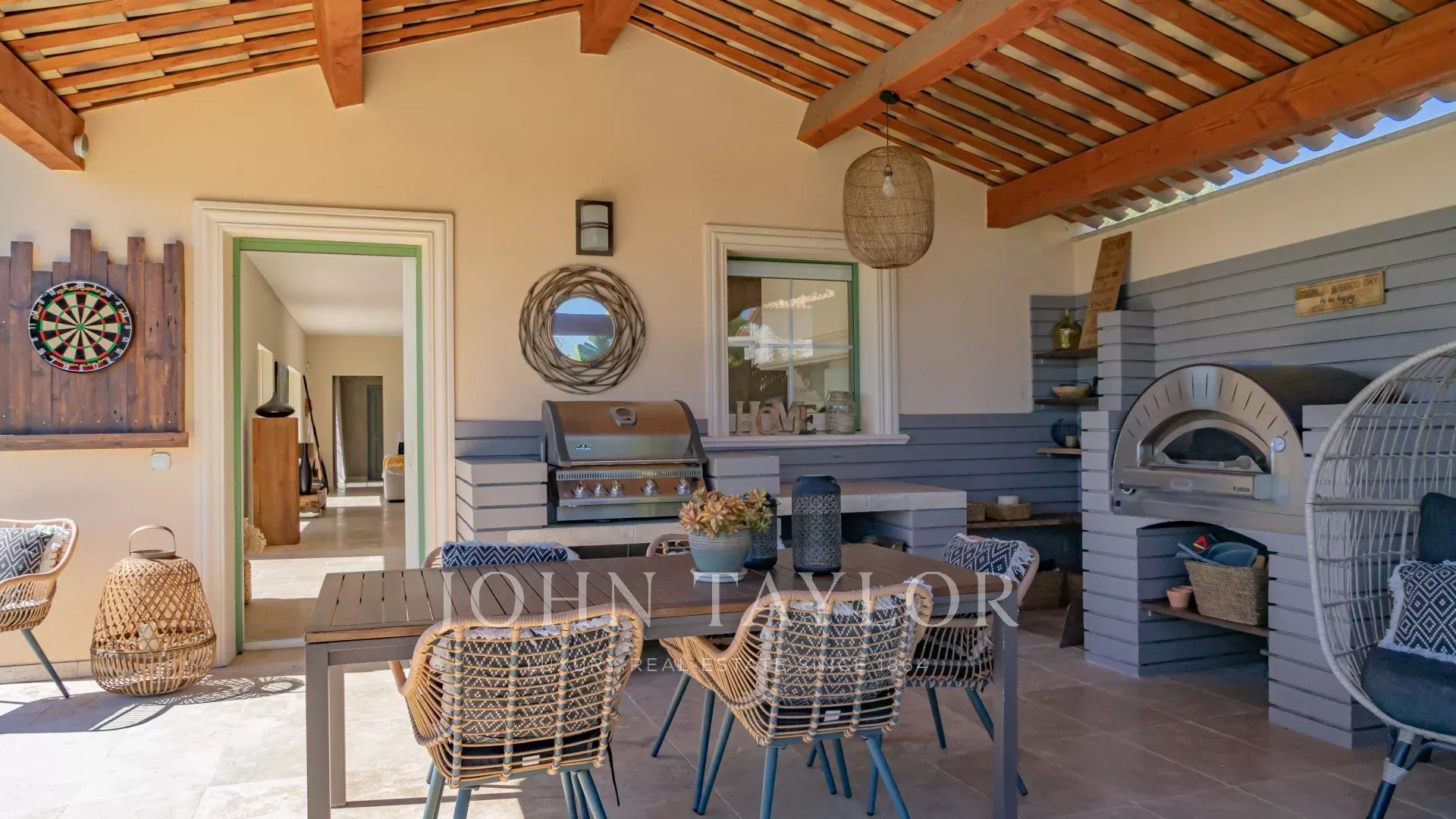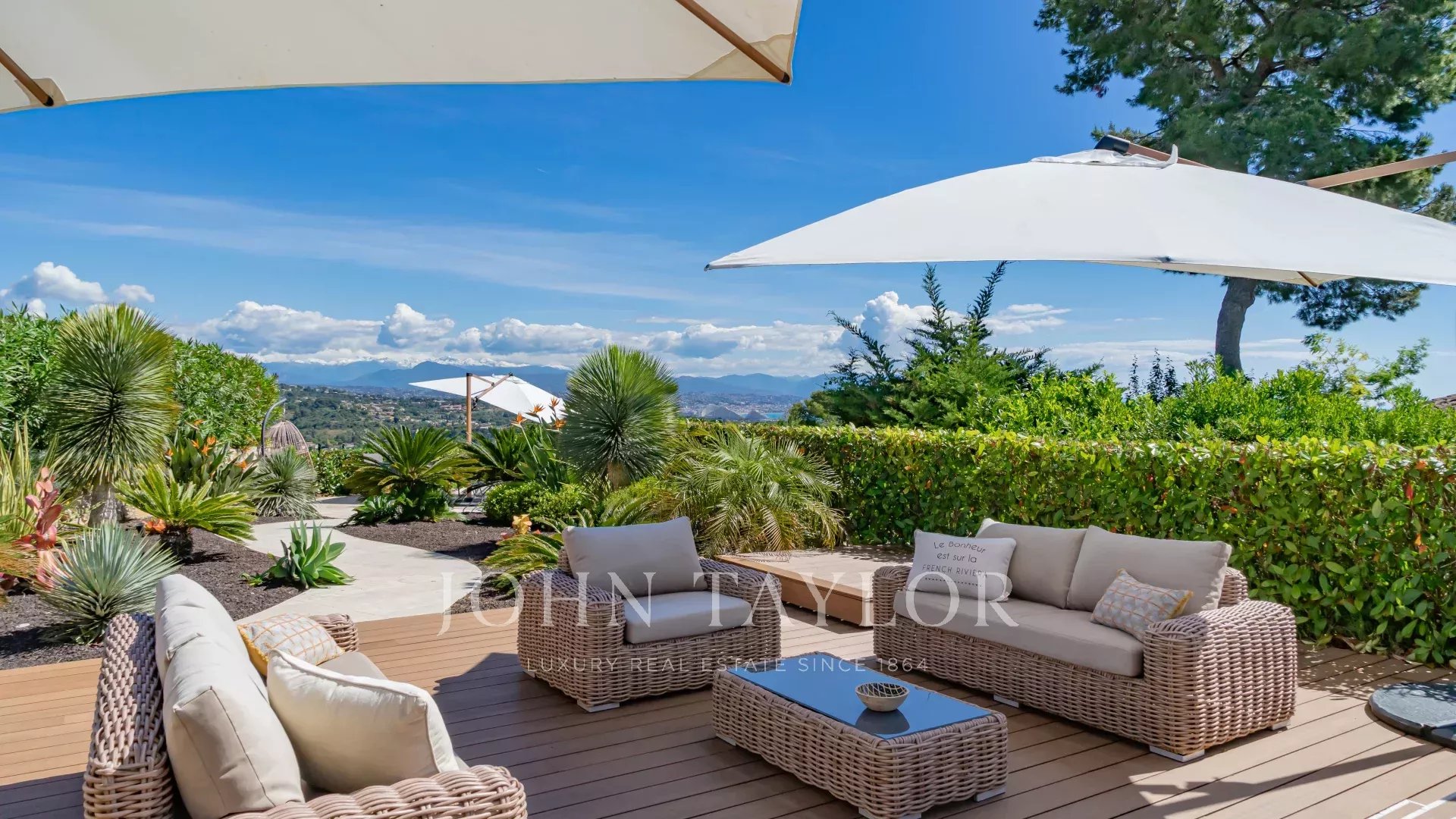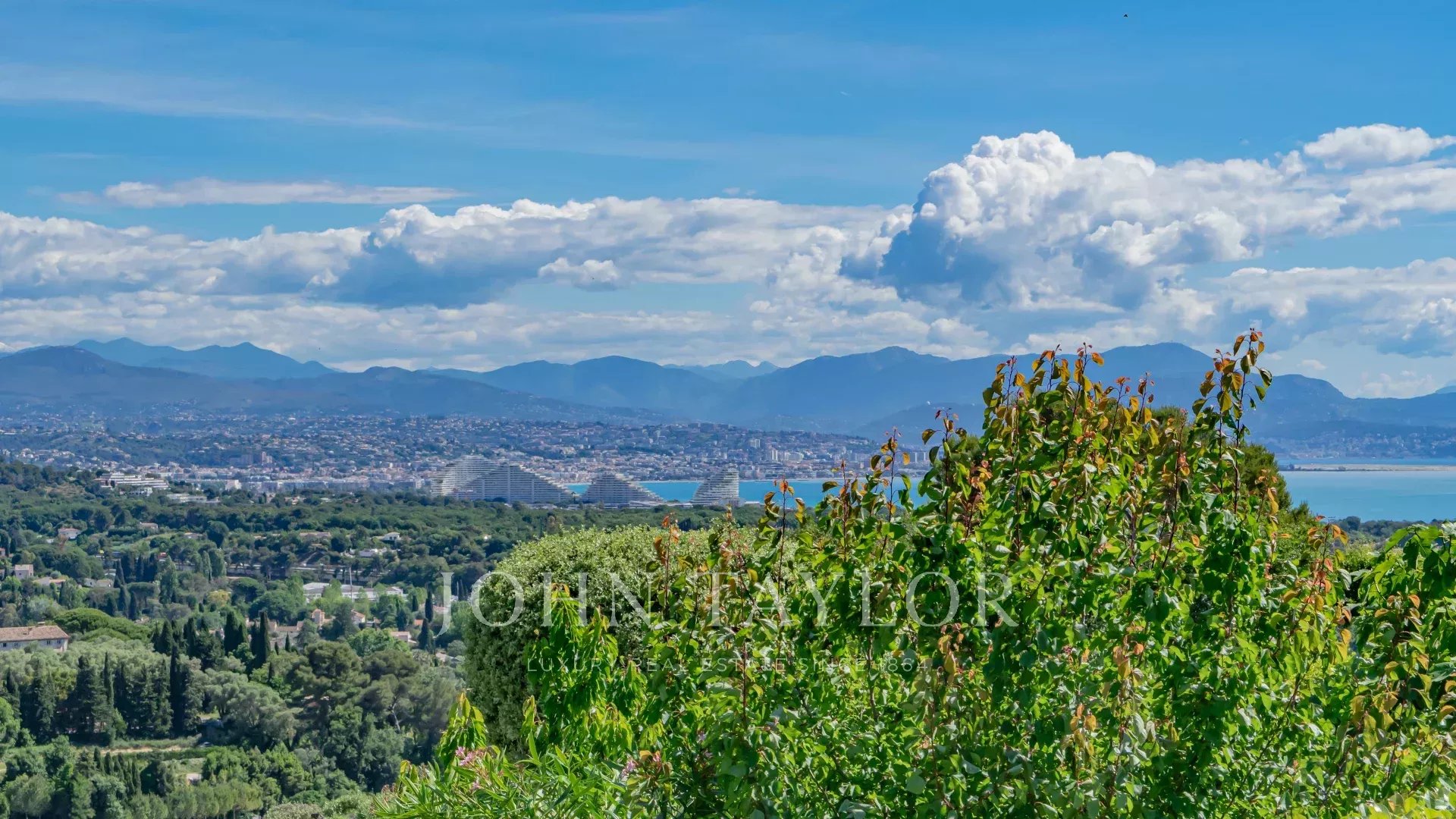 À l’extérieur : un jardin méditerranéen avec arrosage automatique, une vaste terrasse autour de la piscine (volet roulant), une seconde terrasse avec terrain de boules et une vue panoramique mer et montagnes. Un petit verger complète l’ensemble.