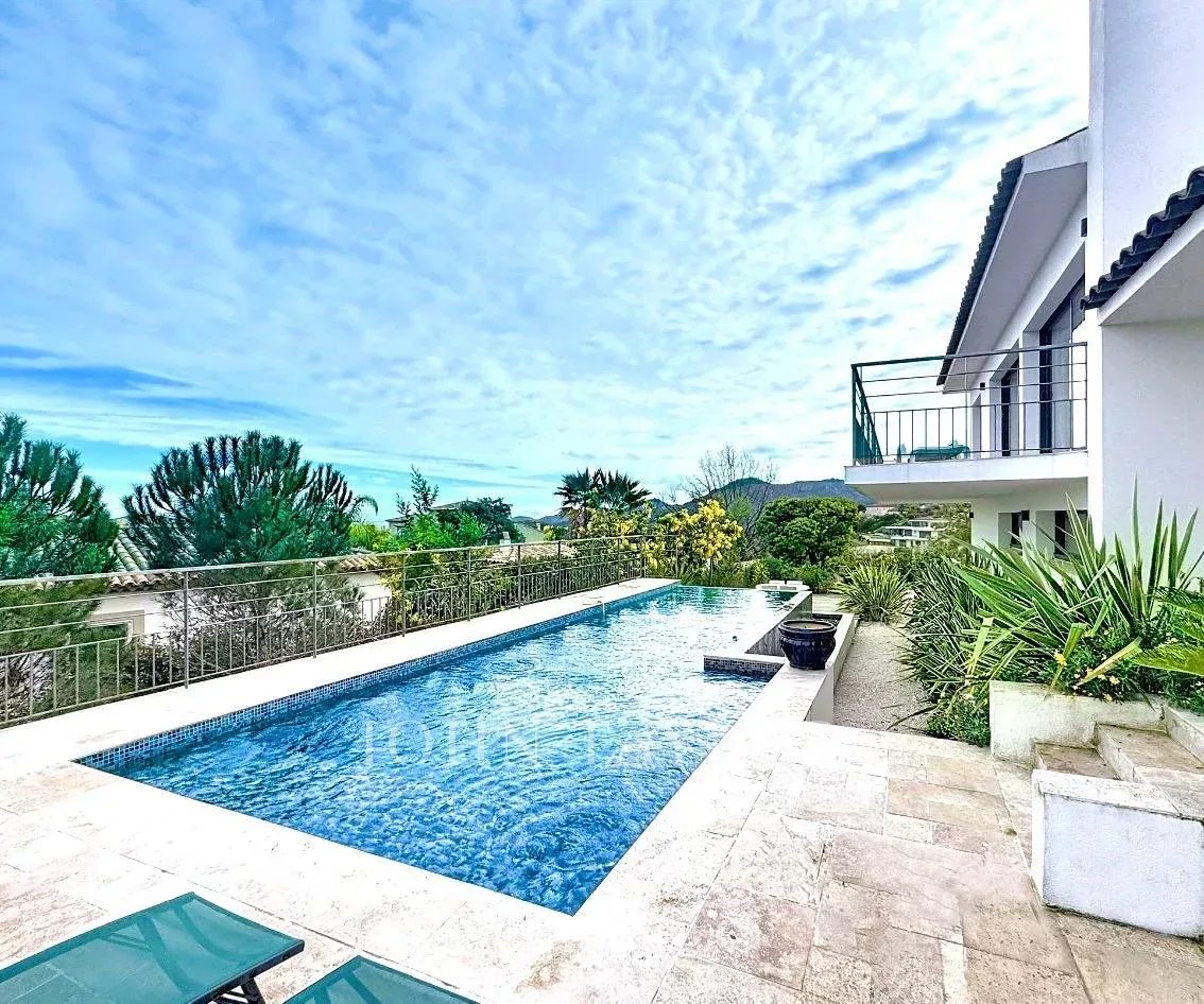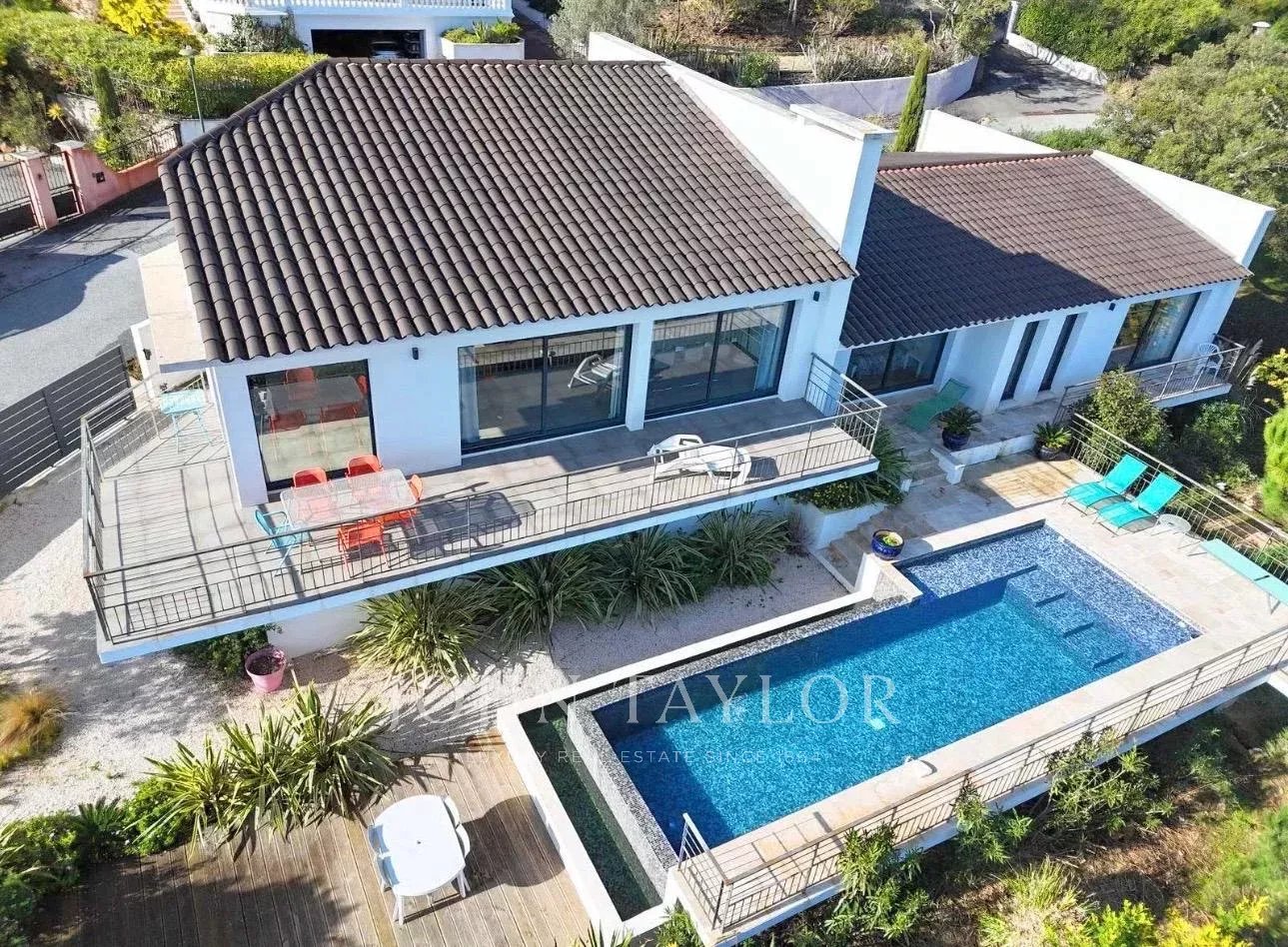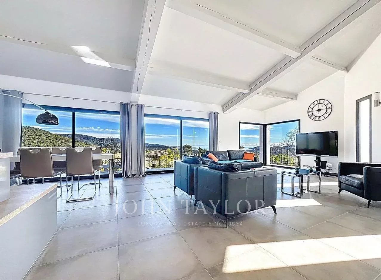 Située dans un domaine sécurisé aux Adrets-de-l’Estérel, cette maison contemporaine d’environ 180 m² habitables offre un séjour lumineux ouvrant sur une vaste terrasse exposée sud-est, une cuisine ouverte, quatre chambres, une salle de bains, une salle de douche, un bureau, une buanderie et deux toilettes, le tout bénéficiant d’une magnifique vue sur la mer.