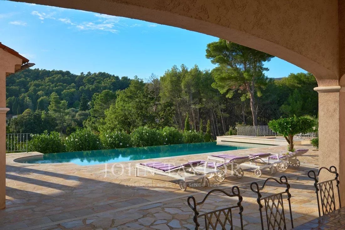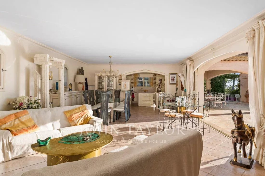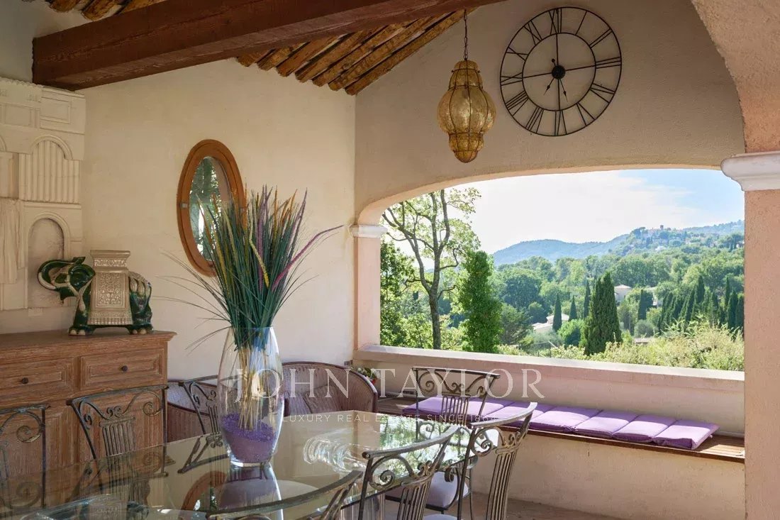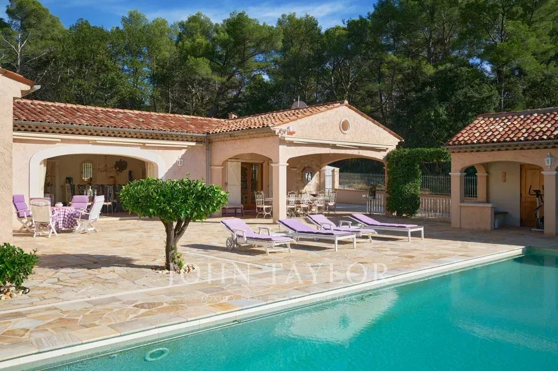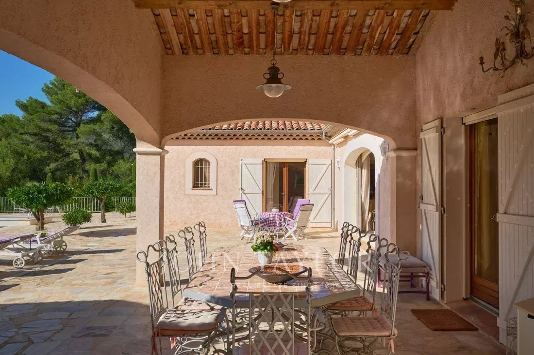 Le grand salon/salle à manger, ainsi que la jolie cuisine provençale, donnent accès par des portes coulissantes sur une immense terrasse partiellement couverte, ainsi qu'à une grande piscine avec son pool-house entièrement équipé.