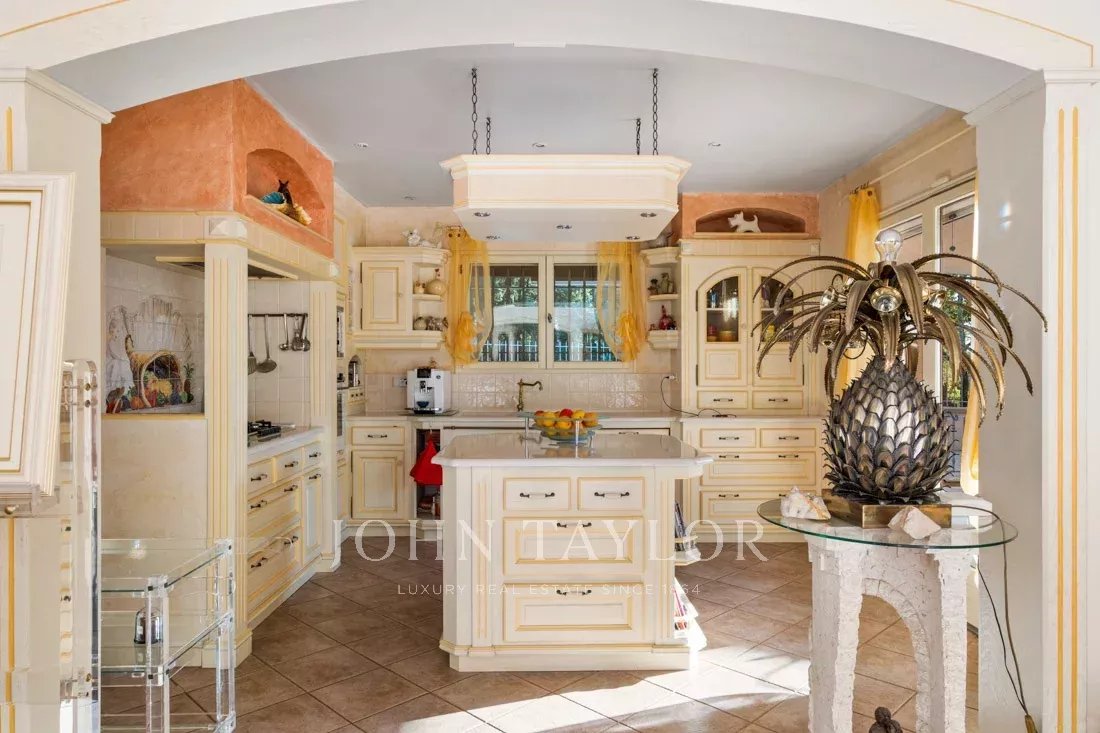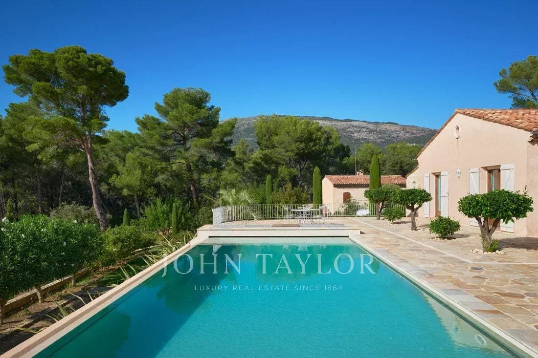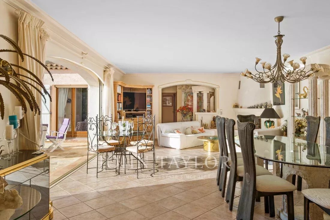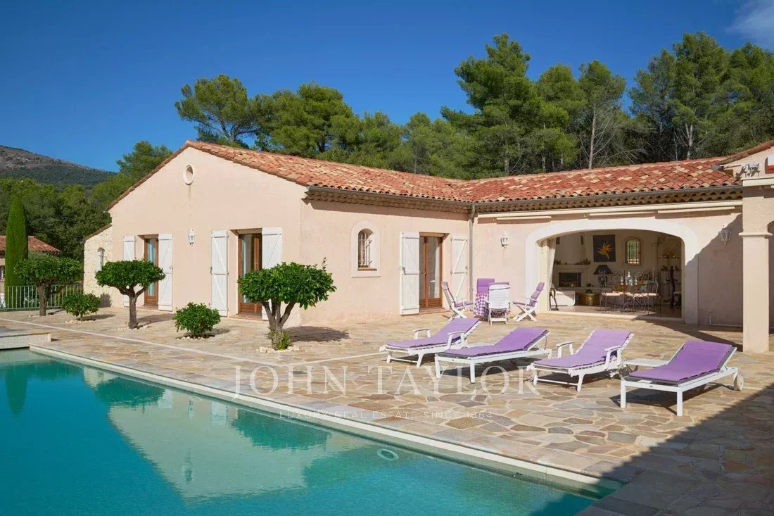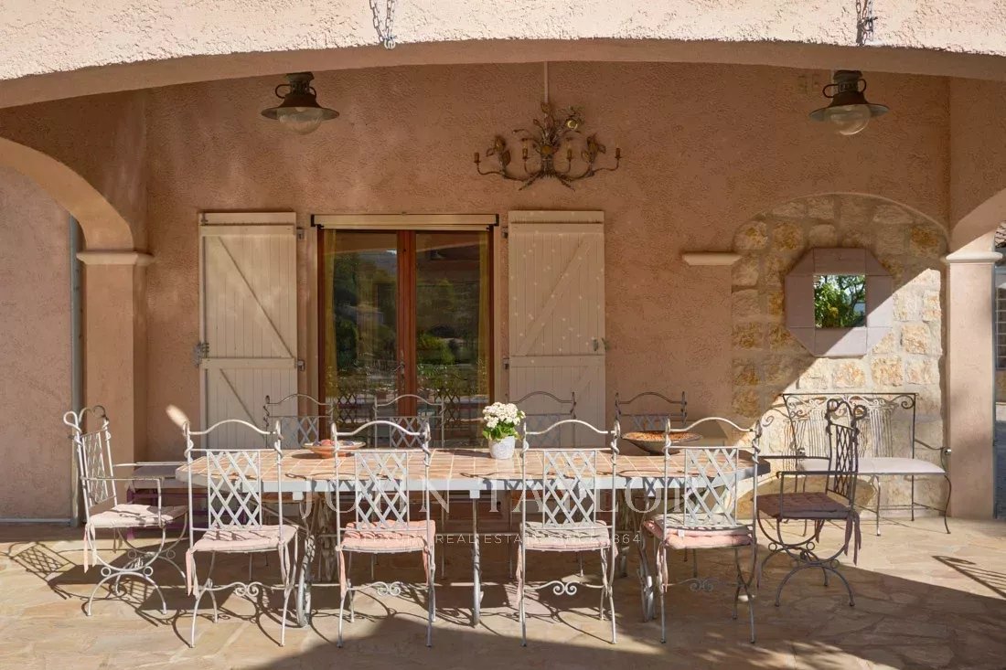Le grand salon/salle à manger, ainsi que la jolie cuisine provençale, donnent accès par des portes coulissantes sur une immense terrasse partiellement couverte, ainsi qu'à une grande piscine avec son pool-house entièrement équipé.