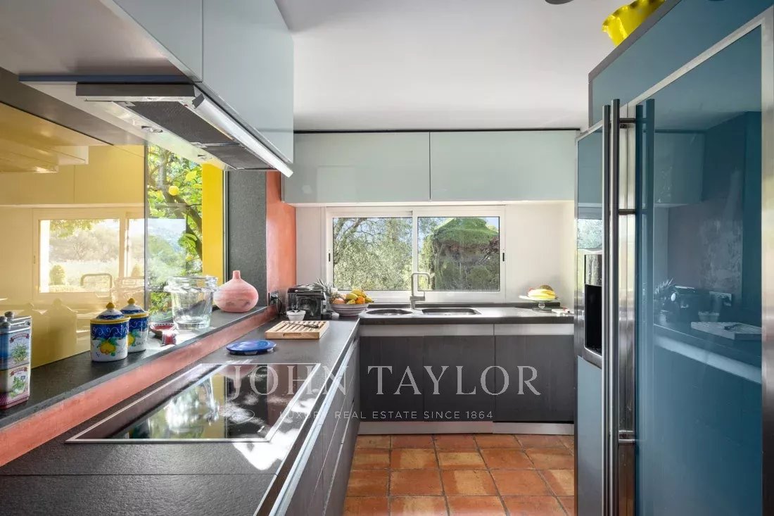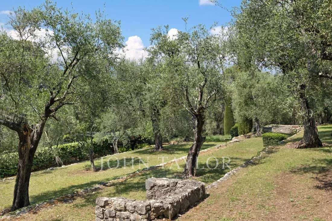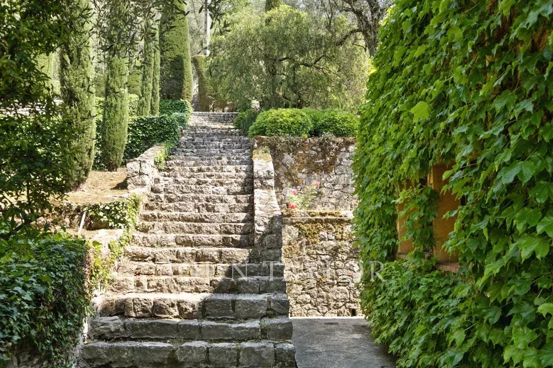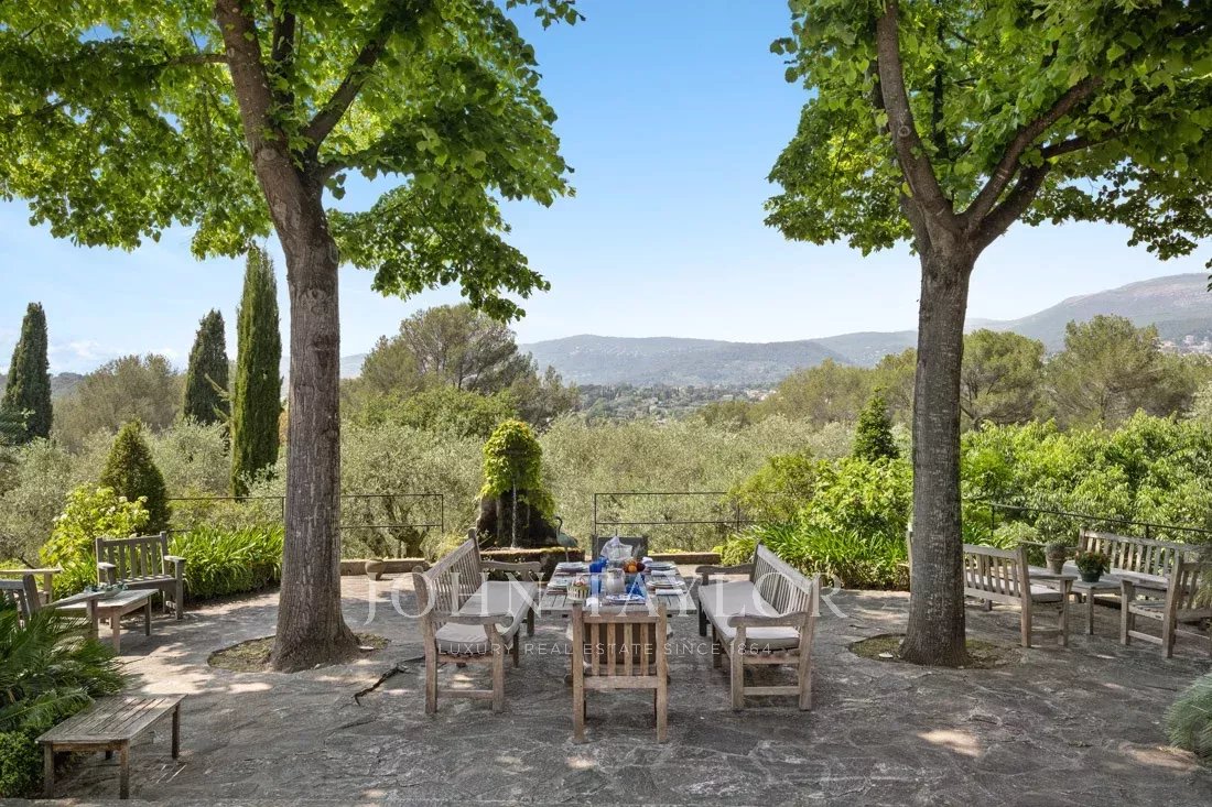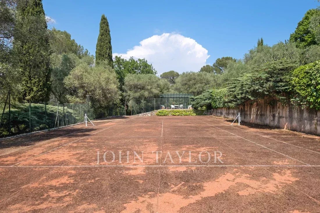 Cette propriété de 1,6 hectare avec ses magnifiques plantes méditerranéennes, de nombreuses terrasses, des fontaines d'eau et un court de tennis offre une vue panoramique sur les collines environnantes et apporte une sérénité absolue.