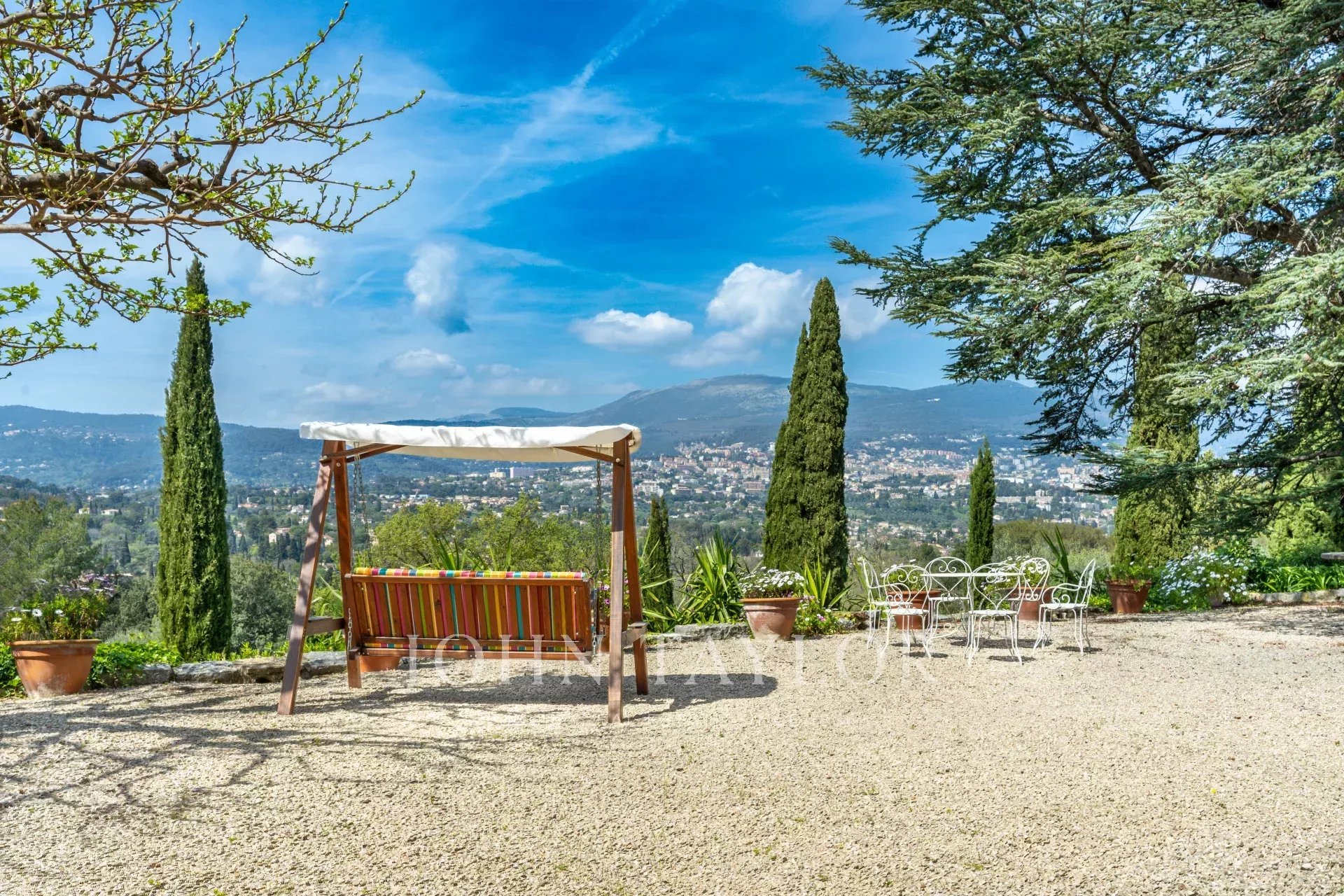 Exposée sud-ouest, la propriété offre une vue époustouflante sur la campagne grassoise, avec un aperçu mer.