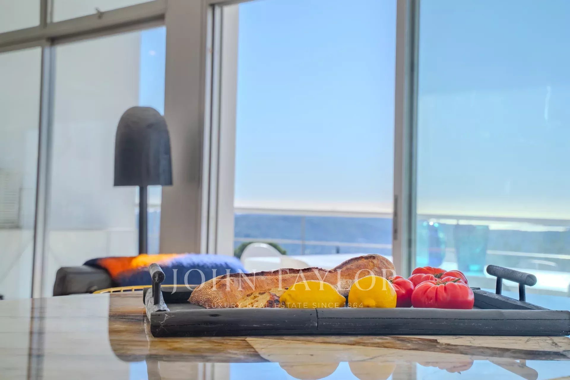 Le niveau principal propose une entrée, une cuisine américaine neuve, une salle à manger ouverte par de larges baies vitrées sur une superbe terrasse avec vue panoramique jusqu’à la baie de Mandelieu, un salon lumineux avec cheminée contemporaine, ainsi qu’un salon TV.