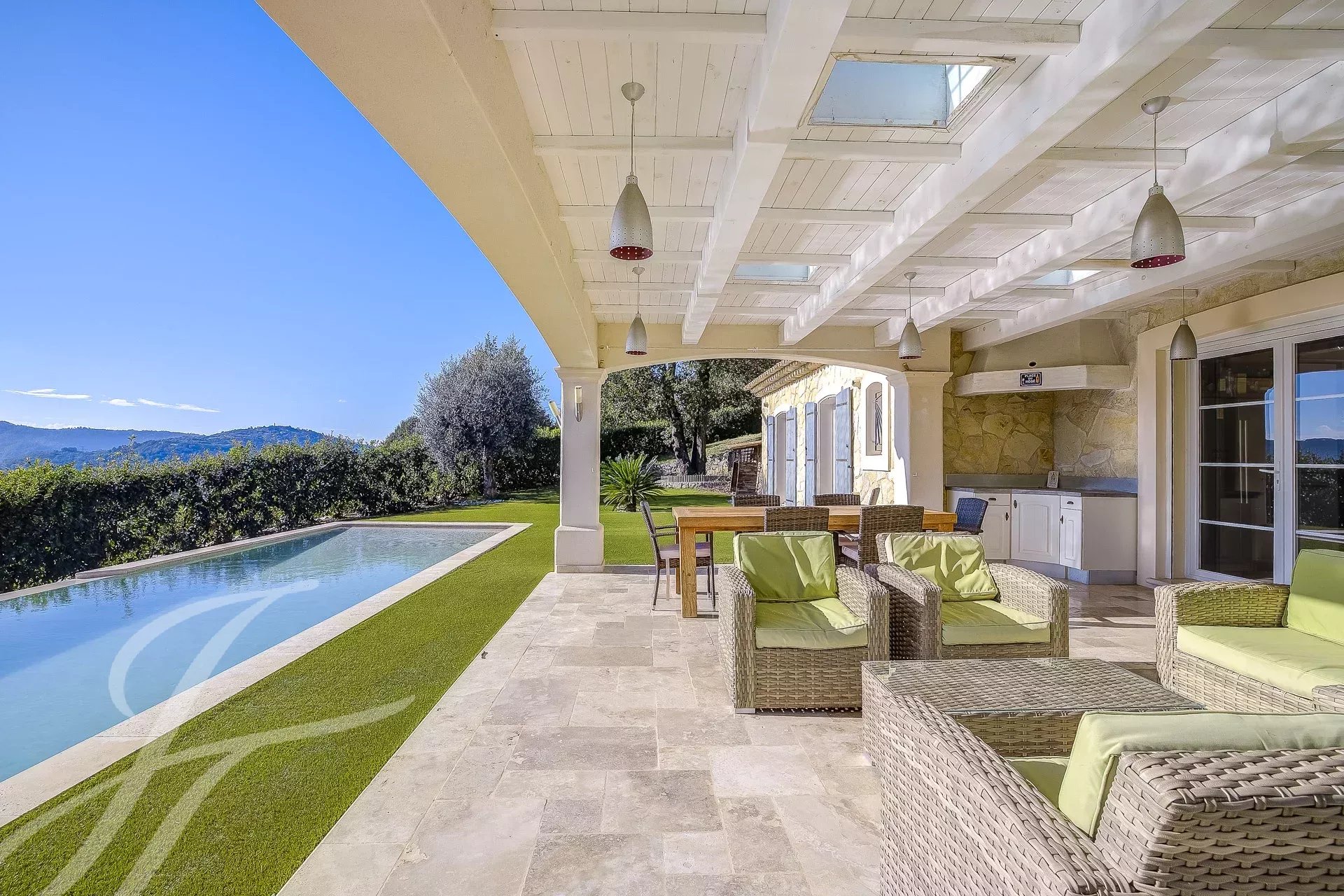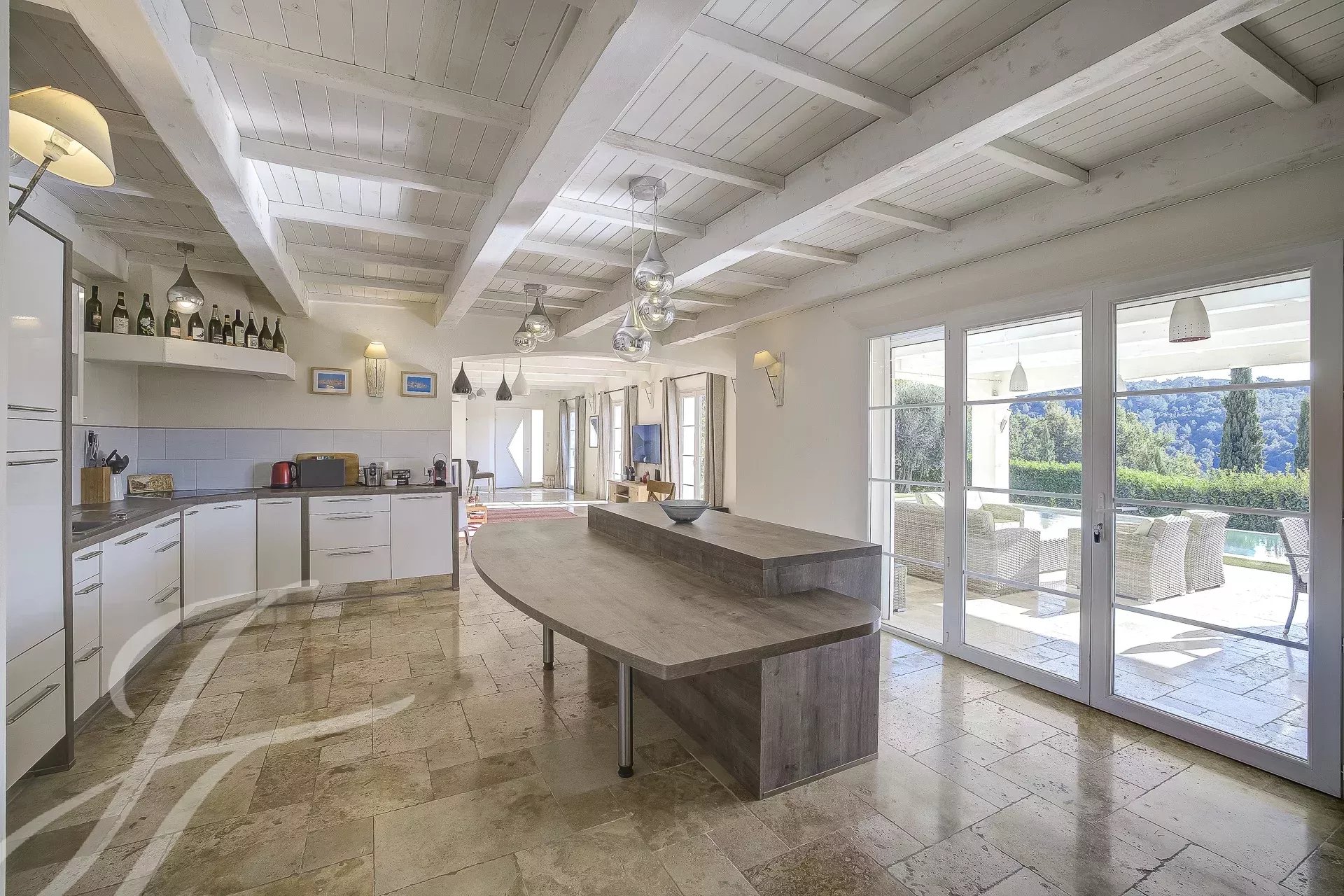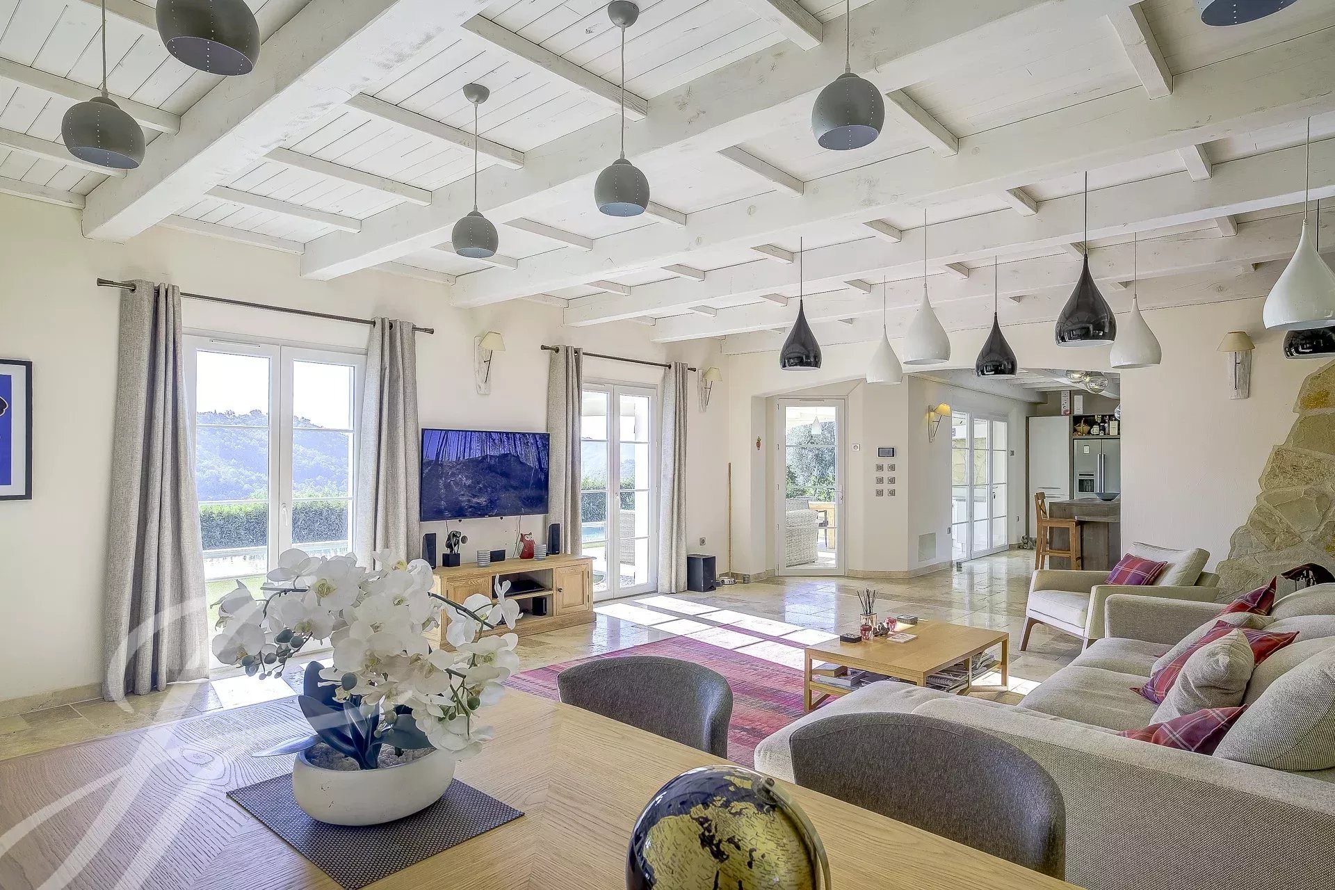 La pièce de vie, spacieuse et ouverte, donne directement sur l'espace extérieur et la piscine, d'où l'on peut admirer les magnifiques paysages de la région.