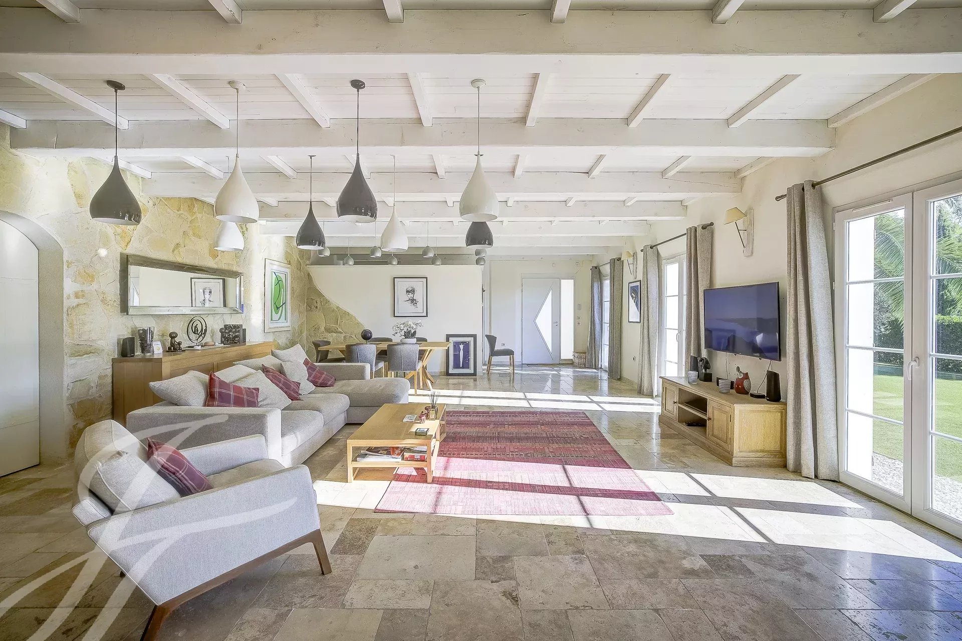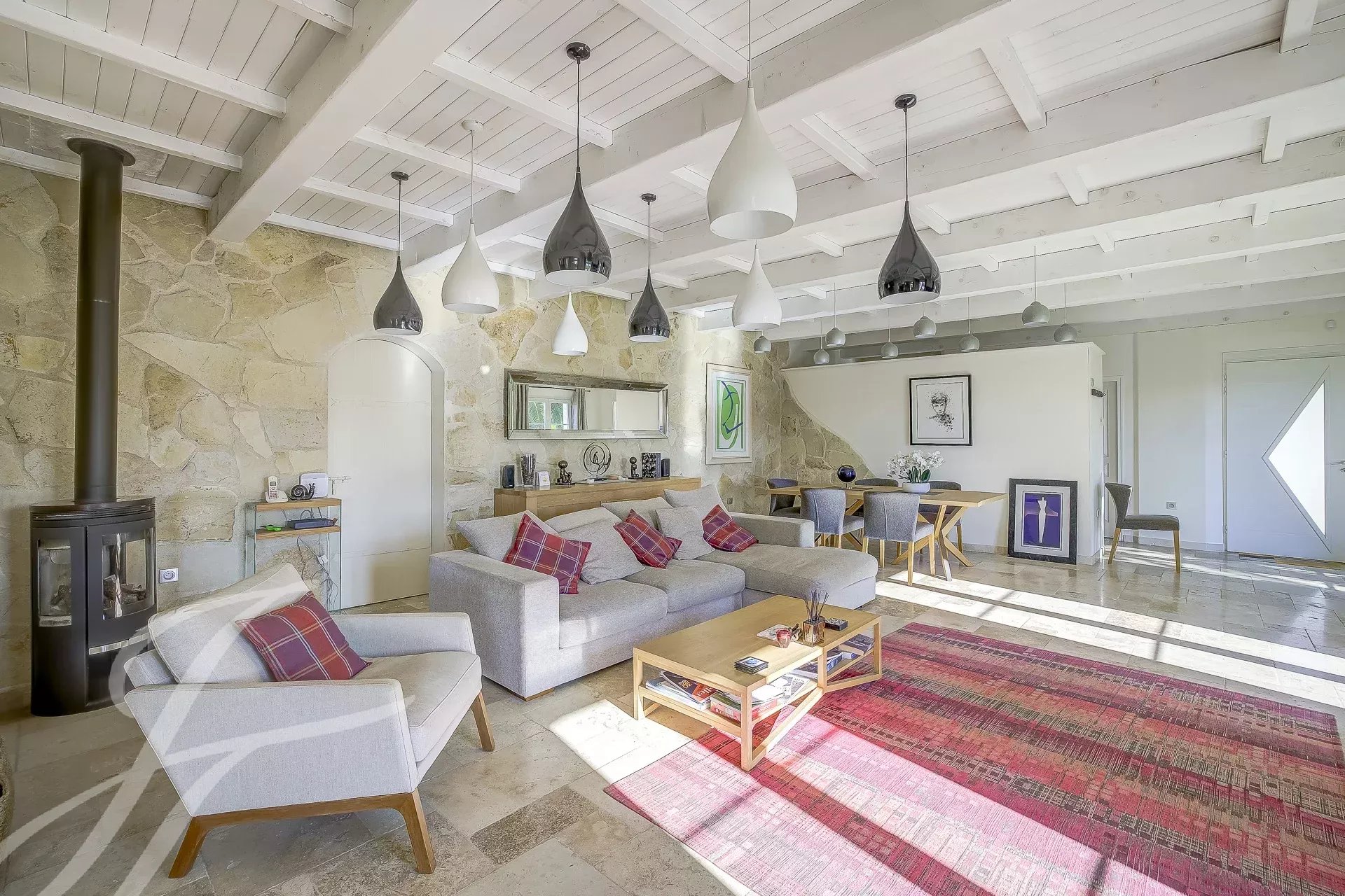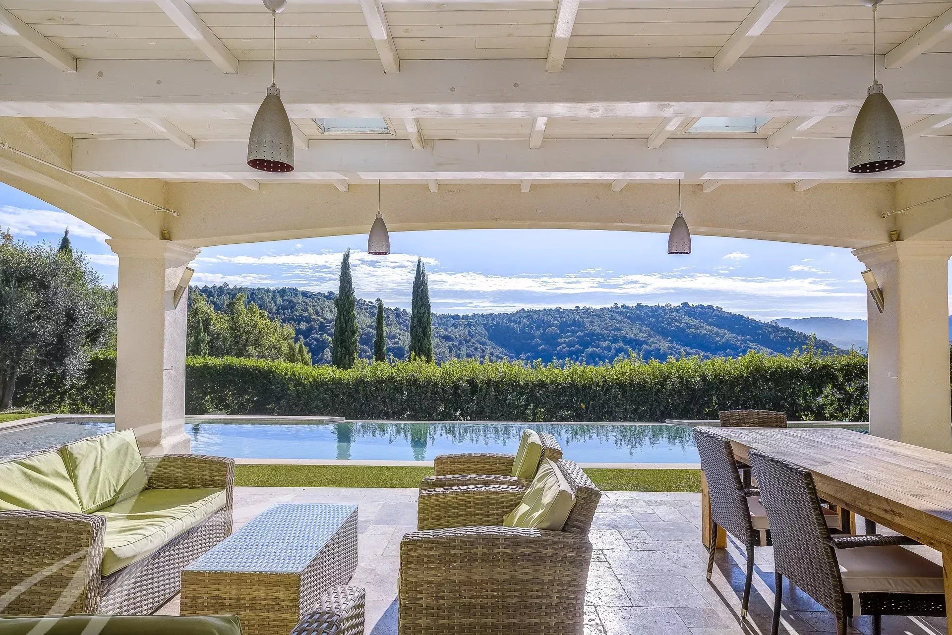 La pièce de vie, spacieuse et ouverte, donne directement sur l'espace extérieur et la piscine, d'où l'on peut admirer les magnifiques paysages de la région.