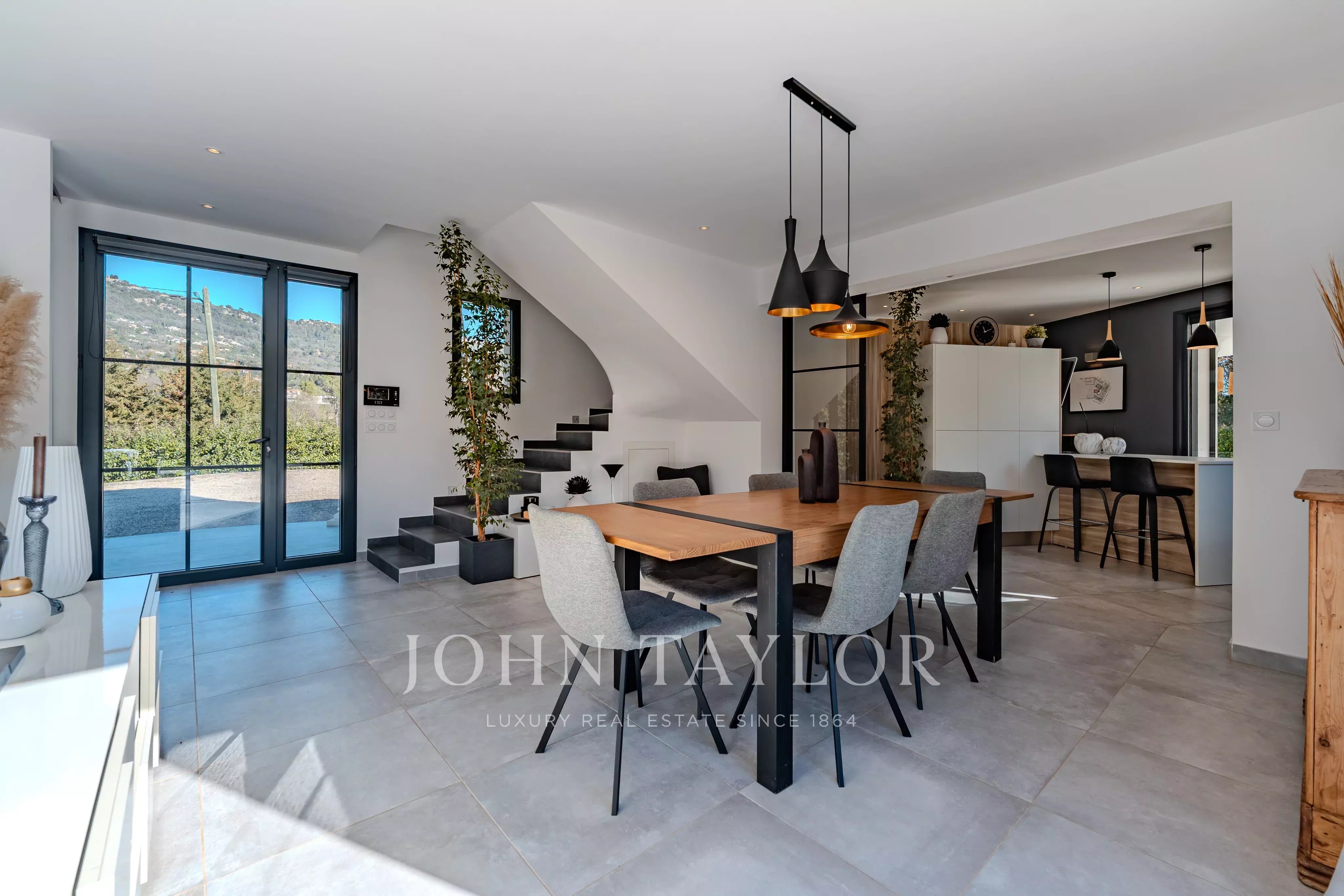 Construite en 2018, la maison développe environ 180 m² et propose un vaste séjour lumineux avec baies vitrées à galandage, insert, cuisine ouverte équipée, une chambre et une salle d’eau en rez-de-chaussée.